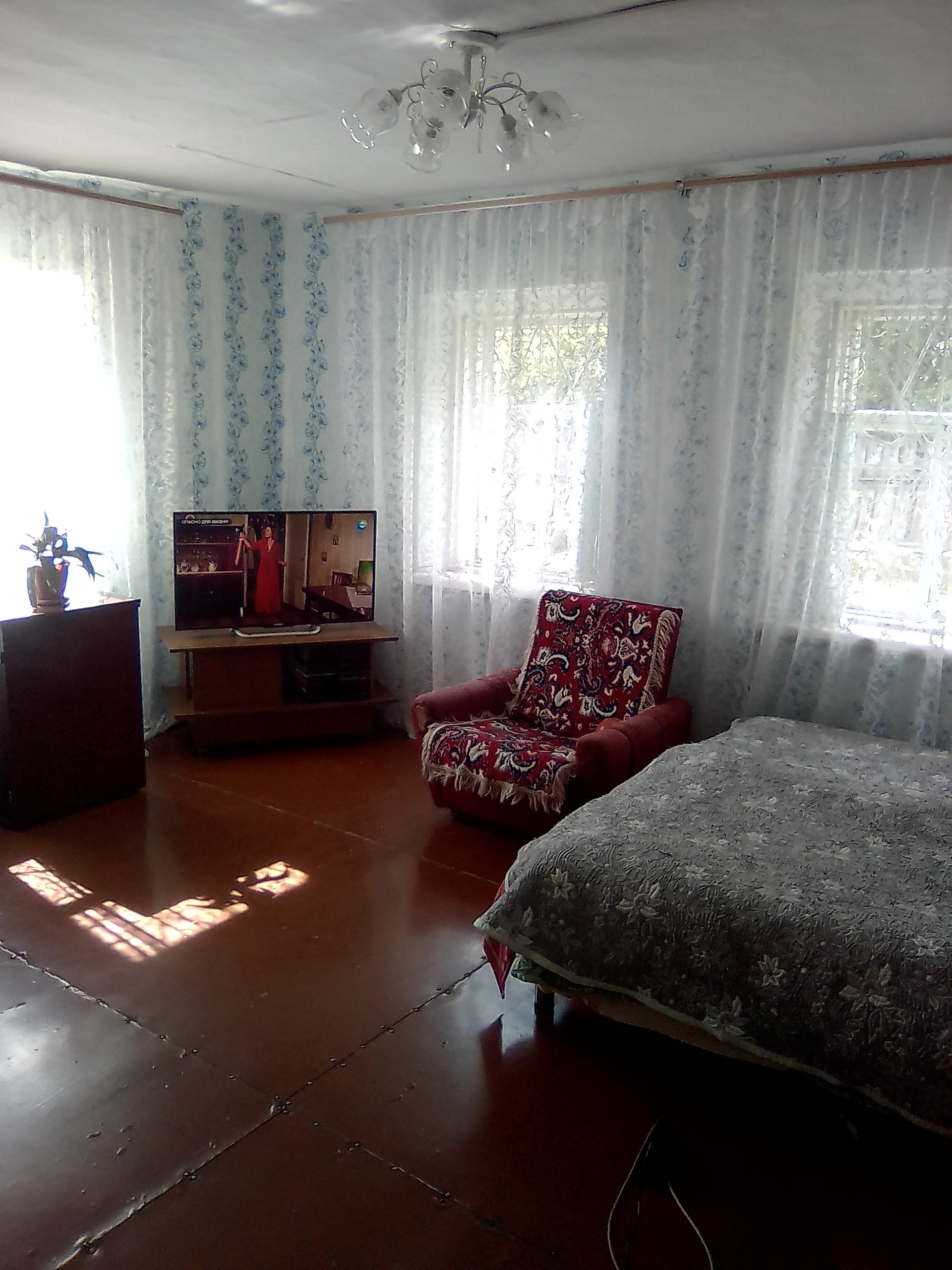 В доме зал, комната и кухня, печное отопление, вода, слив, рядом остановка, магазин, школа, детский сад.