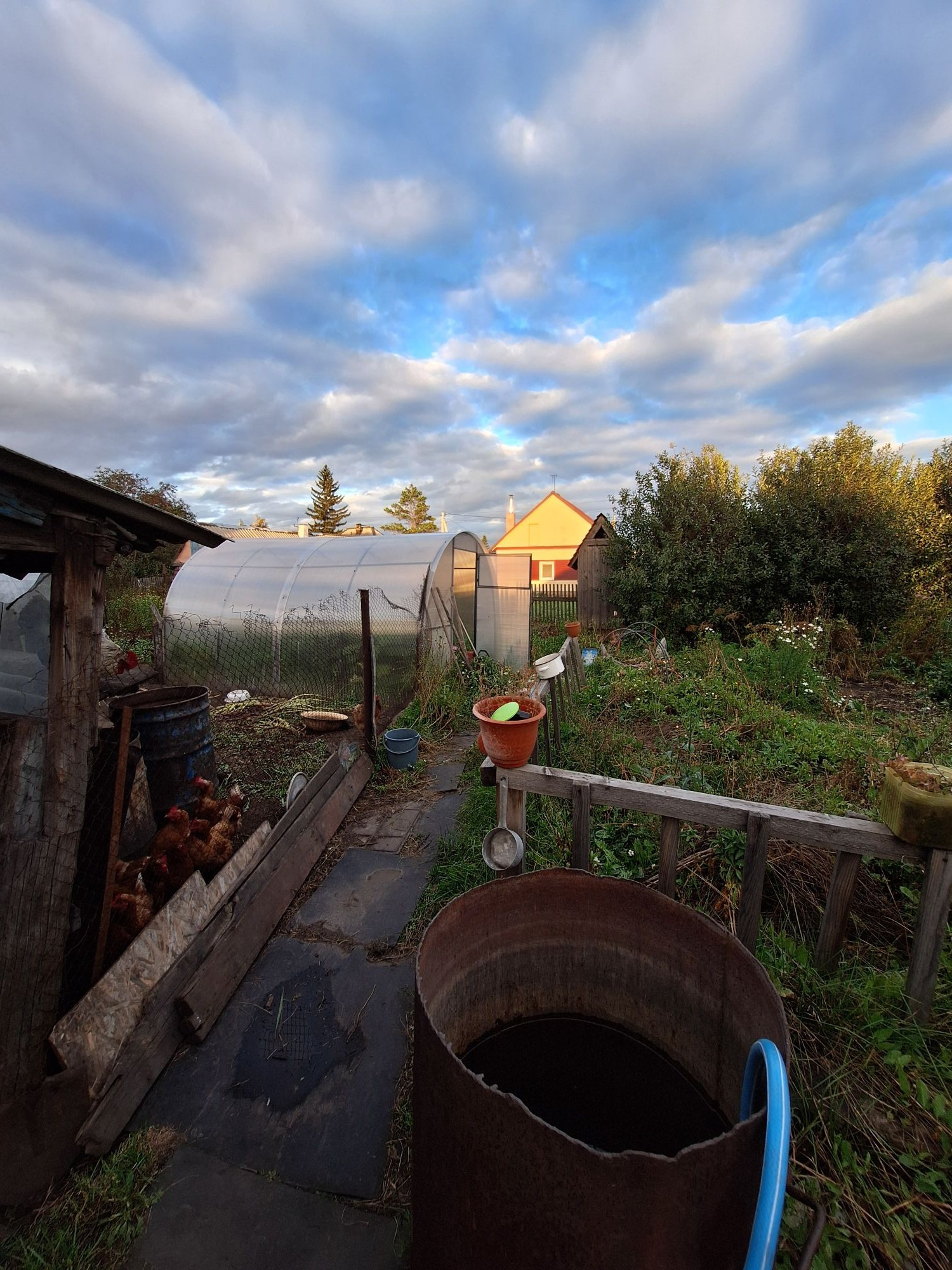 На участке гараж, баня, действующий курятник (дворовые постройки требуют ремонта, но действующие). В огороде теплица, в этом году поменяли поликарбонат. Уличный туалет в отличном состоянии. Вывоз мусора осуществляется из индивидуального бака 240л объемом.