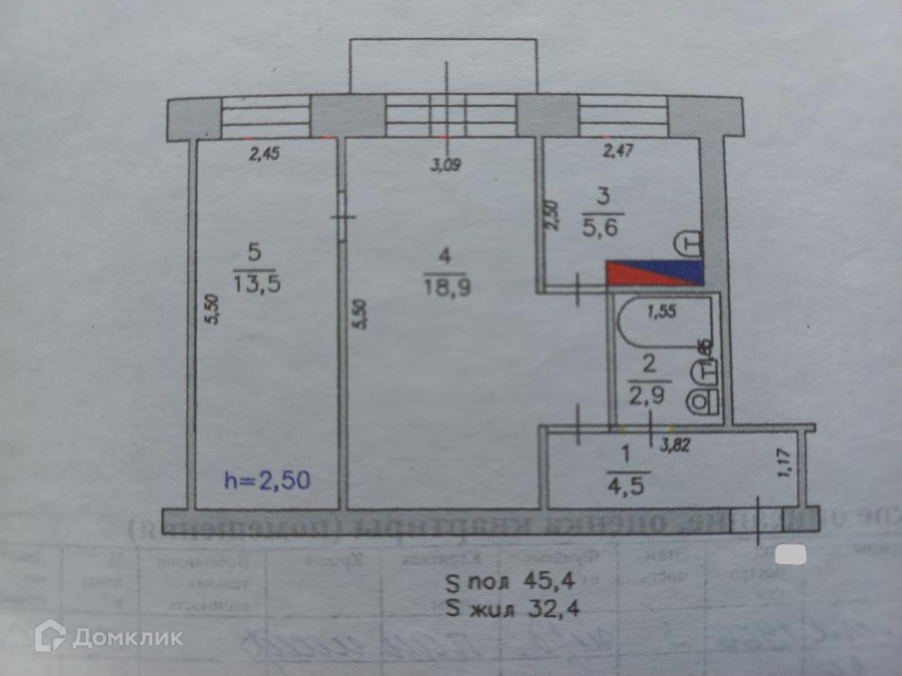 Общая площадь 45.4 м2