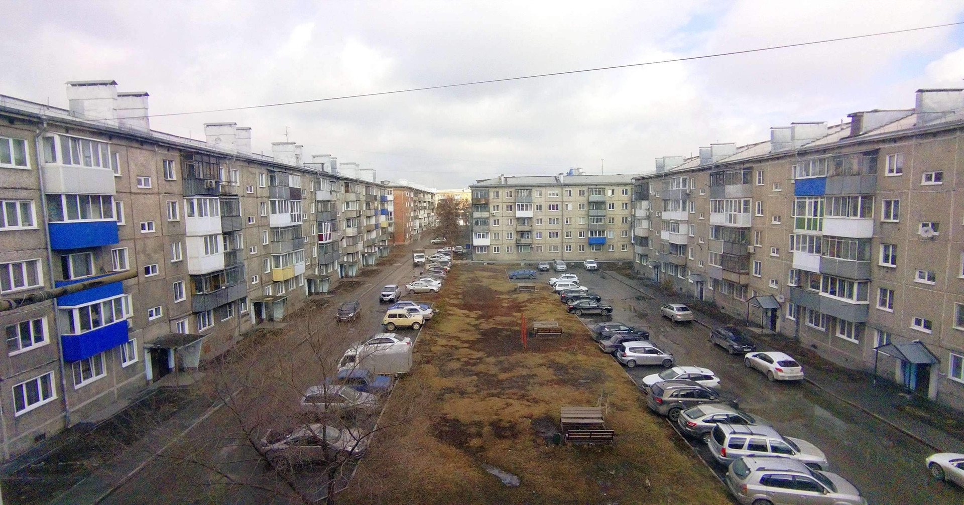 Балкон застеклён с видом спокойствия и уюта(особенно в период сезонов, когда ухожены клумбы и все дворовые посадки),