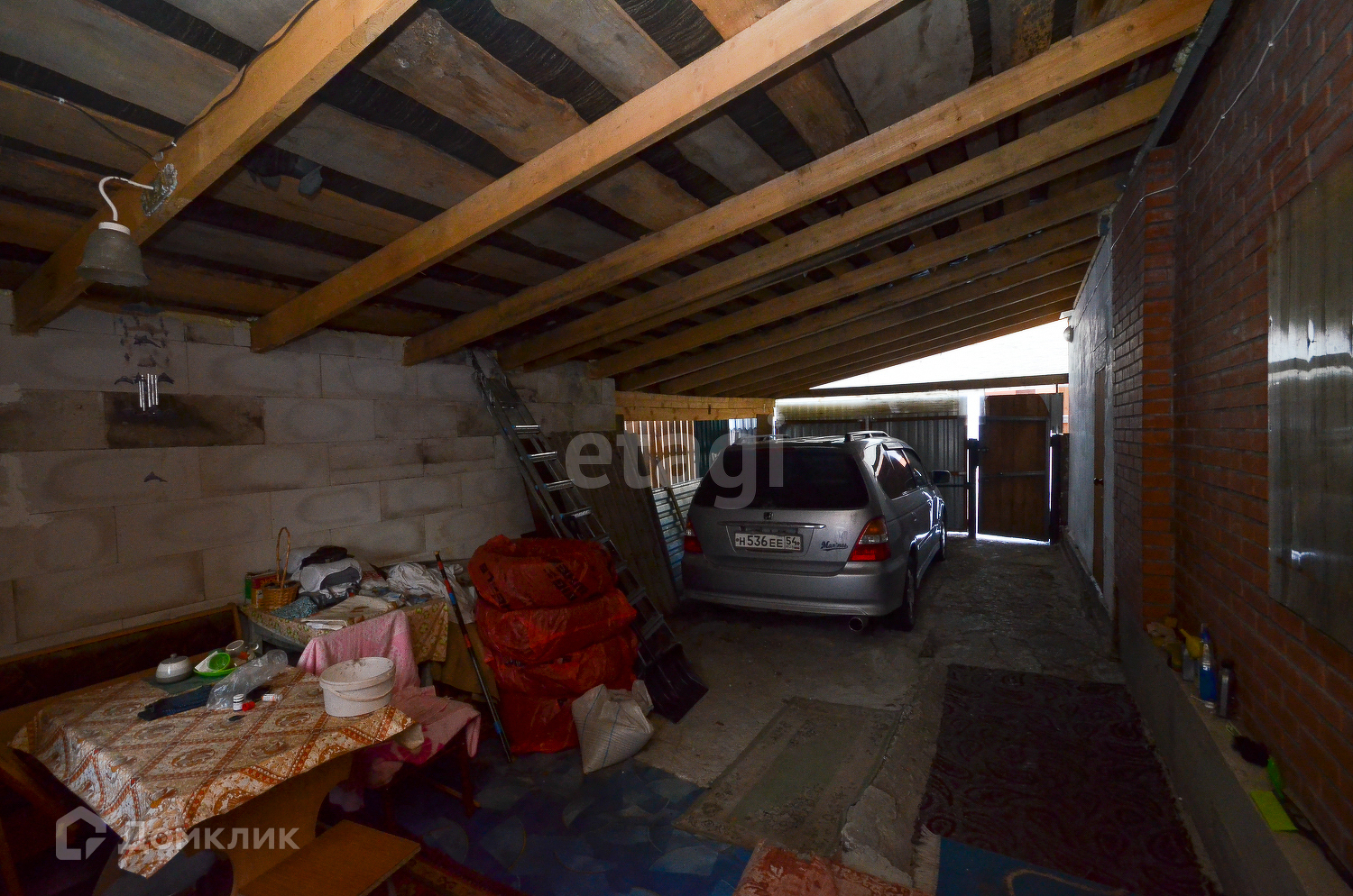 * огромный навес для машины, который при желании легко переоборудовать в гараж (две стены уже возведены из газобетона),
