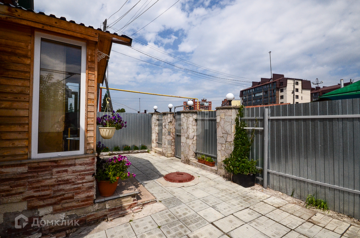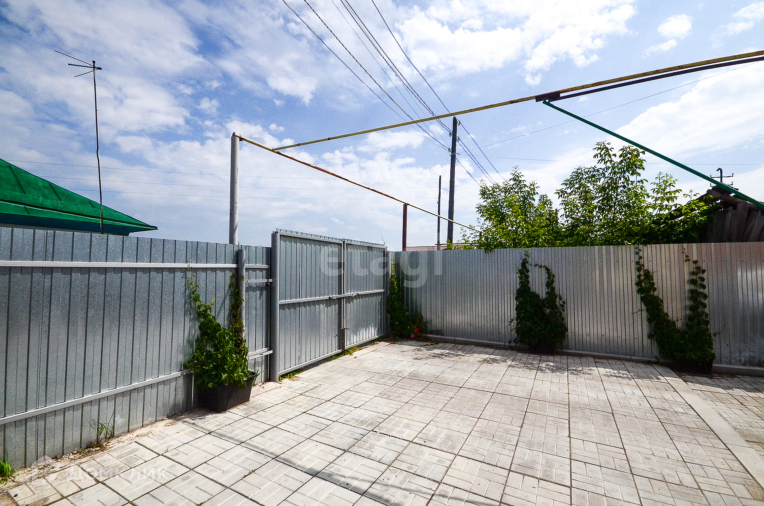 Передний двор вымощен тротуарной плиткой, на нем располагаются цветники. Парковка вмещает 3 легковых автомобиля на территории и 2 места перед забором.