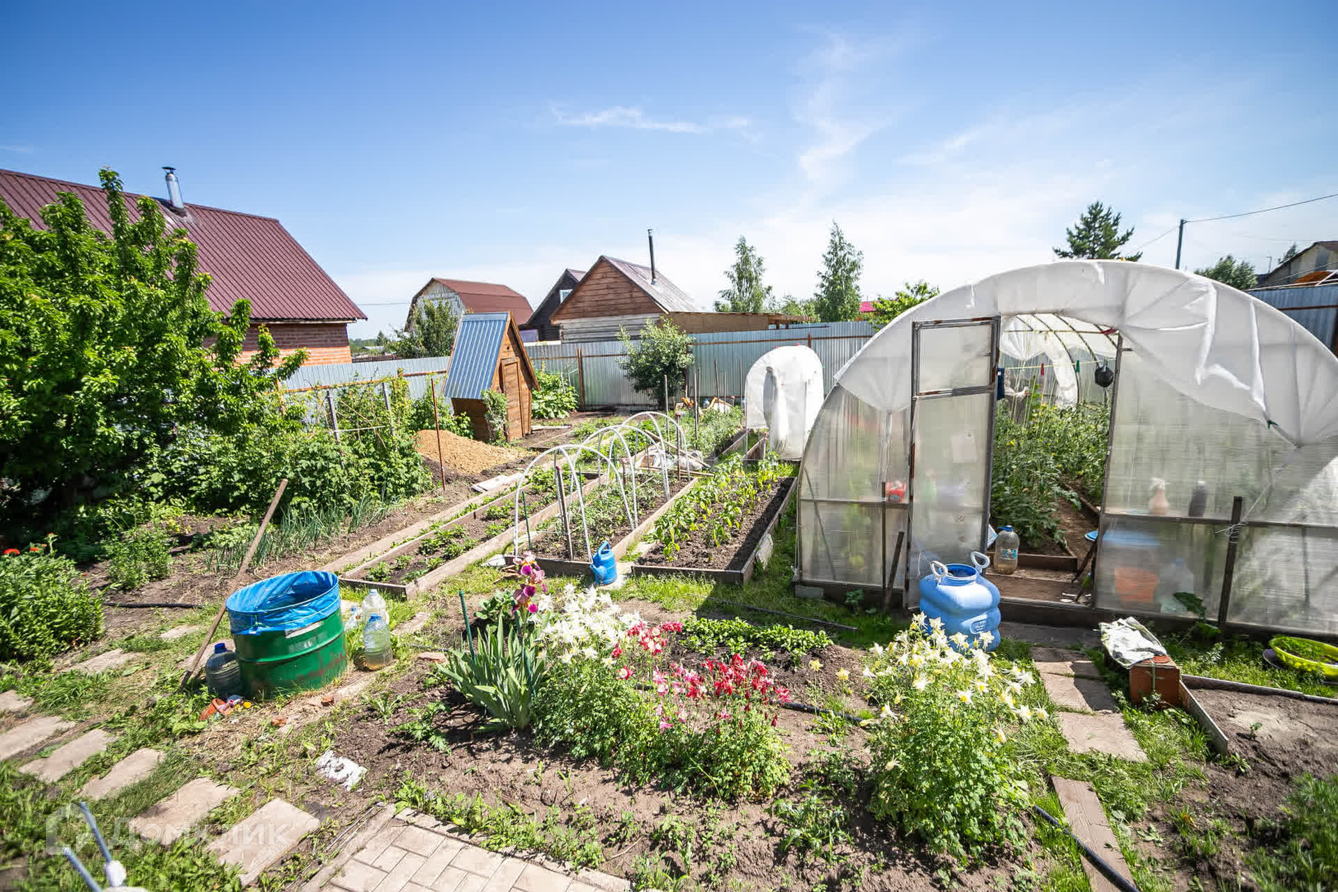 Участок ухоженный,имеется газон + зона для ведения огородных дел с посадками сливы, облепихи, малины. клубники.