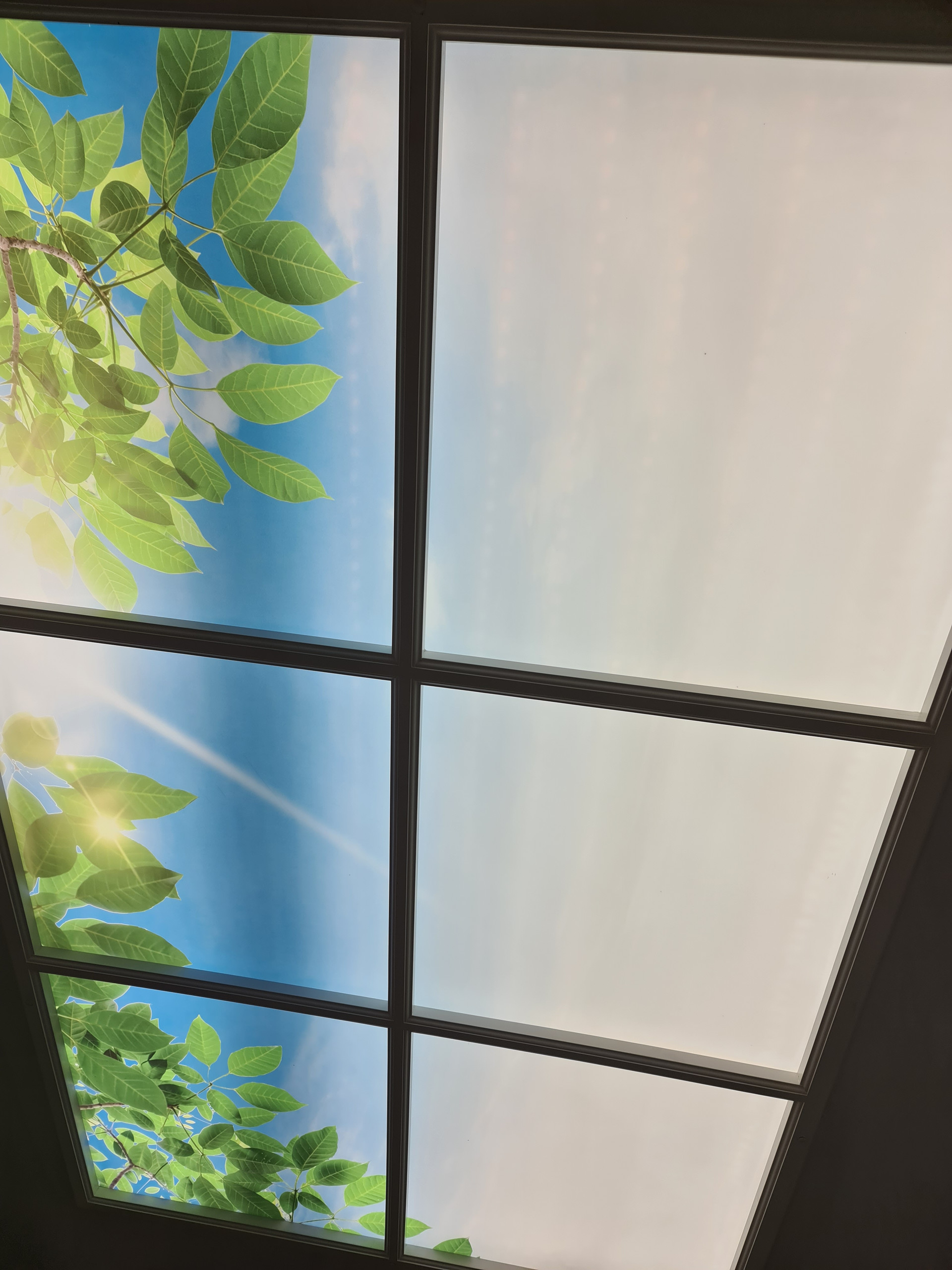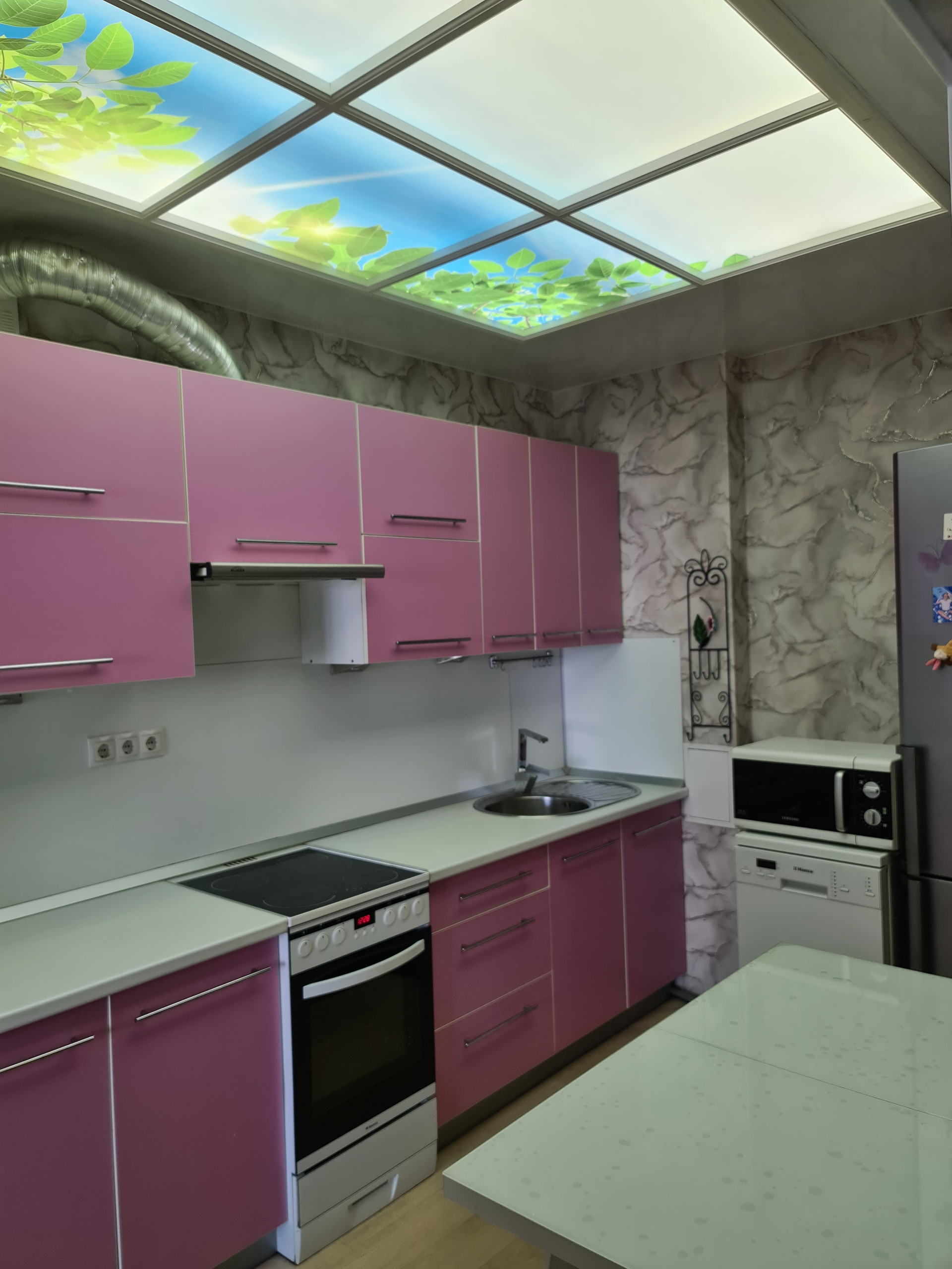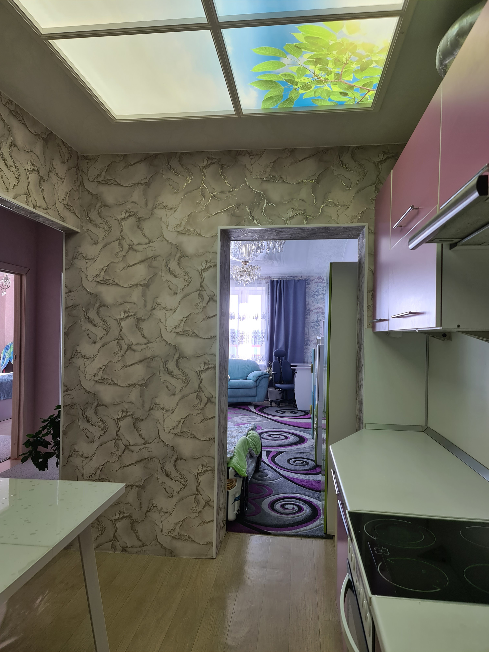 В кухне на потолке выполнено фальш-окно.