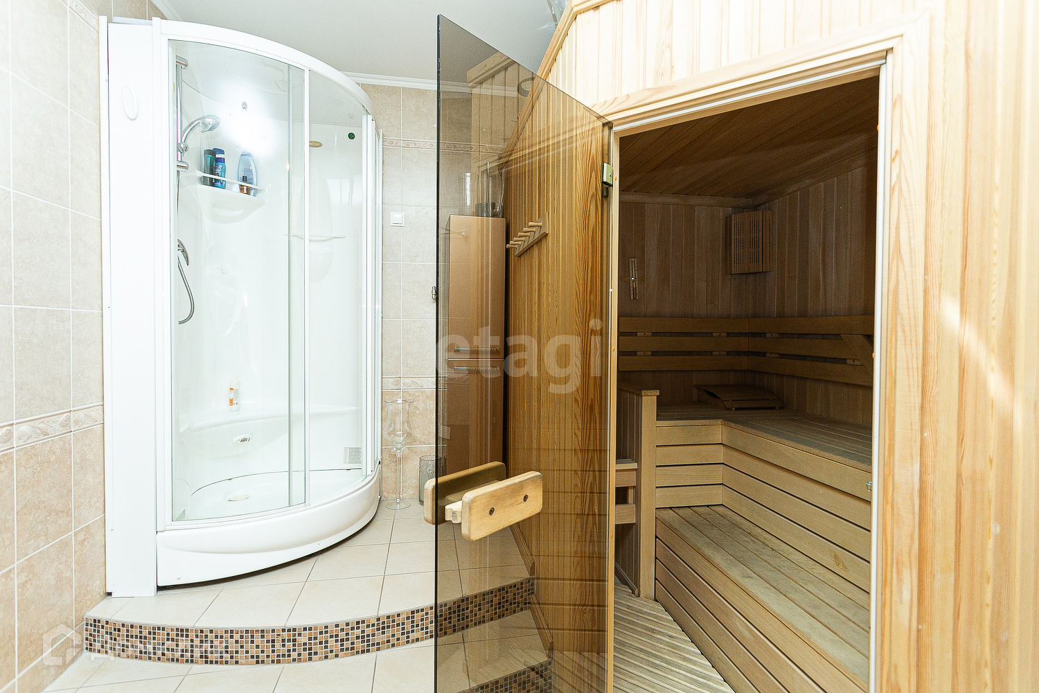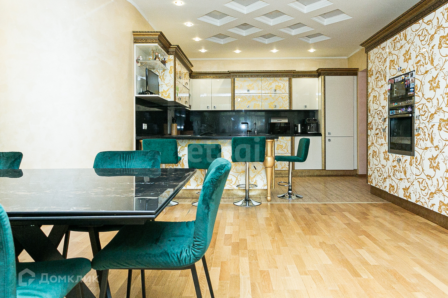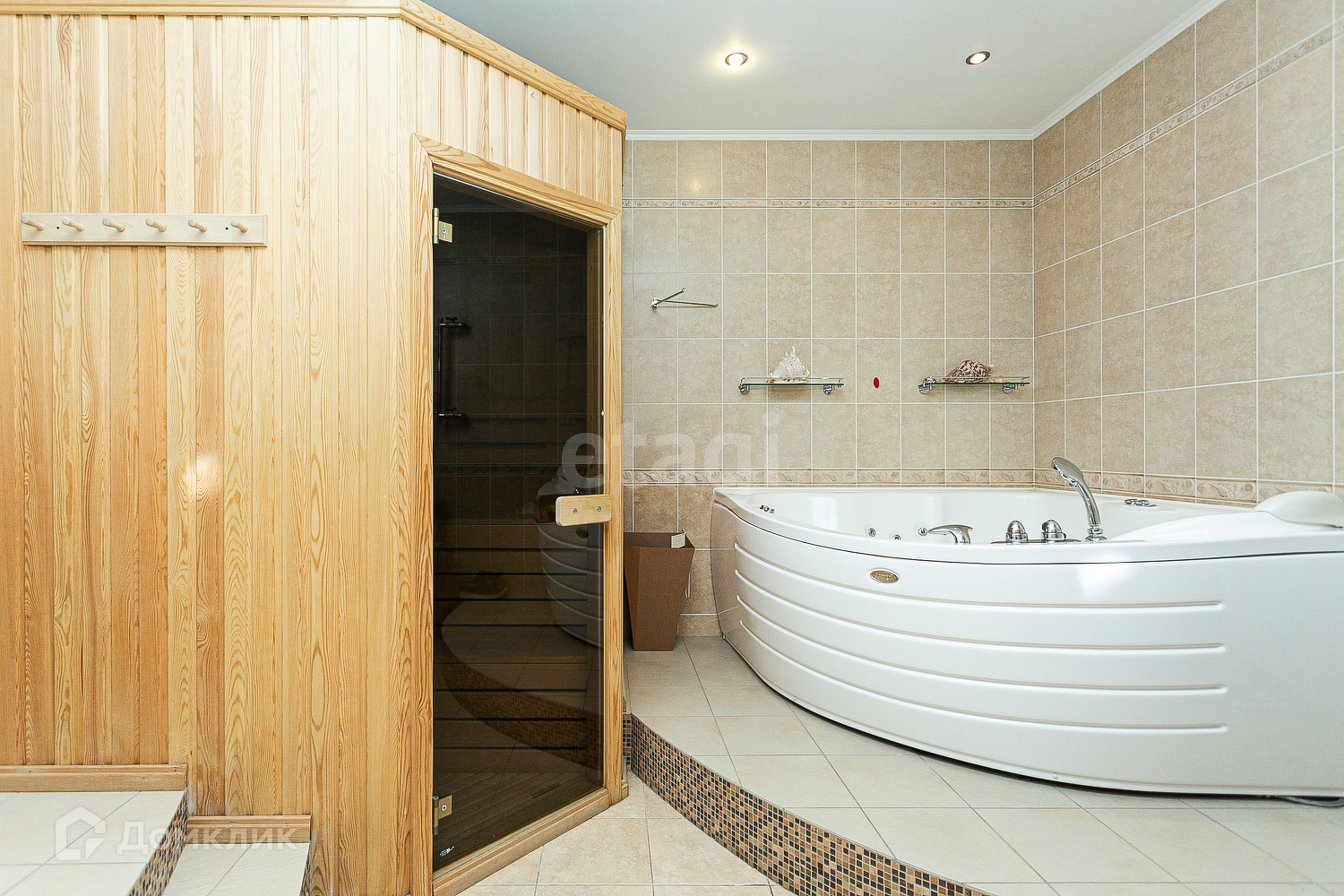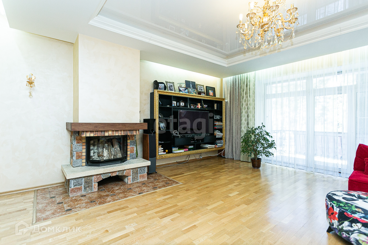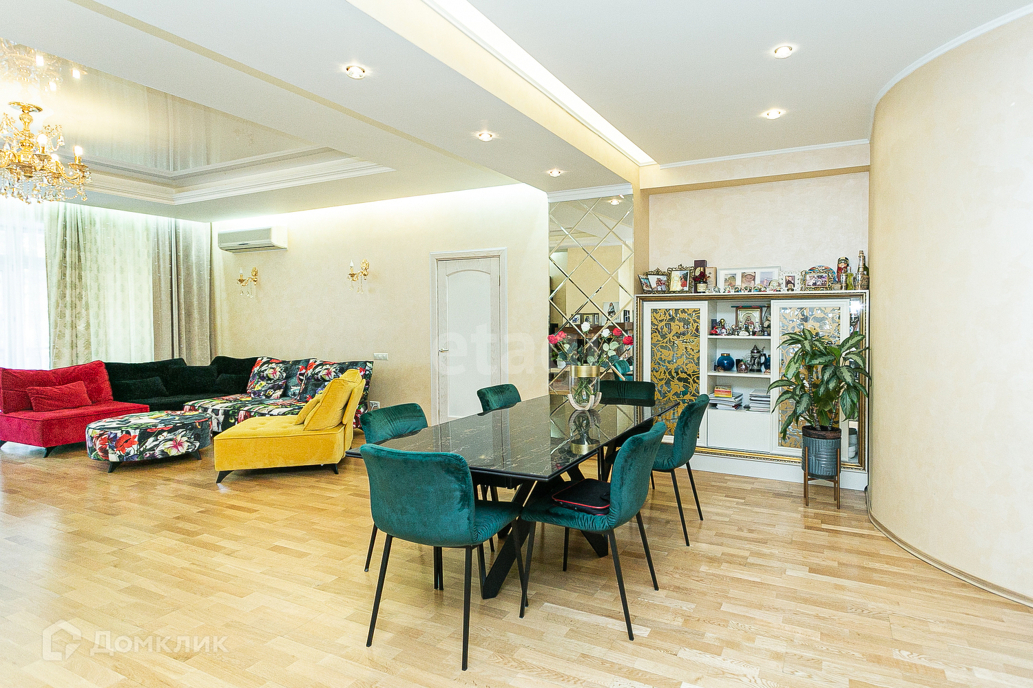 Квартира очень просторная - четыре спальни, кабинет и большая гостиная с панорамными окнами. В квартире есть сауна, три санузла, большая кладовая и огромная гардеробная комната. В квартире сделан современный ремонт, установлена встроенная мебель и качественная техника, которая останется новым владельцам.