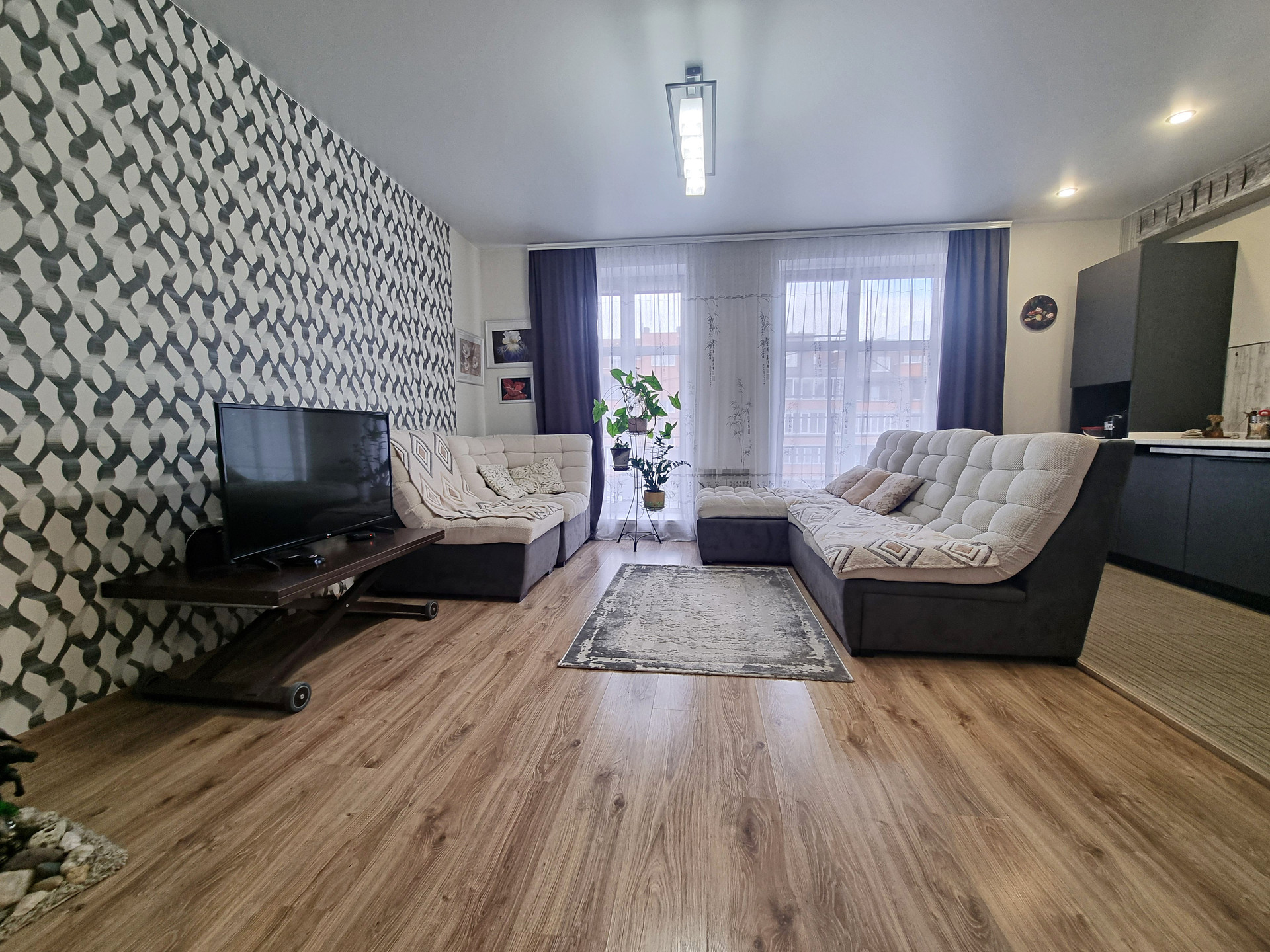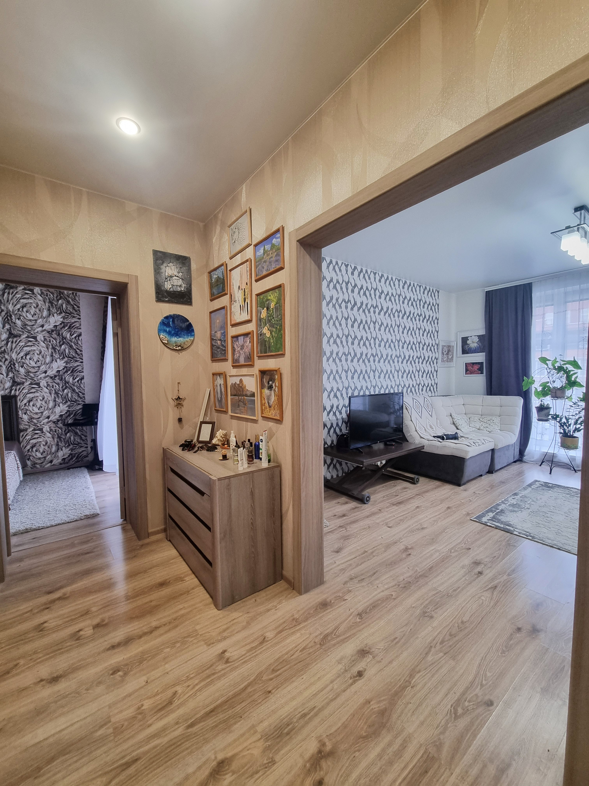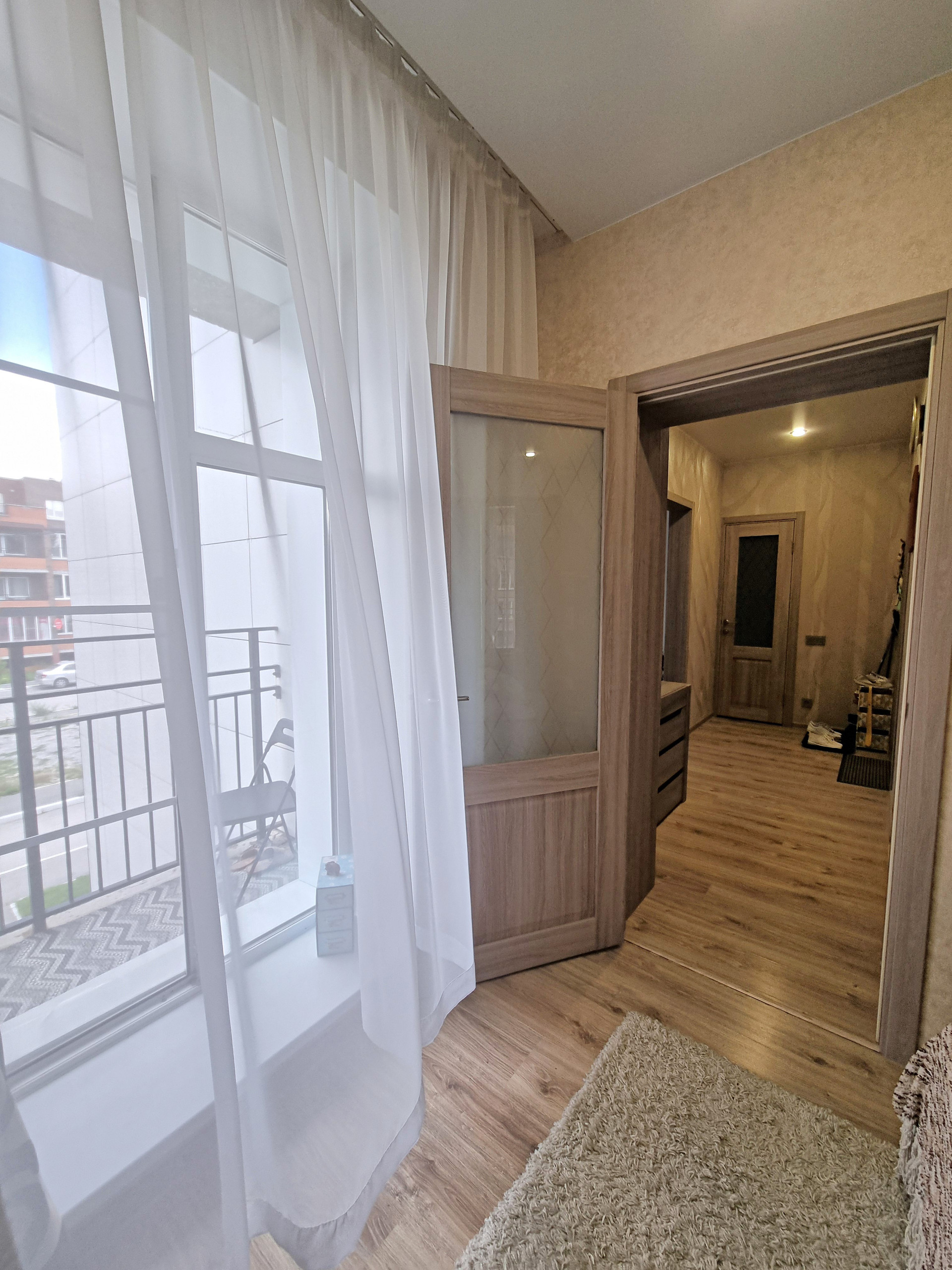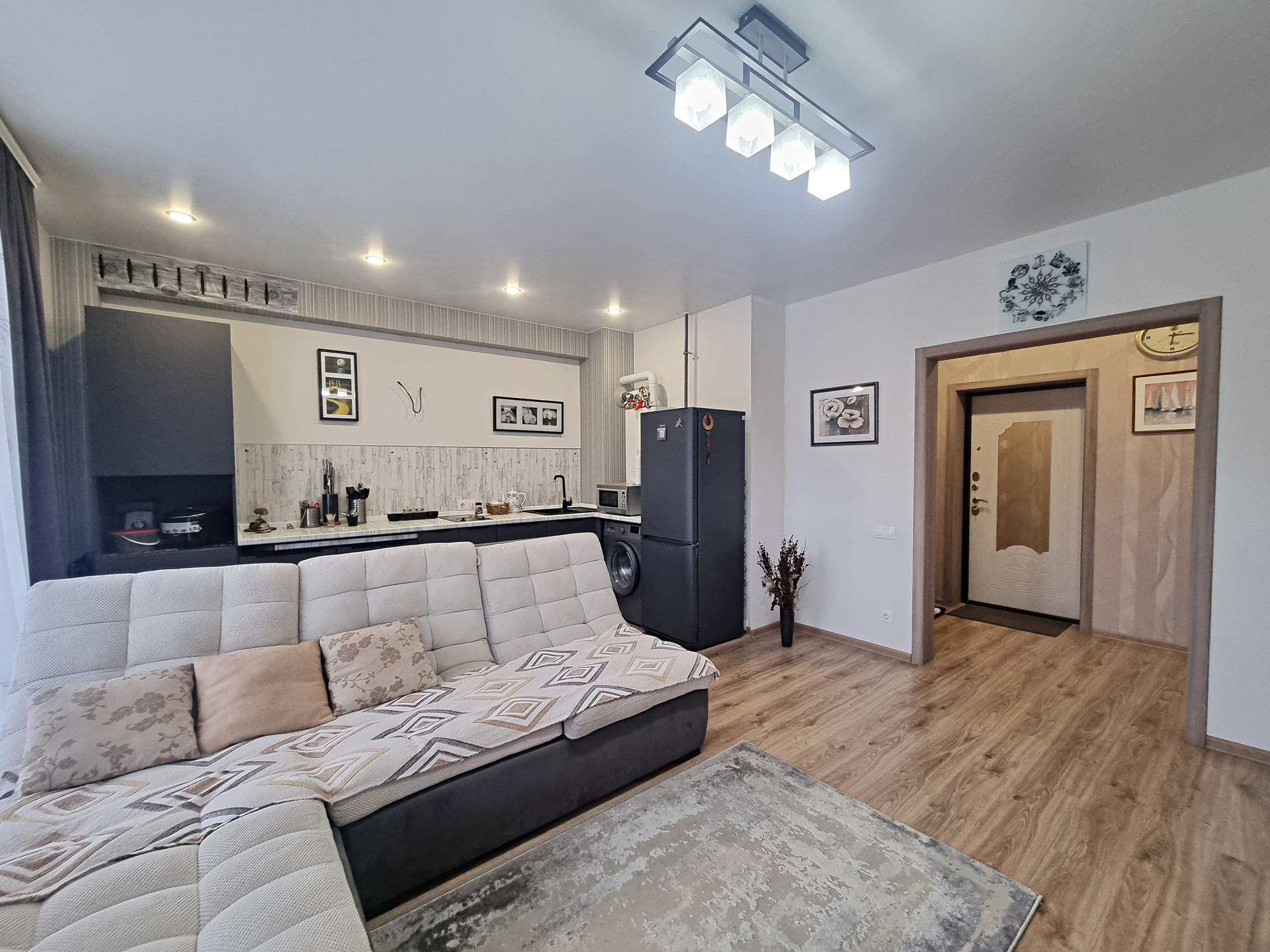 - планировка (при входе находится прихожая 5,7 кв.м., где хватит места и для небольшого встроенного шкафа или красивого комода, слева в прихожей расположена гардеробная, оборудованная полками, вешалками. Коридор разделяет между собой кухню-гостиную и спальню. Кухня гостиная, изюминка данной квартиры, просторная очень светлая , благодаря наличию двух панорамных окон. Данная комната разделена на кухонную рабочую зону с современным кухонным гарнитуром, где вы сможете готовить вкусную еду для себя и своих близких и зону отдыха, с большими удобными диванами и телевизором, где можно проводить время всем вместе, отдыхать дружной компанией друзей и близких. из кухни-гостиной есть выход на балкон.