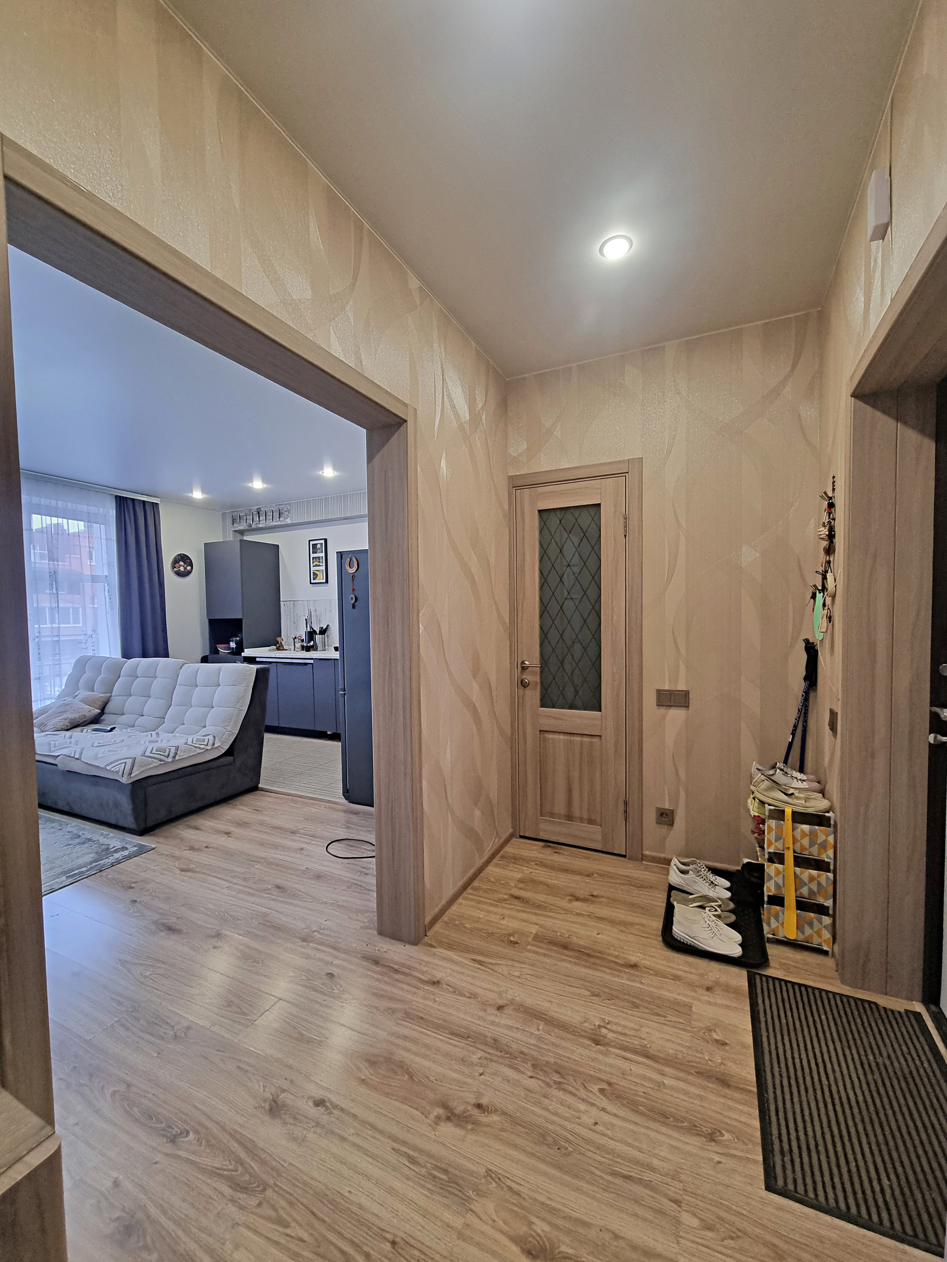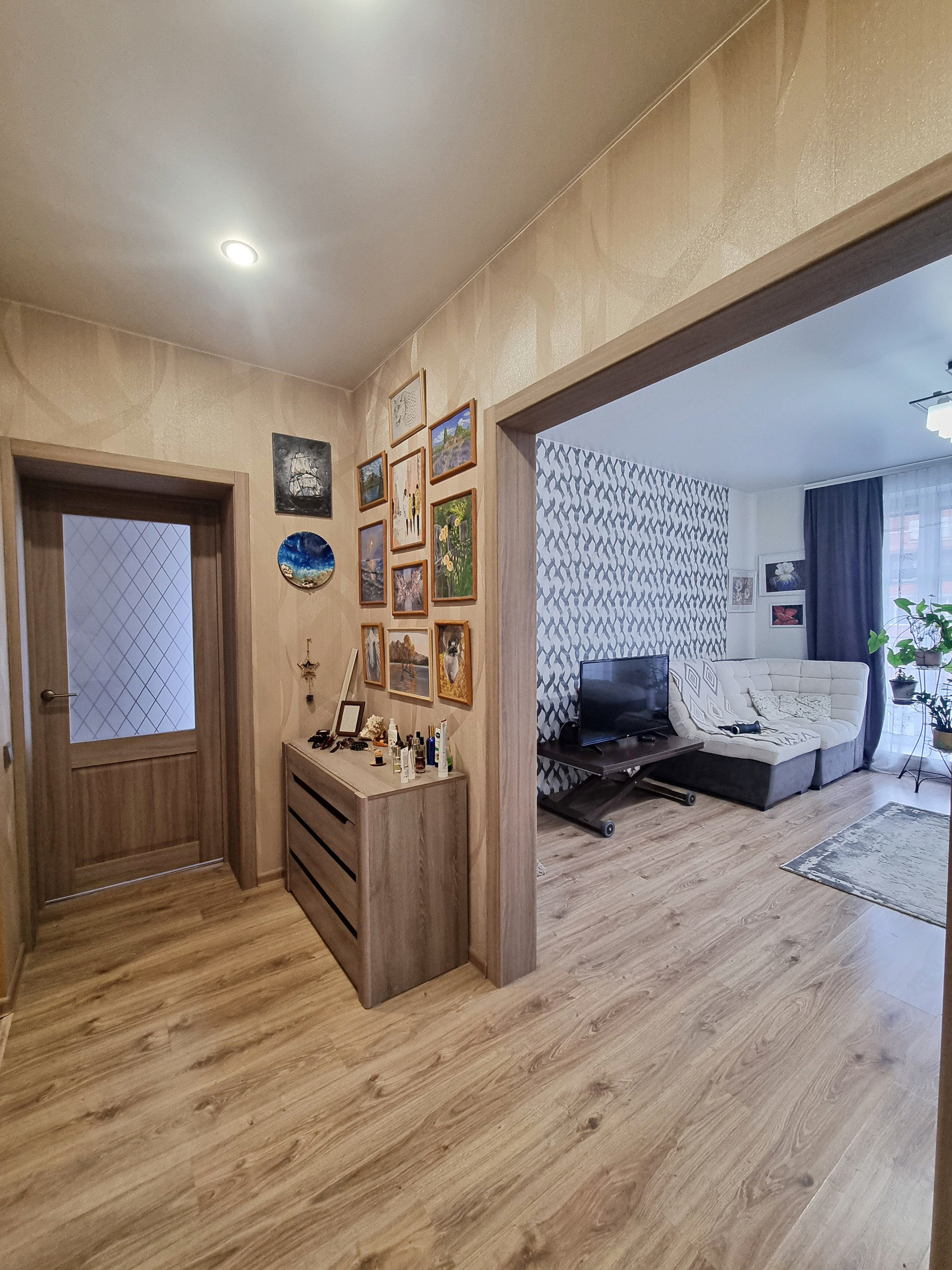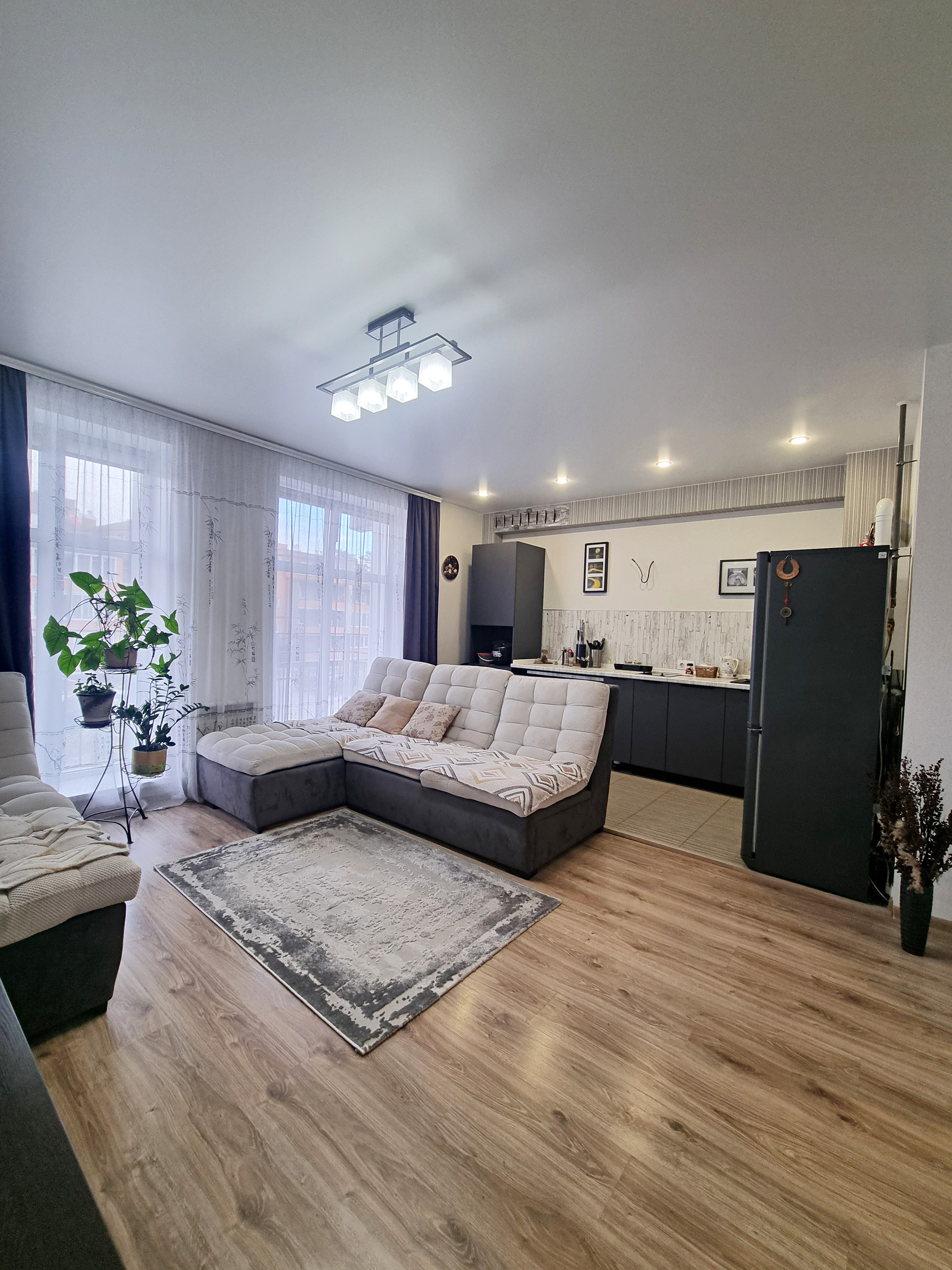 - планировка (при входе находится прихожая 5,7 кв.м., где хватит места и для небольшого встроенного шкафа или красивого комода, слева в прихожей расположена гардеробная, оборудованная полками, вешалками. Коридор разделяет между собой кухню-гостиную и спальню. Кухня гостиная, изюминка данной квартиры, просторная очень светлая , благодаря наличию двух панорамных окон. Данная комната разделена на кухонную рабочую зону с современным кухонным гарнитуром, где вы сможете готовить вкусную еду для себя и своих близких и зону отдыха, с большими удобными диванами и телевизором, где можно проводить время всем вместе, отдыхать дружной компанией друзей и близких. из кухни-гостиной есть выход на балкон.