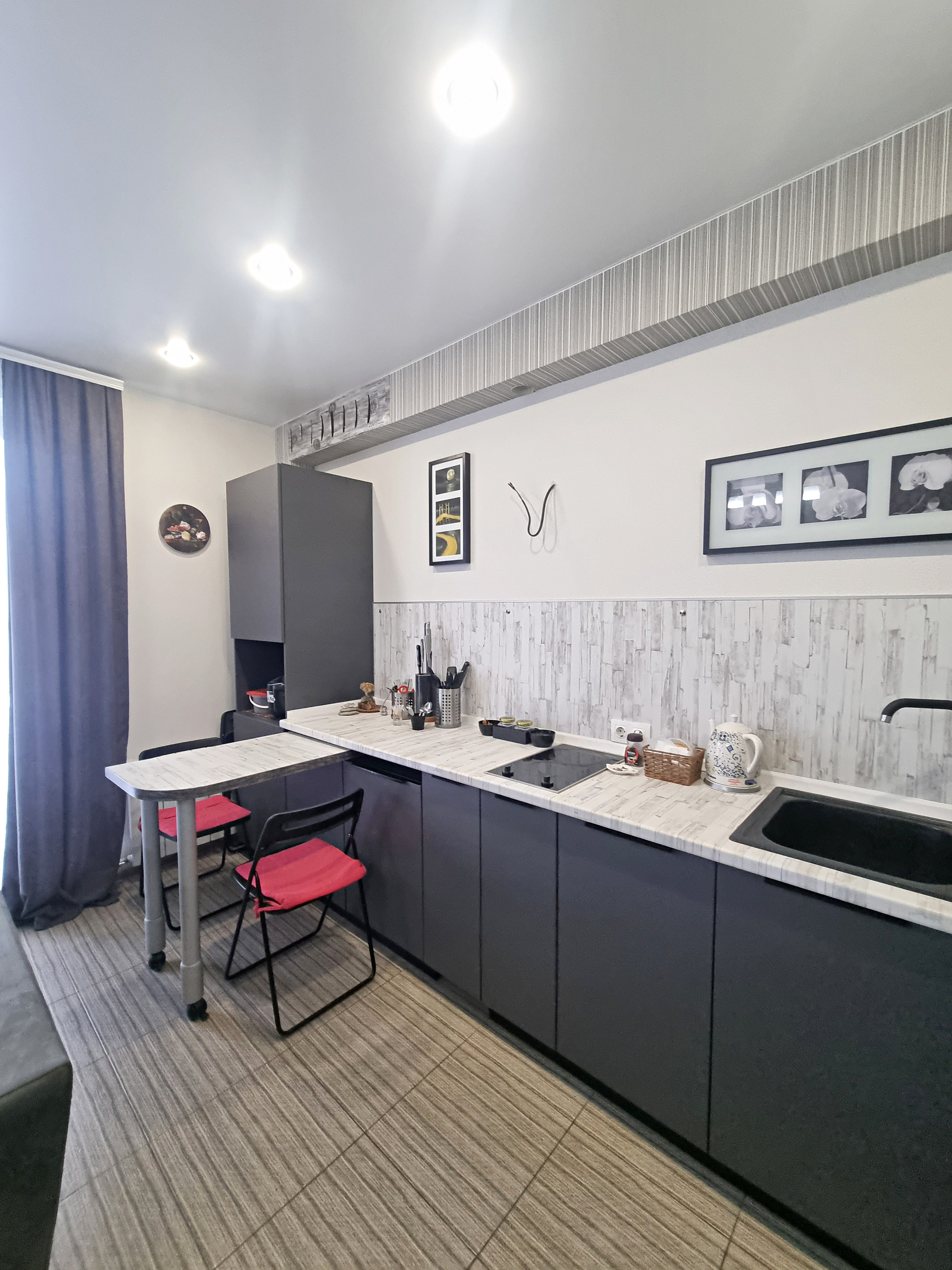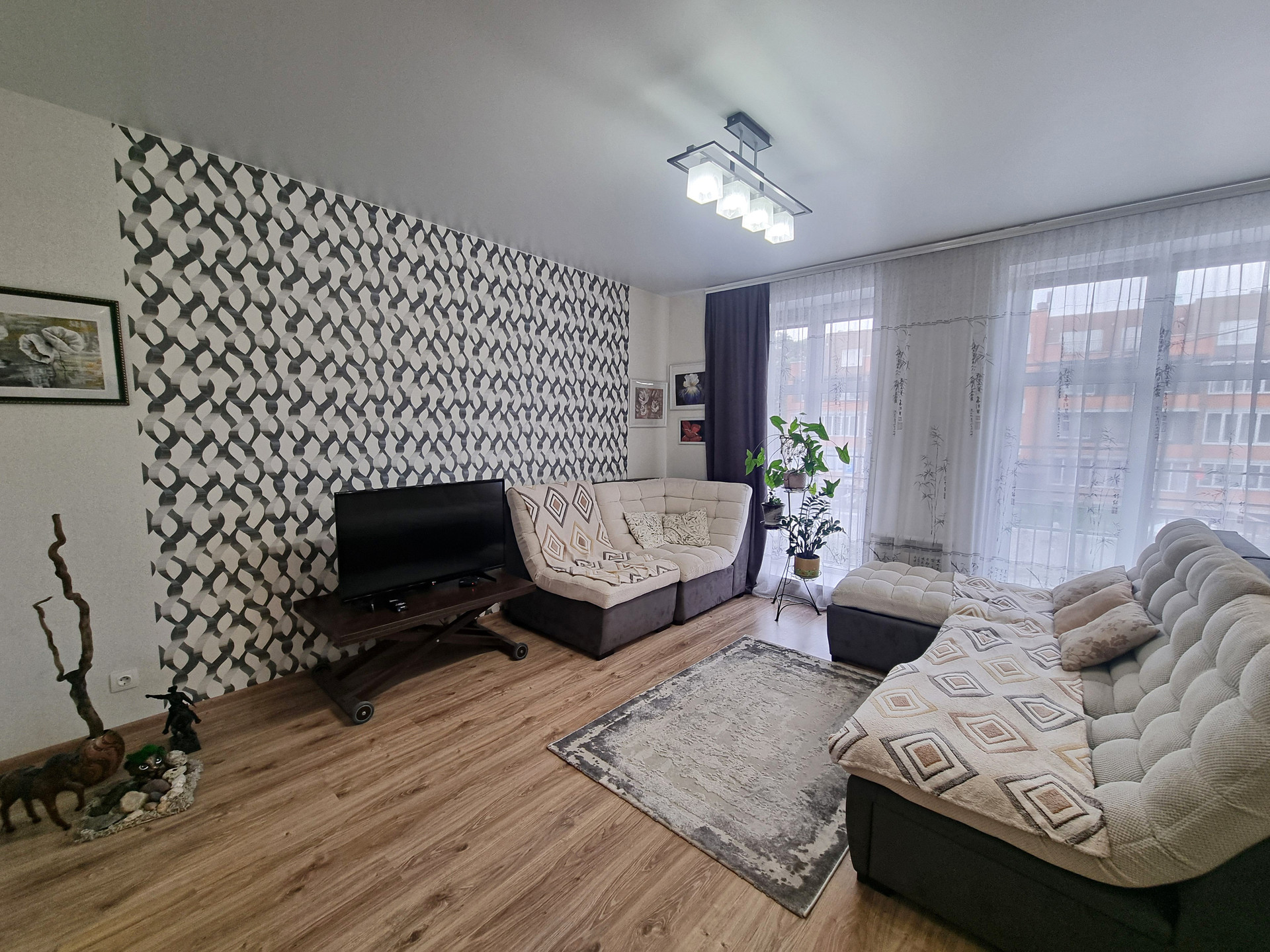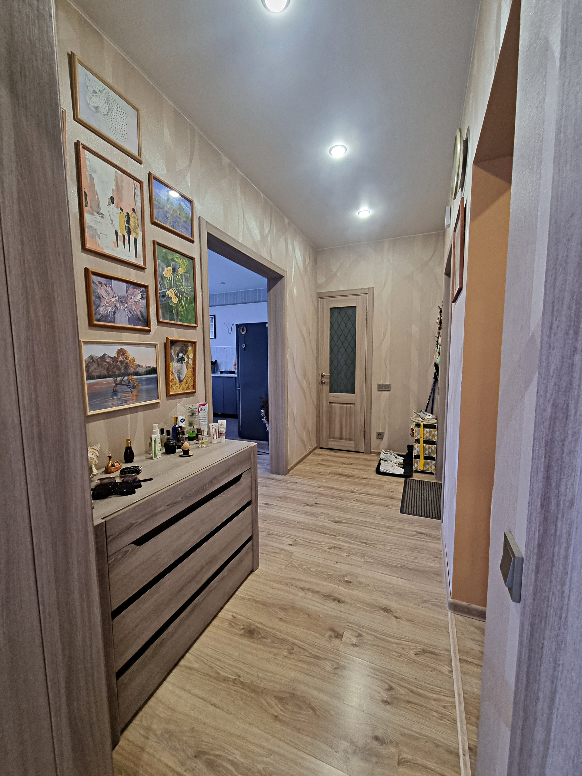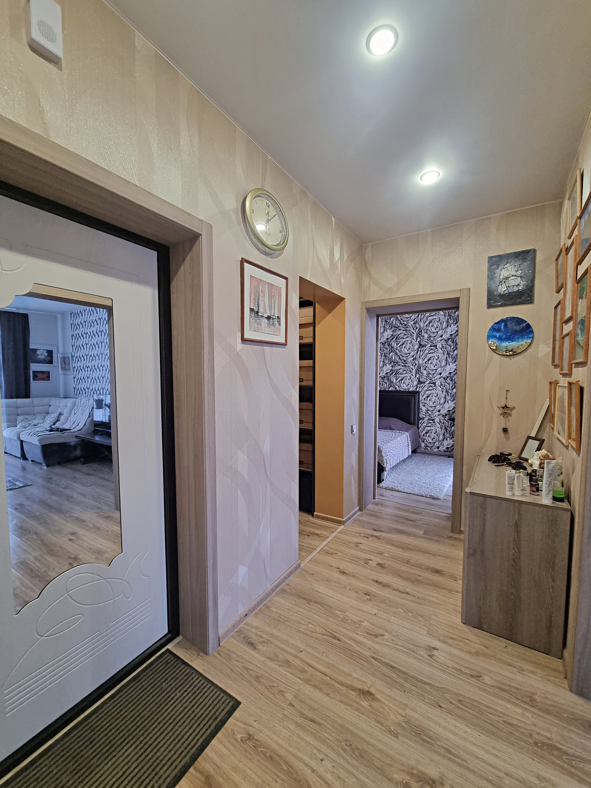 - планировка (при входе находится прихожая 5,7 кв.м., где хватит места и для небольшого встроенного шкафа или красивого комода, слева в прихожей расположена гардеробная, оборудованная полками, вешалками. Коридор разделяет между собой кухню-гостиную и спальню. Кухня гостиная, изюминка данной квартиры, просторная очень светлая , благодаря наличию двух панорамных окон. Данная комната разделена на кухонную рабочую зону с современным кухонным гарнитуром, где вы сможете готовить вкусную еду для себя и своих близких и зону отдыха, с большими удобными диванами и телевизором, где можно проводить время всем вместе, отдыхать дружной компанией друзей и близких. из кухни-гостиной есть выход на балкон.