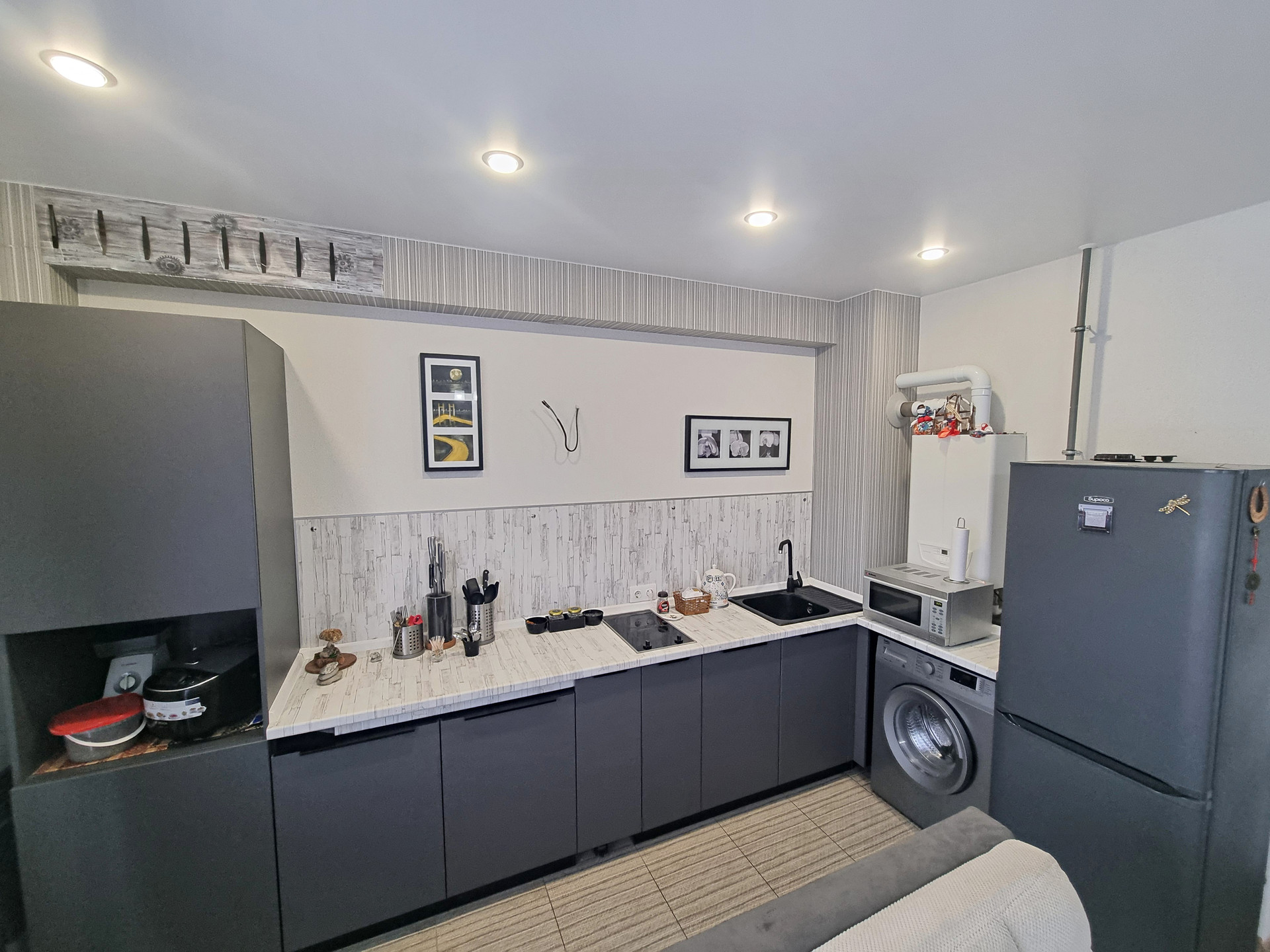 - ремонт(все в квартире сделано в нейтральных оттенках со вкусом и выдержкой. Использованы только качественные материалы. Стены и откосы отштукатурены по маякам . Разводка электрики в квартире проводилась с учетом освещения каждой зоны отдельно. Потолок во всей квартире матовый натяжной, на полу ламинат, рабочая кухонная зона - кафельная плитка, теплый пол, сан. узел облицован кафелем, сантехника в хорошем состоянии. Хотелось бы отметить, что в квартире при продаже остается вся техника и мебель, кухонный гарнитур (со встроенной посудомоечной машиной, варочная панель, место для духового шкафа есть и все для его подключения тоже, так же все выводы для установки вытяжки сделаны), стиральная машина, холодильник, телевизор, диваны, комод, спальный гарнитур (шкаф и кровать). На всю технику имеются паспорта, техника новая. Можно заходить в квартиру, наполнить ее своей энергией и наслаждаться жизнью в уютном гнездышке без вложений в ремонт.
