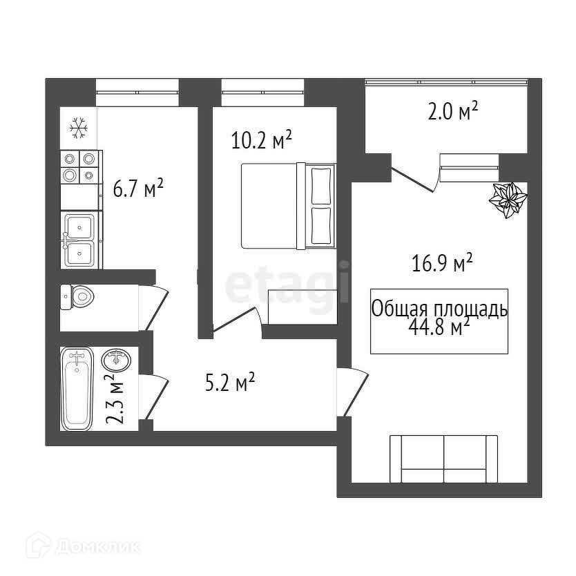 Общая площадь 44.8 м2