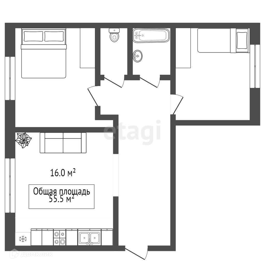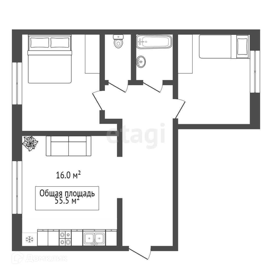 Общая площадь 55.5 м2