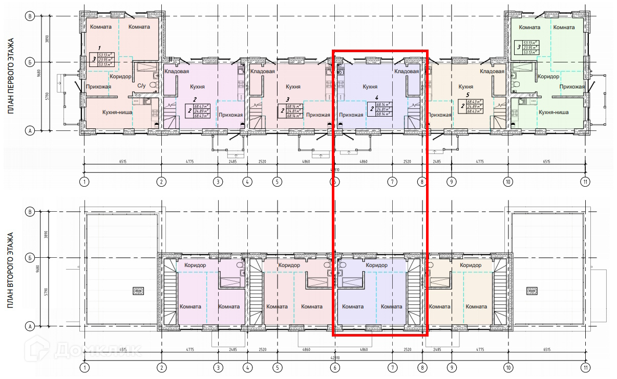 Планировка 68,14 кв.м. - это двухэтажный таунхаус, расположенный на участке 1,8 сот. Планировка свободная, жилая площадь 24,89 м.кв. На первом и втором этажах подведеная мокрая точка, санузел можно сделать на обоих этажах, либо на втором этаже - прачечную или гардеробную вместо санузла.