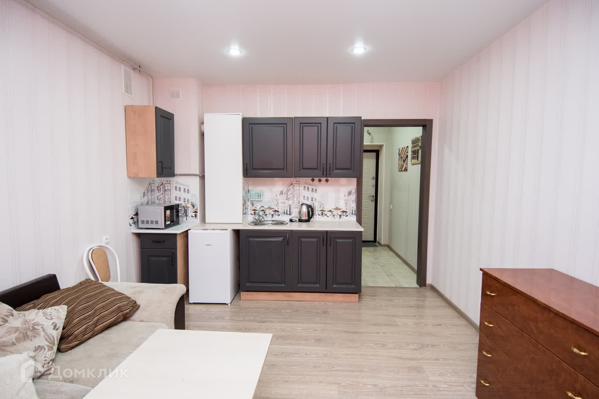 В квартире имеется: кухонный гарнитур, микроволновая печь, холодильник, плита, журнальный столик, спальное место (двухспальный диван), шкаф, стиральная машина.
