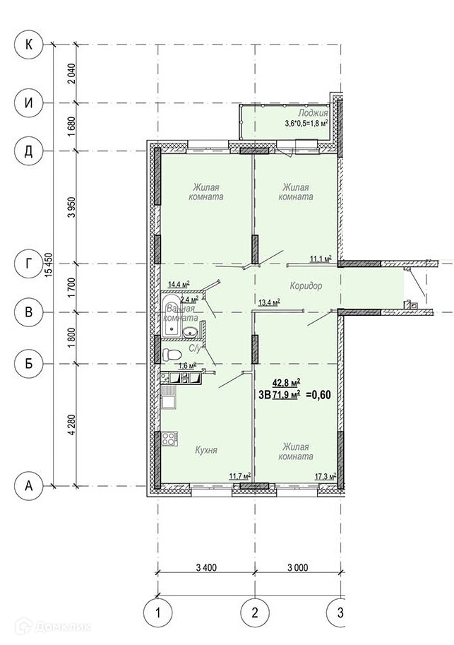 Общая площадь 70.7 м2
