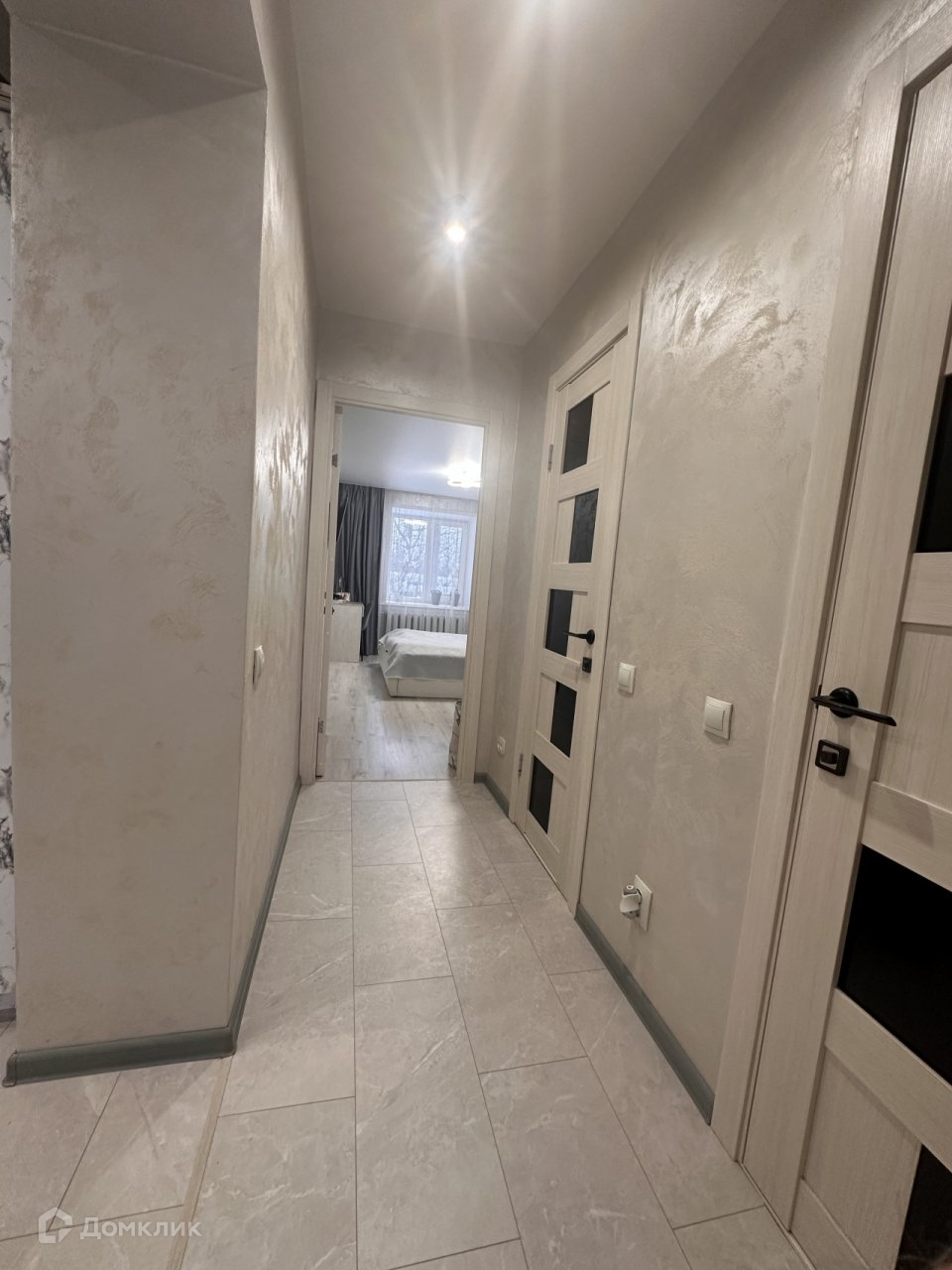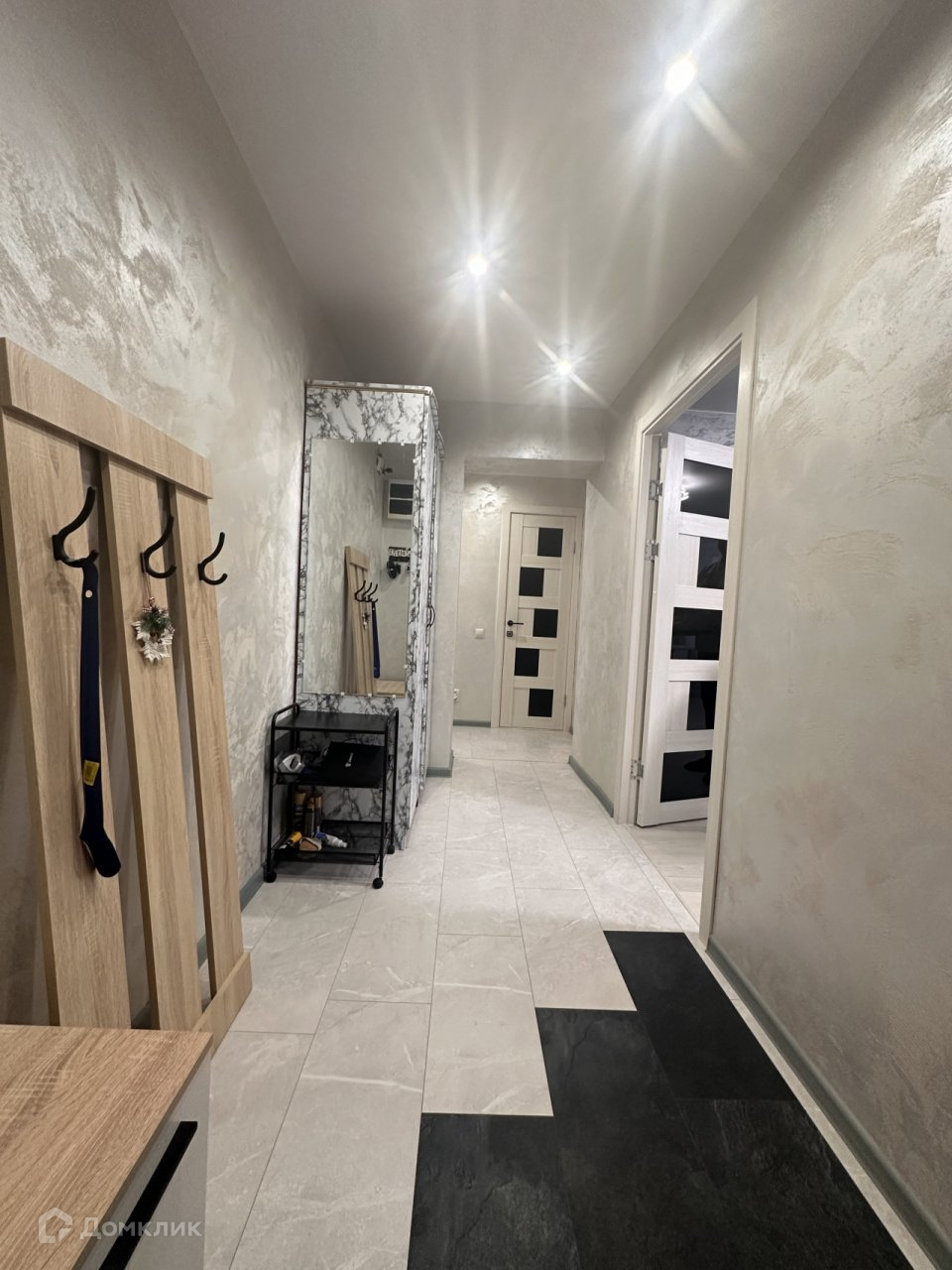 - На полу в коридоре у кухне керамогранит,в комнатах ламинат
