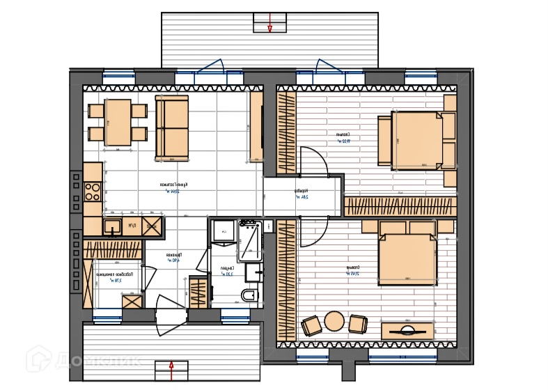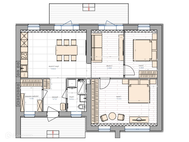 - Квартира включает в себя холл, техническое помещение, кухню-столовую, санузел и комнату свободной планировки