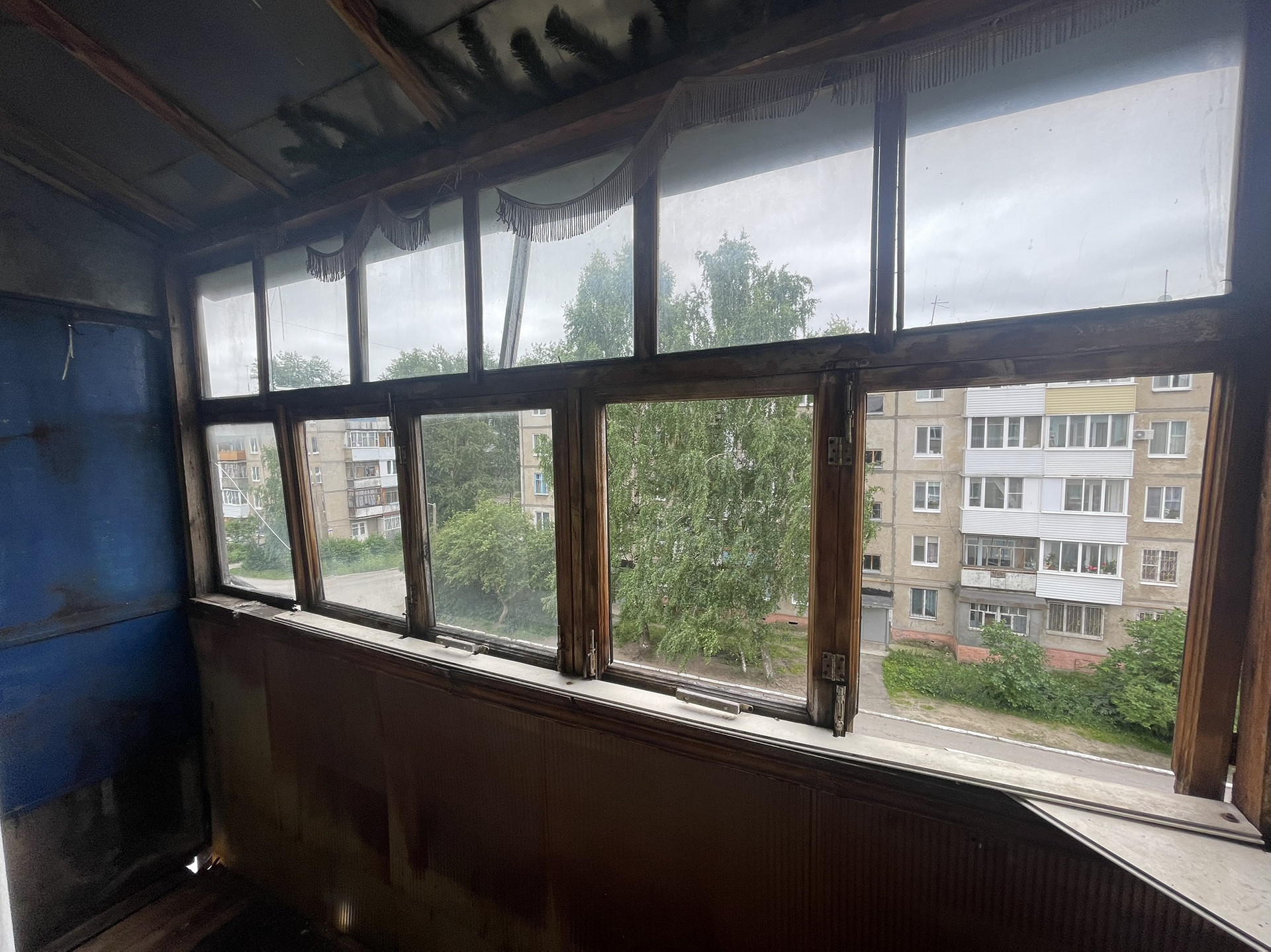 Балкон остеклен деревом.