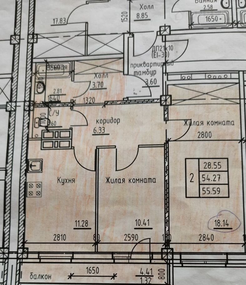 Общая площадь 54.3 м2