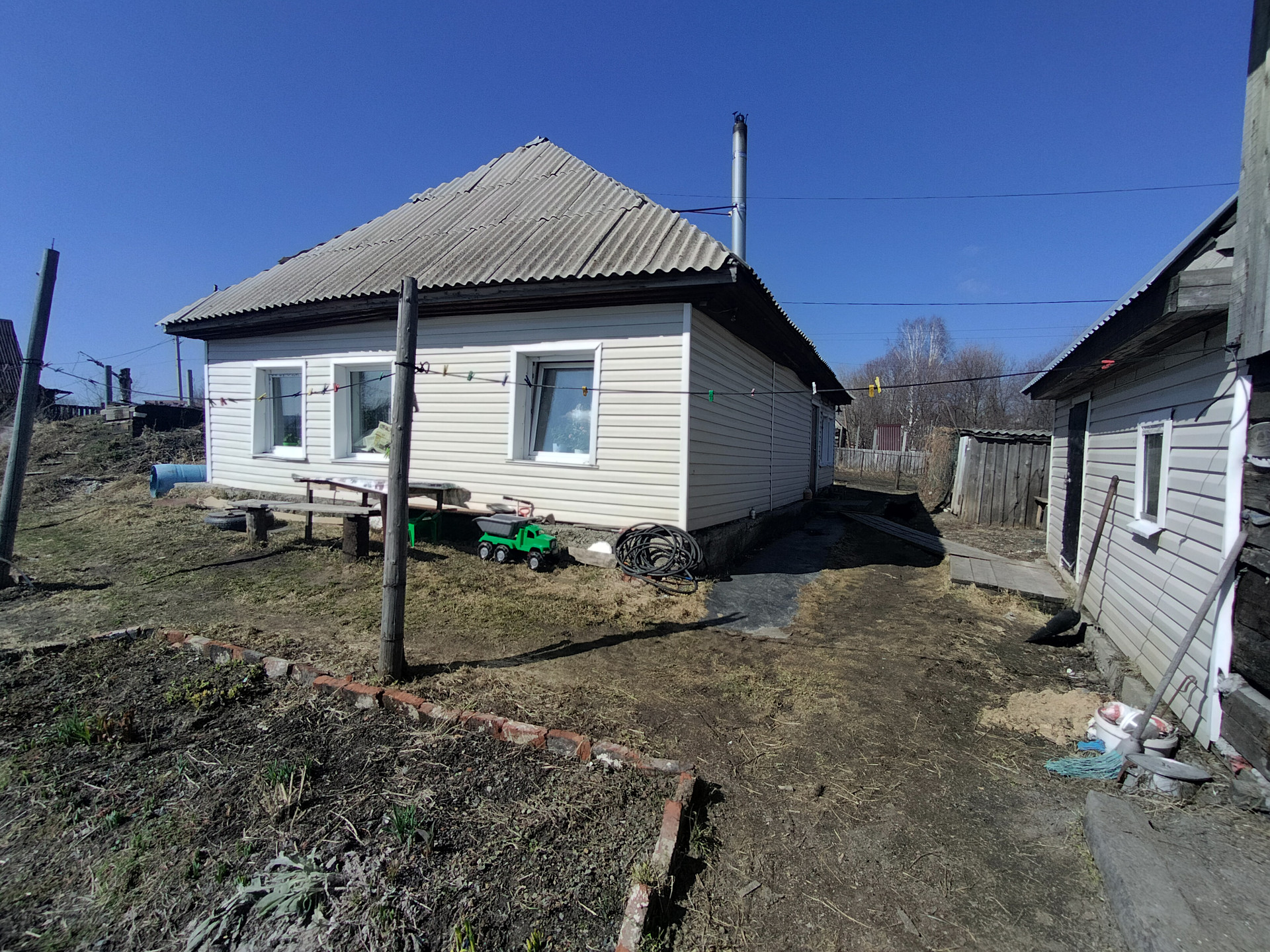 Рубленный, обшит сайдингом, на заливном фундаменте. Крыша — шифер.