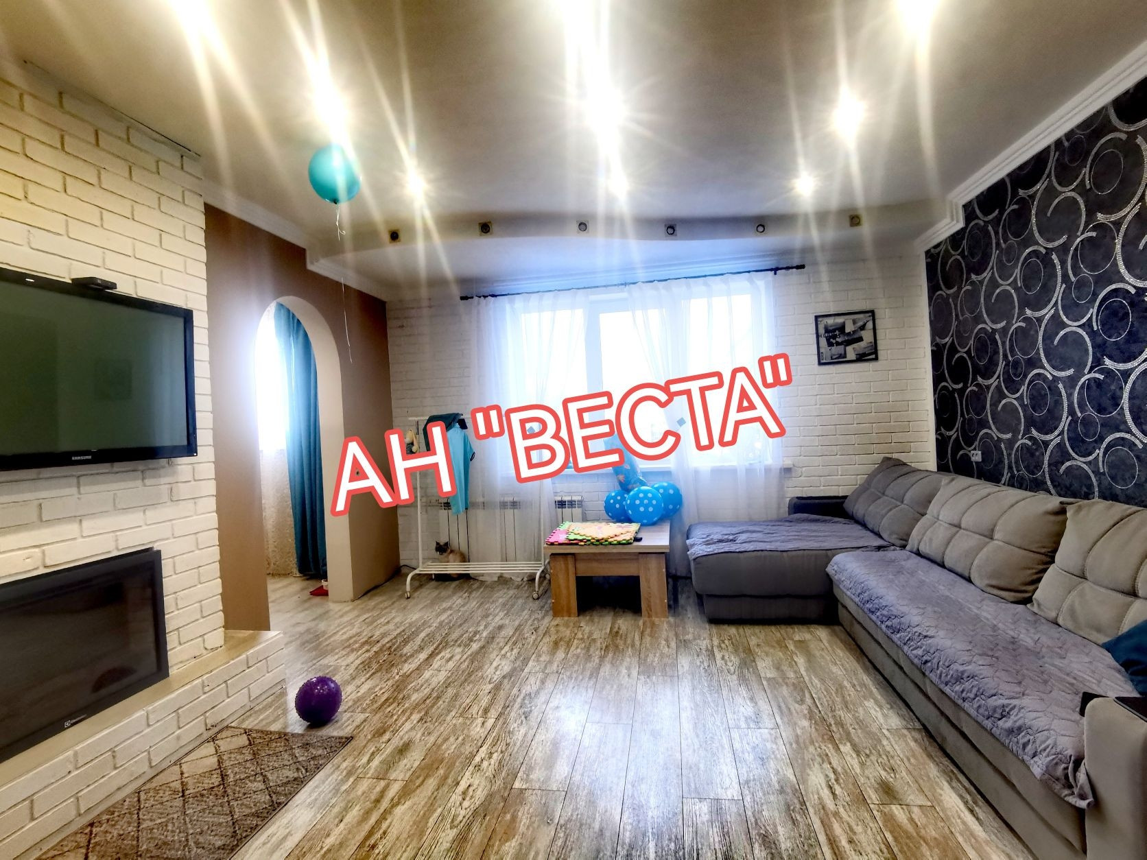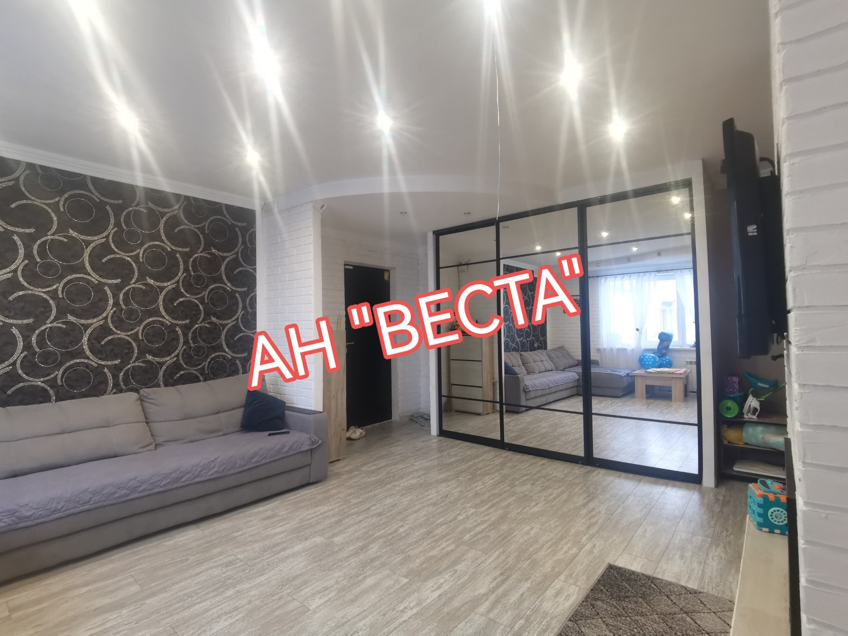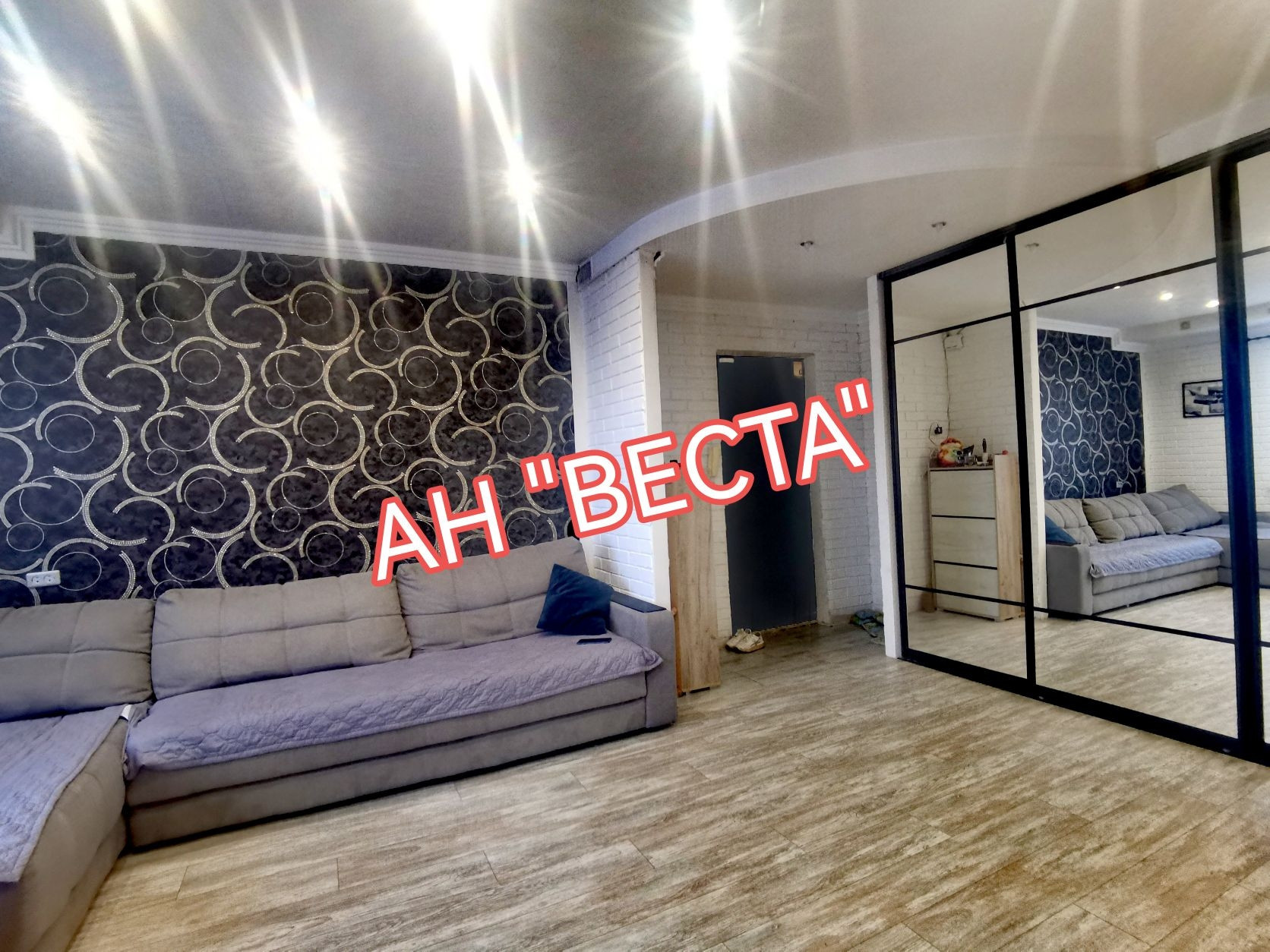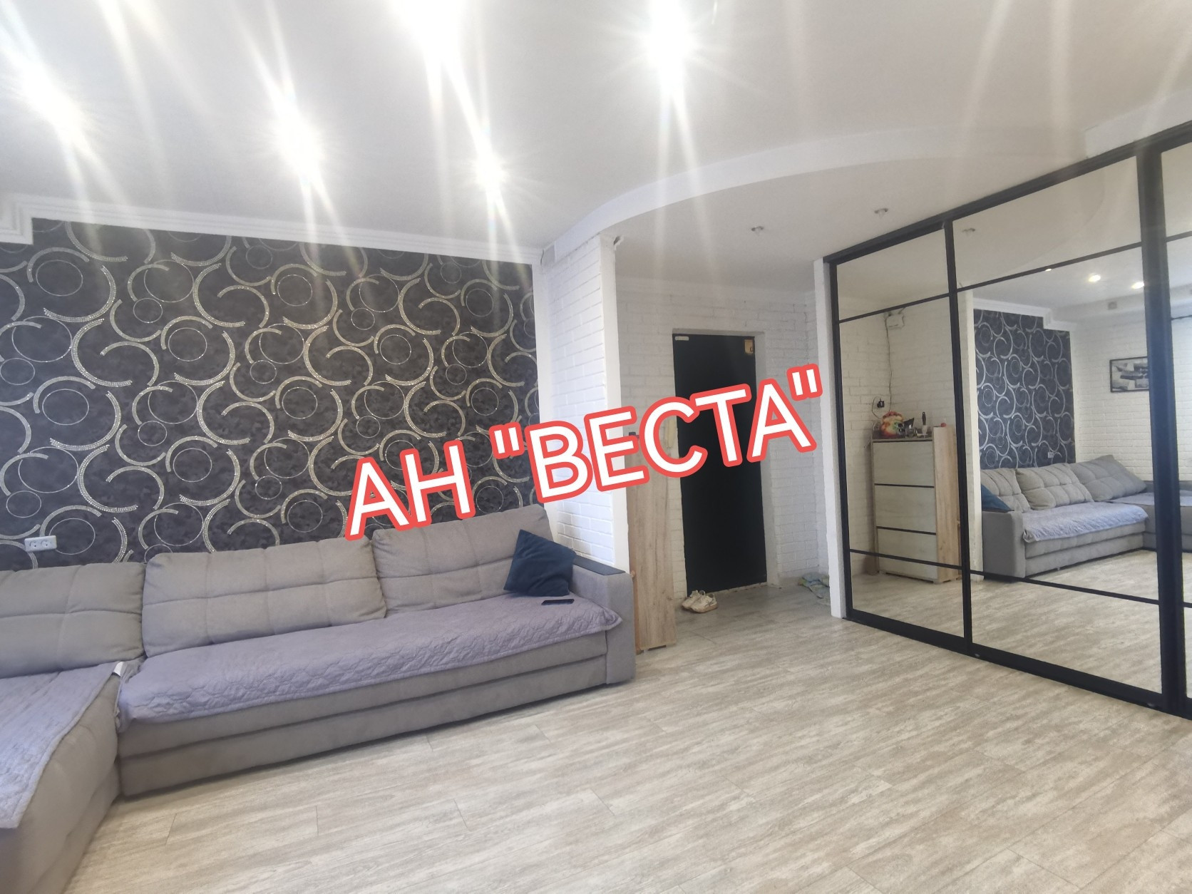 Стены выровнены и  оклеены обоями, в гостевой комнате стены оформлены декоративными кирпичиками. Потолки в гостевой и кухне в двух уровнях с точечным освещением. Установлен кондиционер. Кухня выведена из гостевой. Двери все современные. Полы ровные, во всех комнатах ламинат.