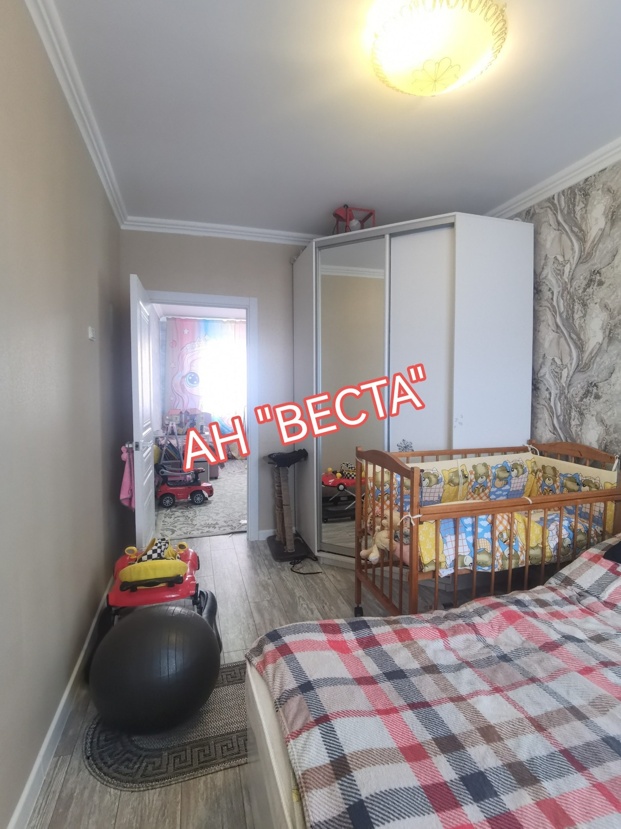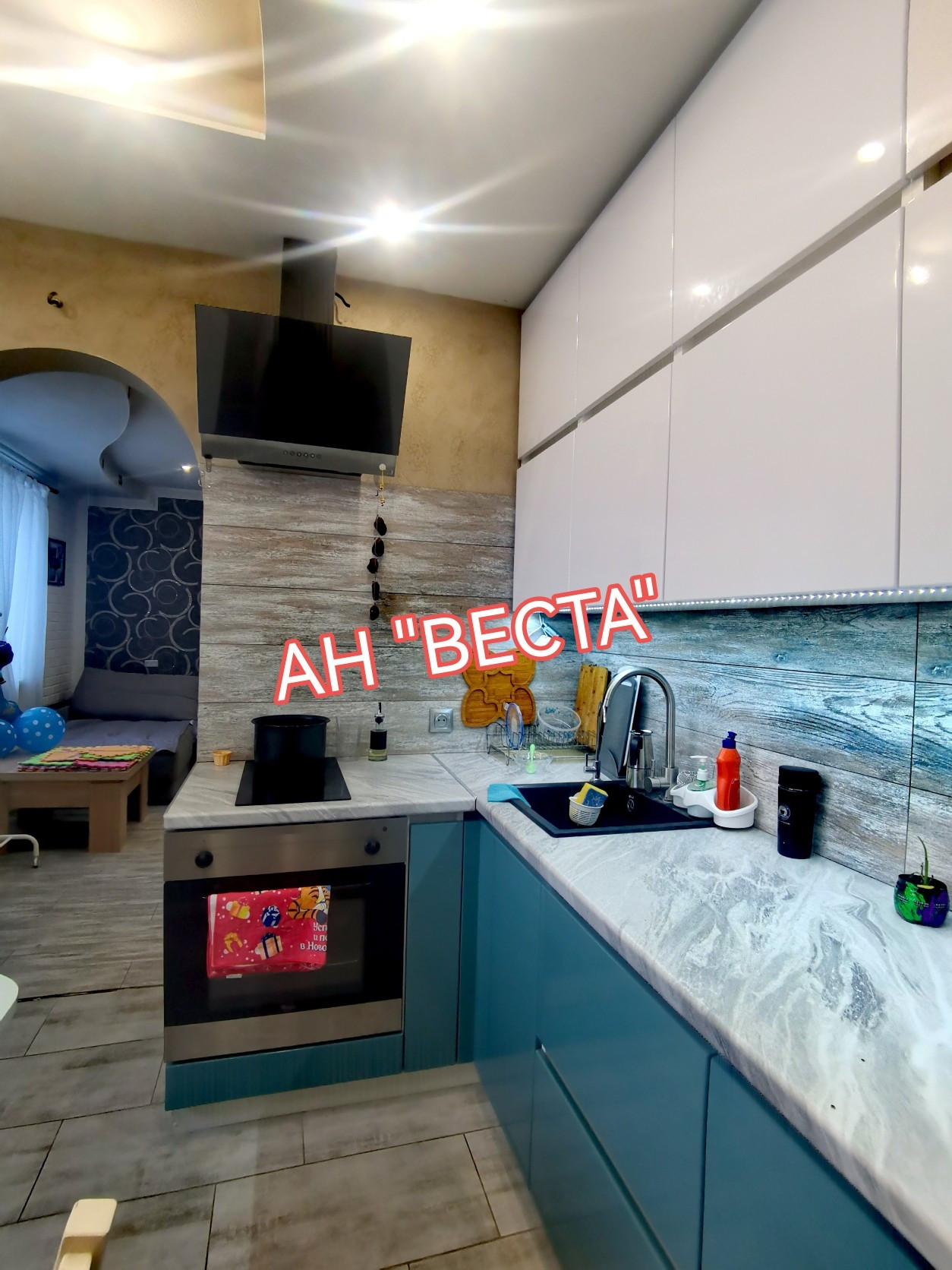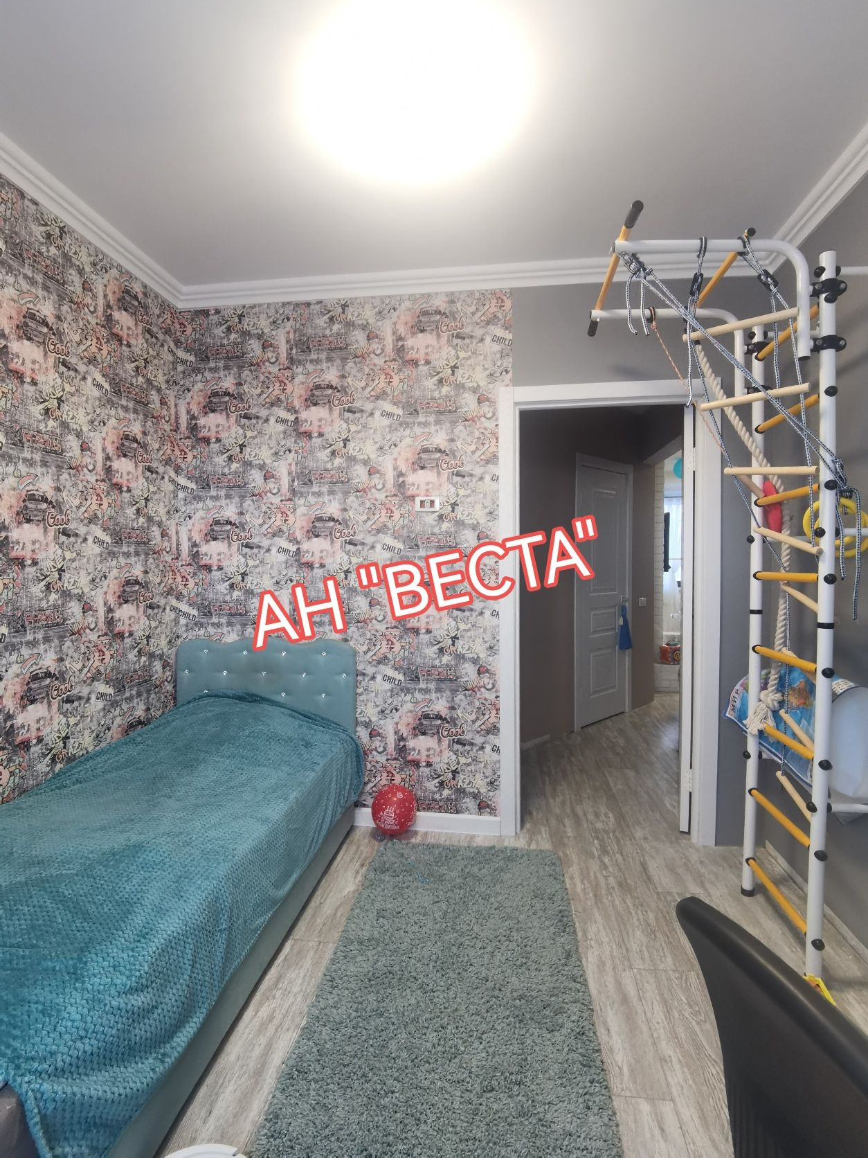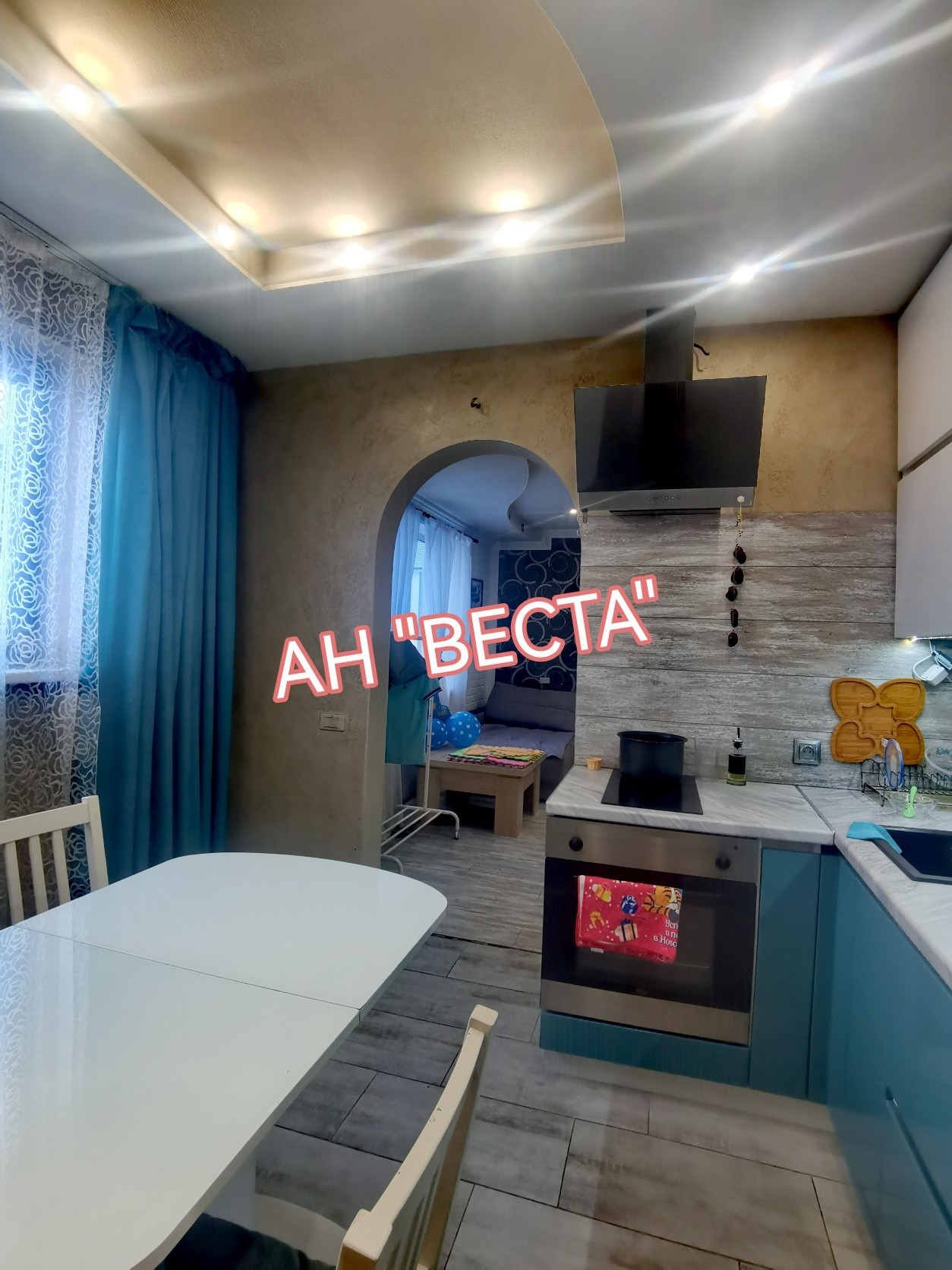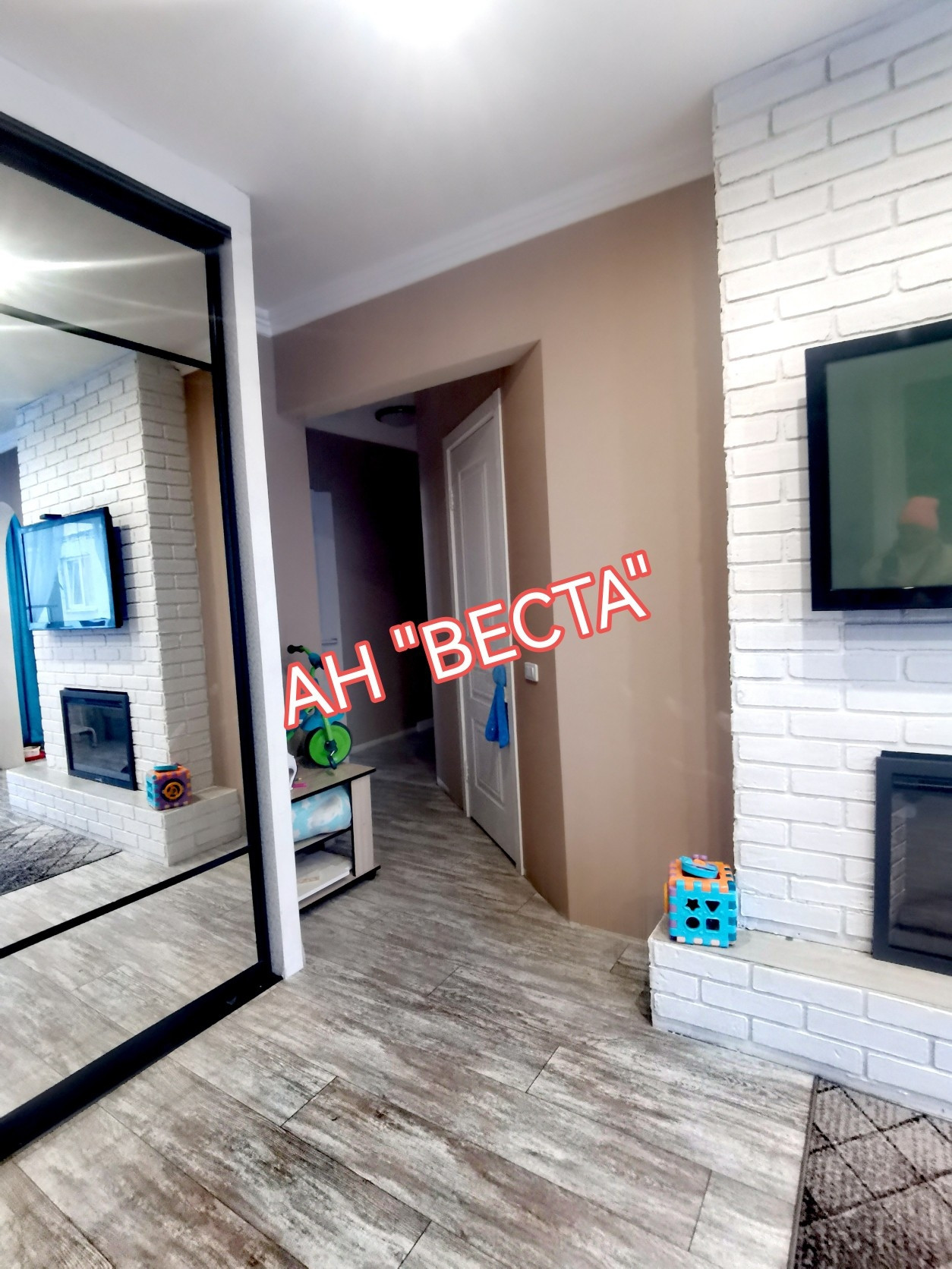 Стены выровнены и  оклеены обоями, в гостевой комнате стены оформлены декоративными кирпичиками. Потолки в гостевой и кухне в двух уровнях с точечным освещением. Установлен кондиционер. Кухня выведена из гостевой. Двери все современные. Полы ровные, во всех комнатах ламинат.