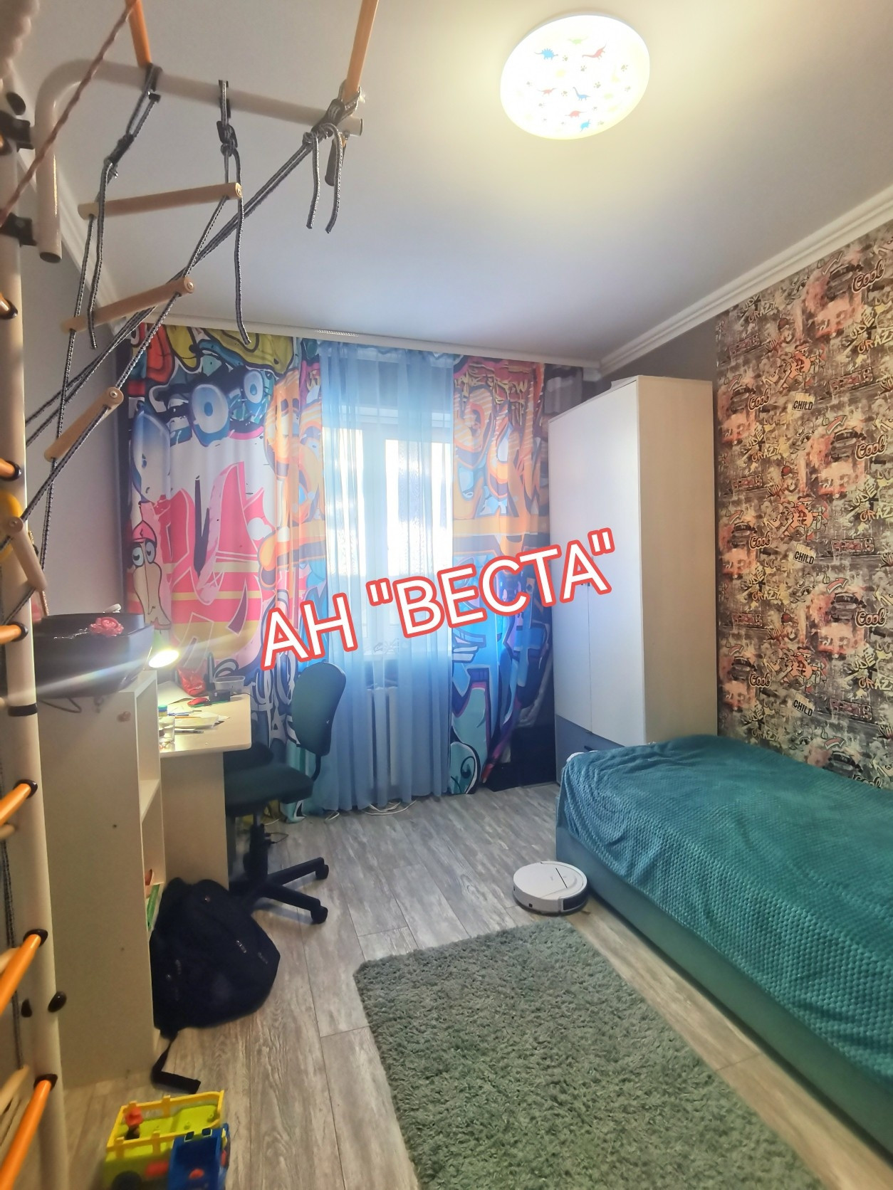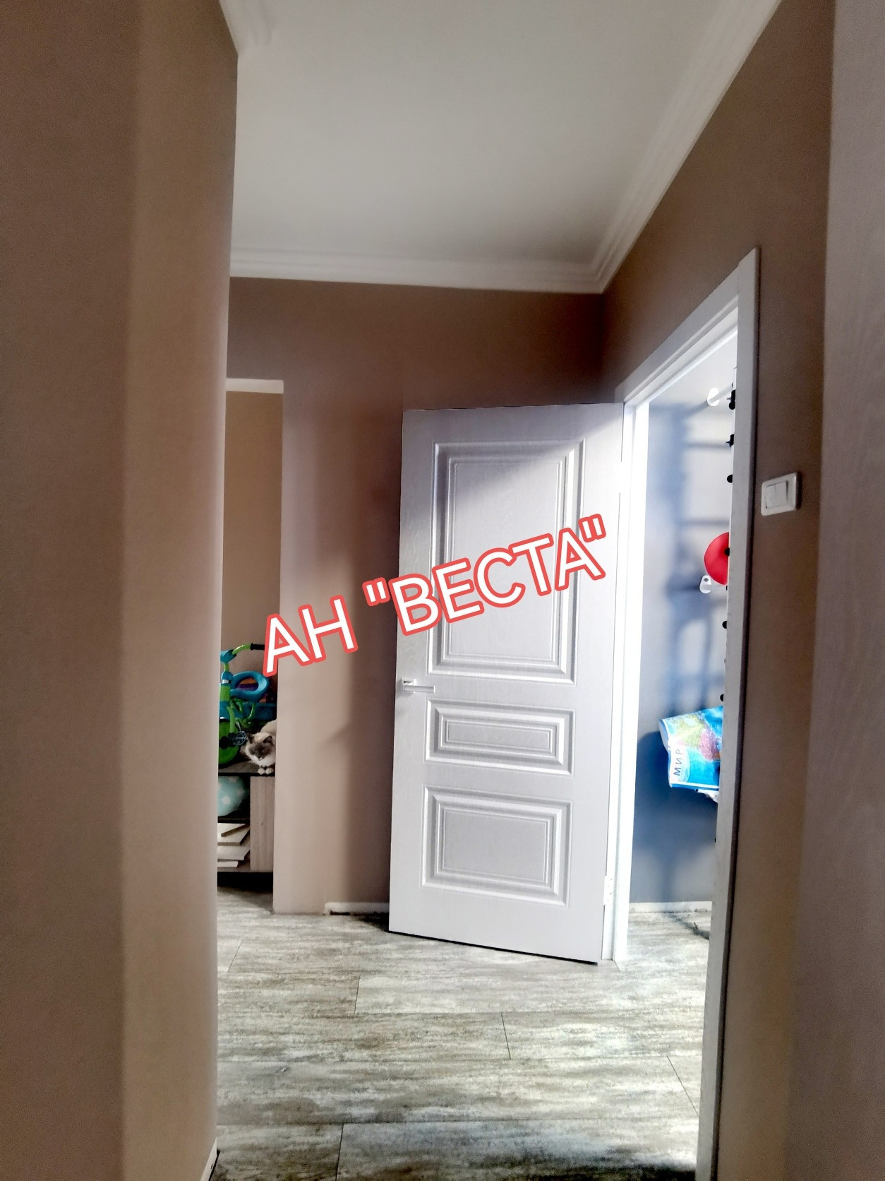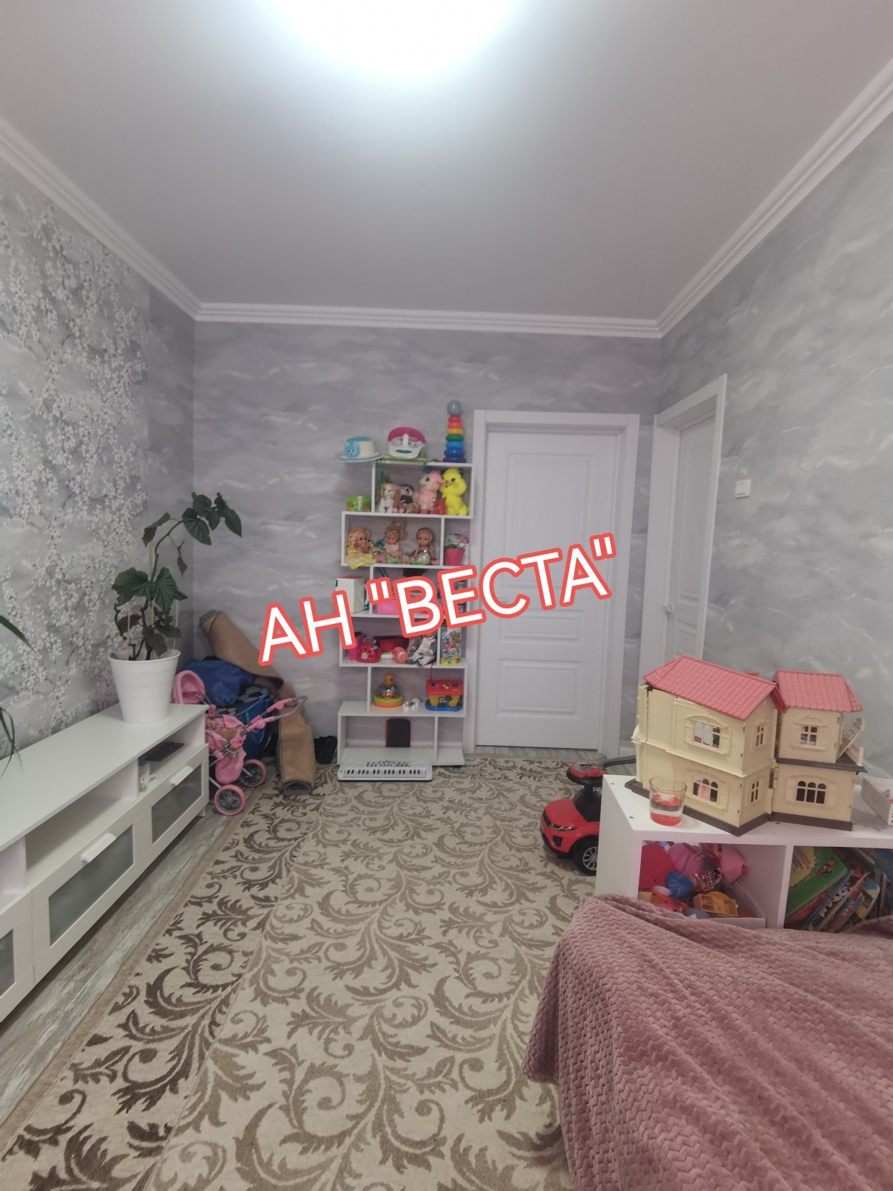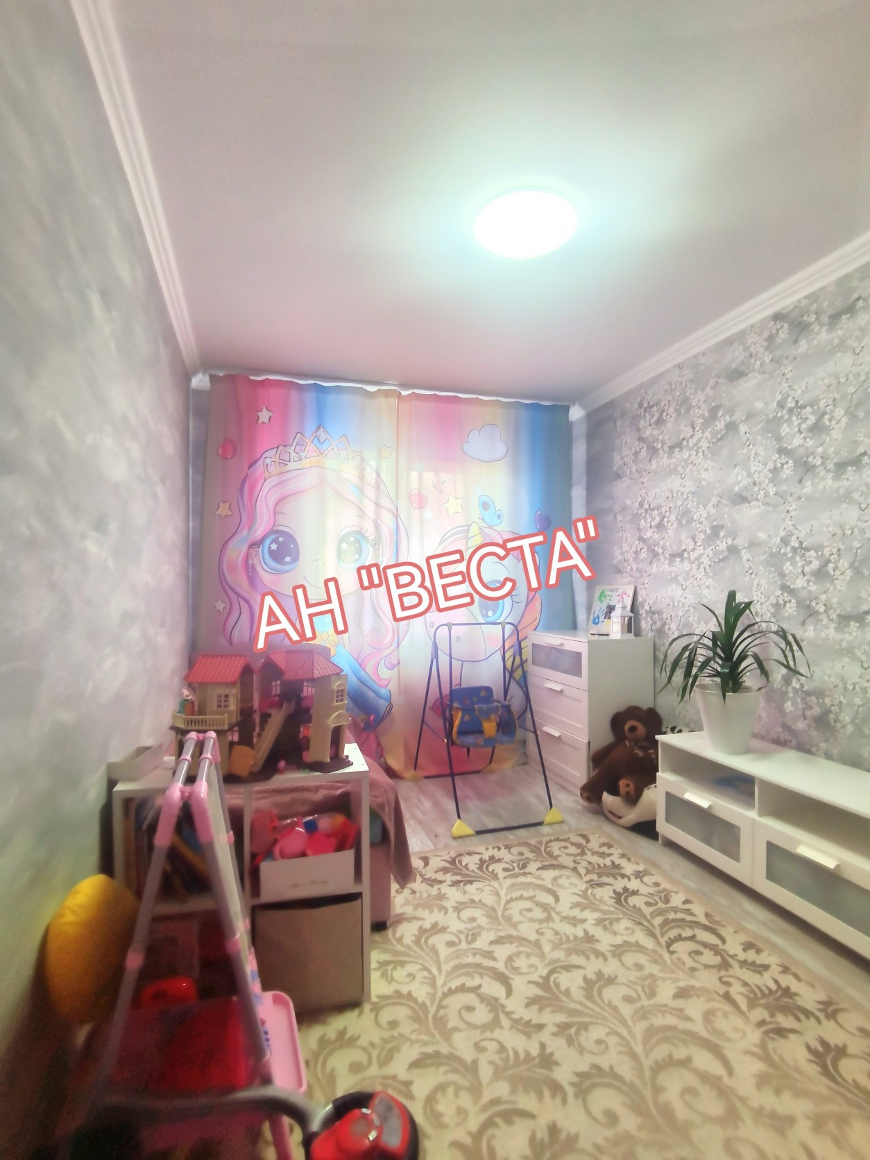 Стены выровнены и  оклеены обоями, в гостевой комнате стены оформлены декоративными кирпичиками. Потолки в гостевой и кухне в двух уровнях с точечным освещением. Установлен кондиционер. Кухня выведена из гостевой. Двери все современные. Полы ровные, во всех комнатах ламинат.