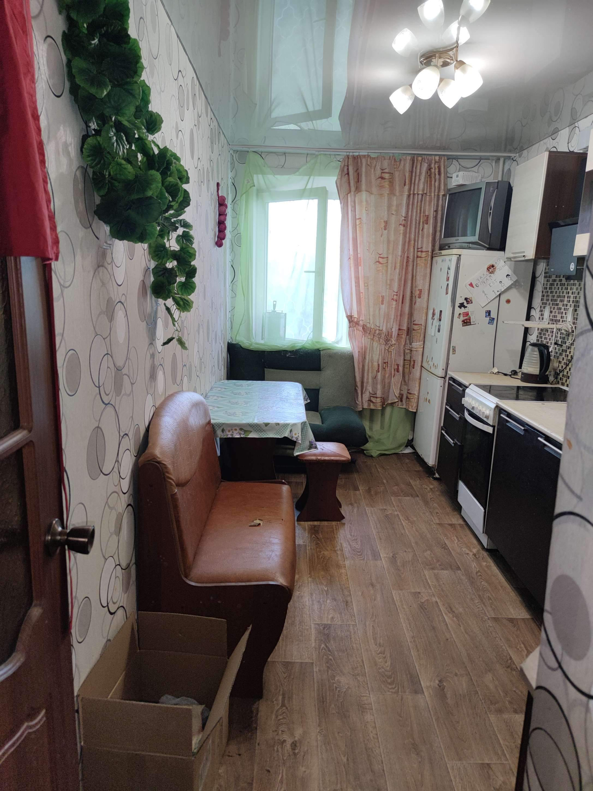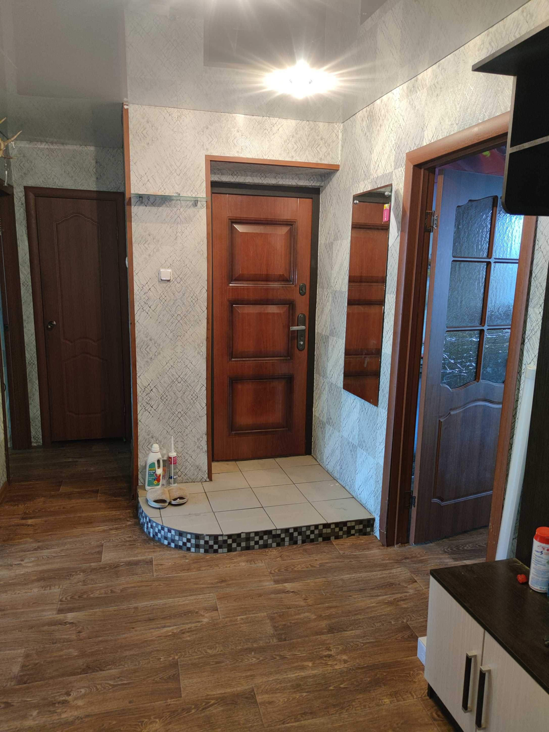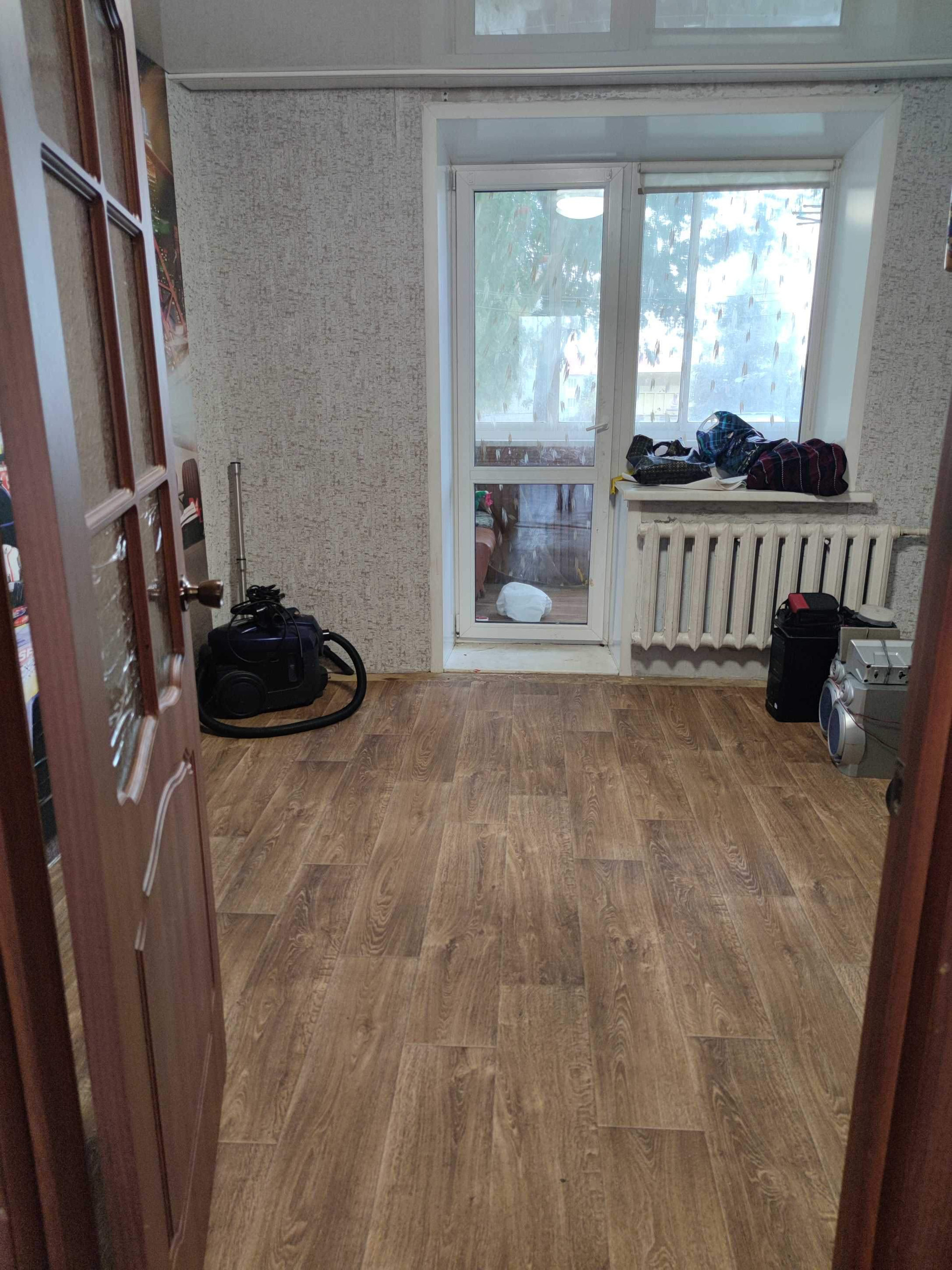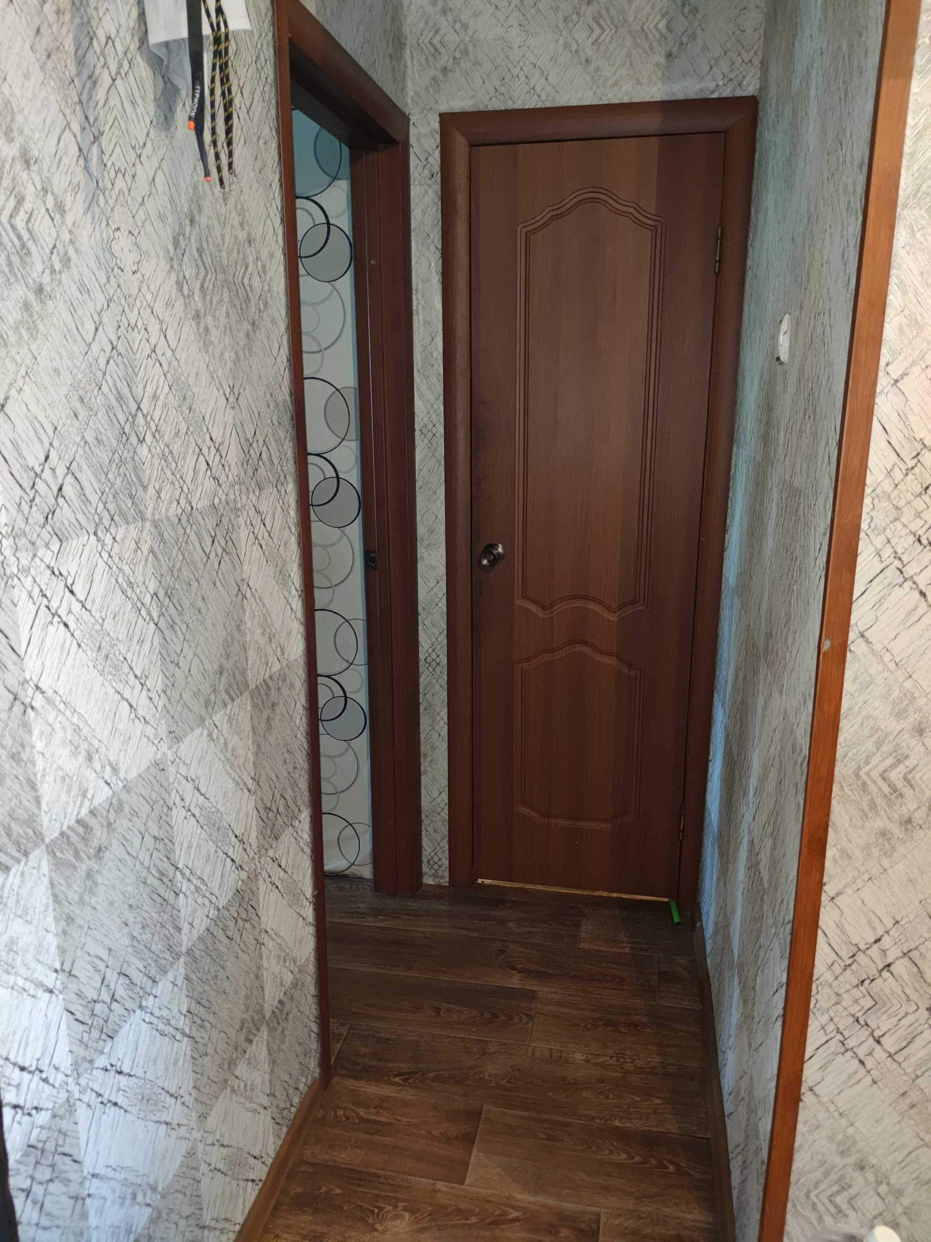 Стены выровнены и  оклеены обоями, потолки во всех комнатах натяжные.Полы старые деревянные убраны, залиты по уровню, сверху положены новые брусья, потом сверху фанера и потом новый линолеум по всей квартире. Есть кладовая. Двери все современные.  Санузел раздельный, стены оформлены панелями ПВХ.                                Остается частично мебель(прихожая,кухонный гарнитур с эл.печью и вытяжкой, в спальне: кровать и шкаф, в детской: шкаф)