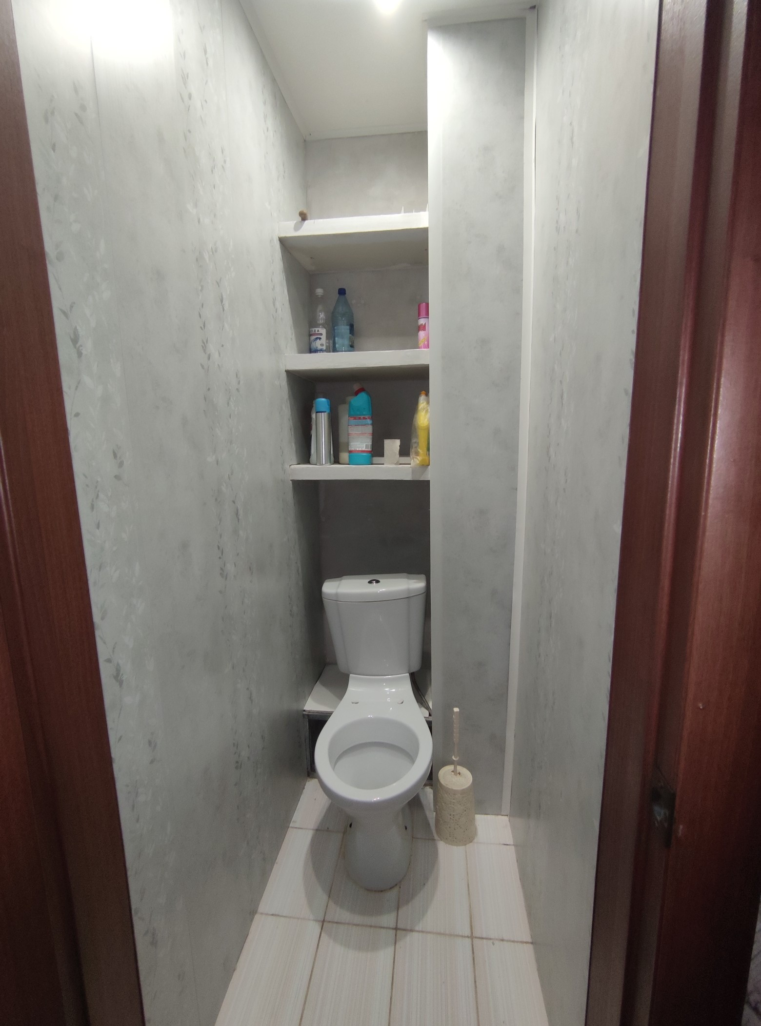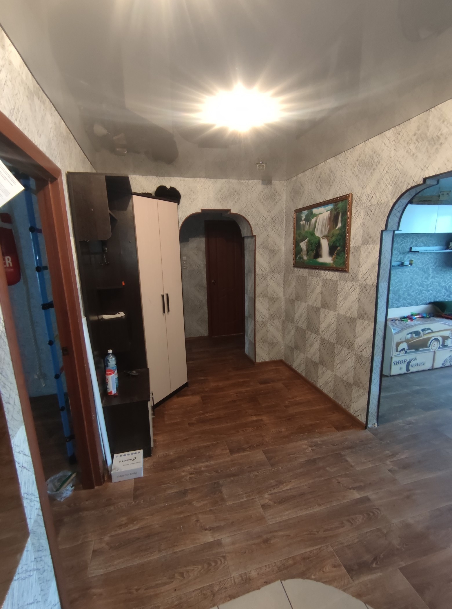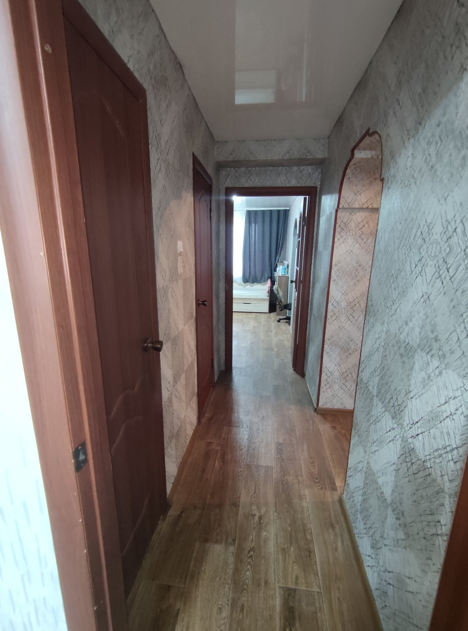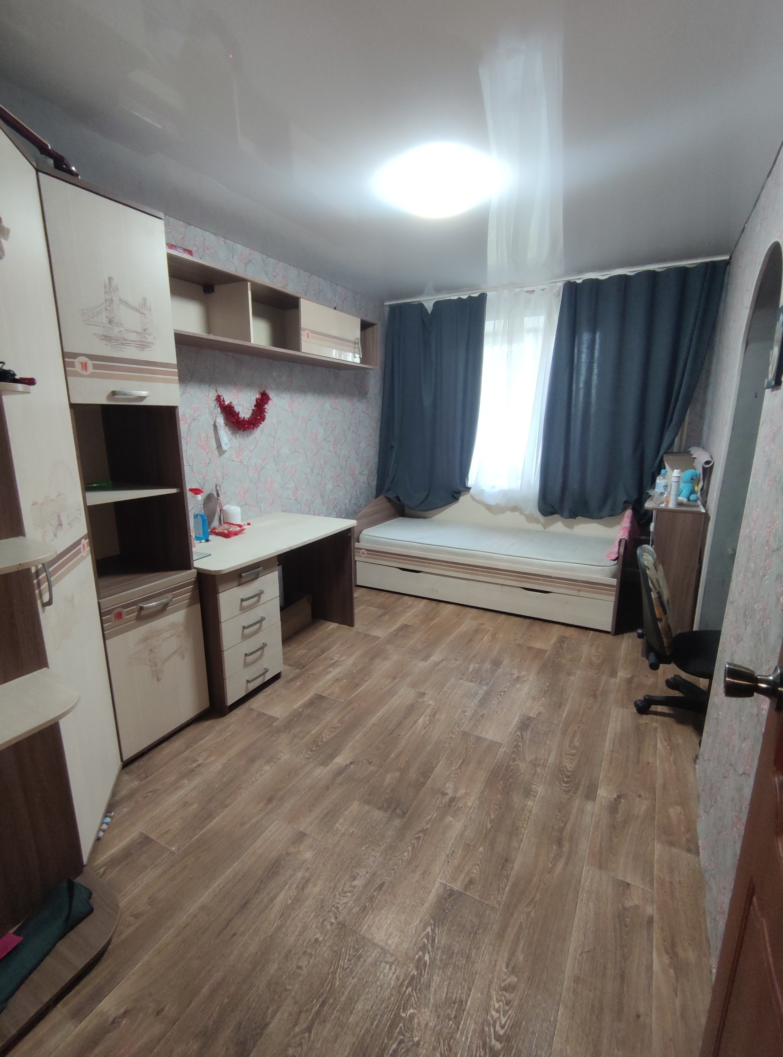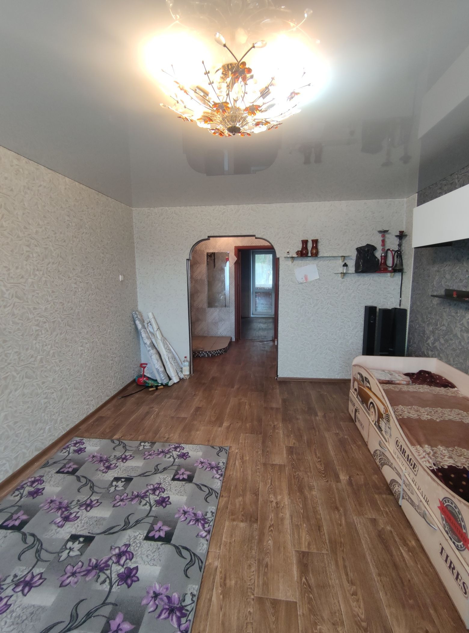 Стены выровнены и  оклеены обоями, потолки во всех комнатах натяжные.Полы старые деревянные убраны, залиты по уровню, сверху положены новые брусья, потом сверху фанера и потом новый линолеум по всей квартире. Есть кладовая. Двери все современные.  Санузел раздельный, стены оформлены панелями ПВХ.                                Остается частично мебель(прихожая,кухонный гарнитур с эл.печью и вытяжкой, в спальне: кровать и шкаф, в детской: шкаф)