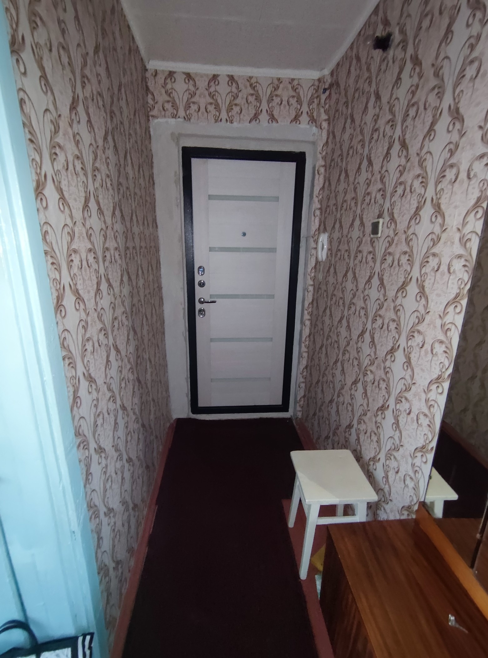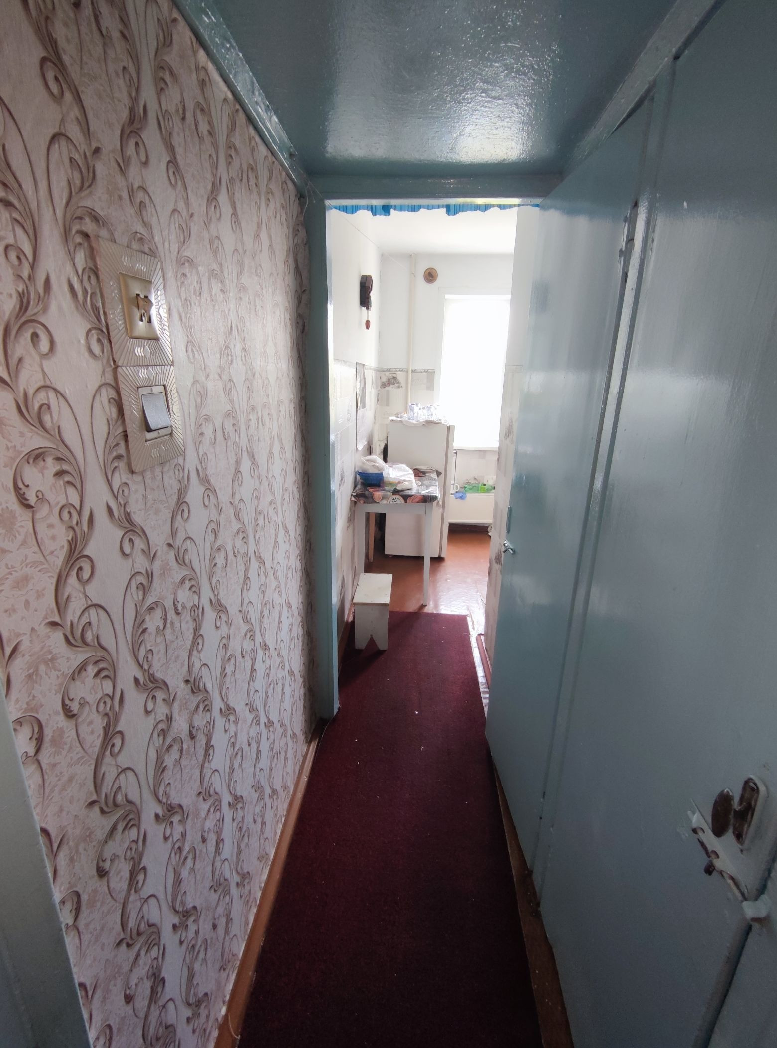 Окна пластиковые в комнате и кухне,в зале деревянный блок. Окна на две стороны дома. Балкона не остеклен. Полы деревянные, стены побелка. Входная дверь современная новая.