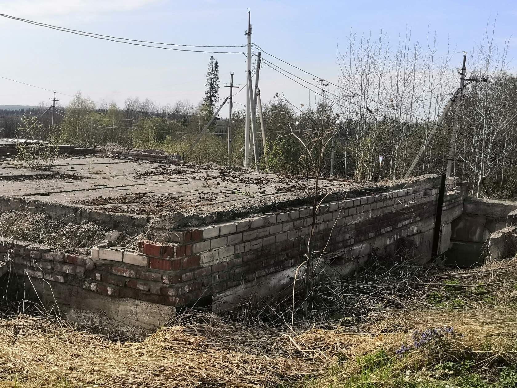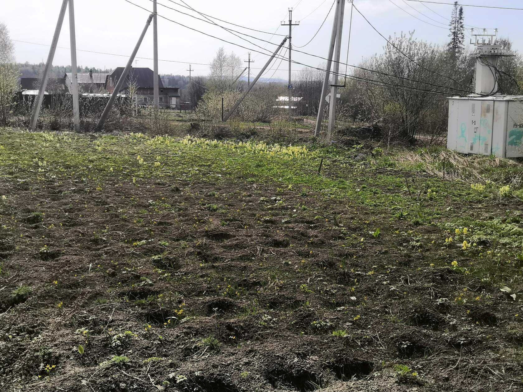 На участке фундамент для строения дома. Земля разработанна, есть кое какие насаждения.