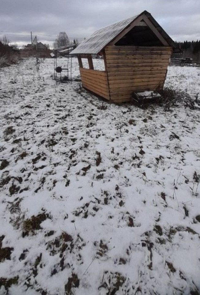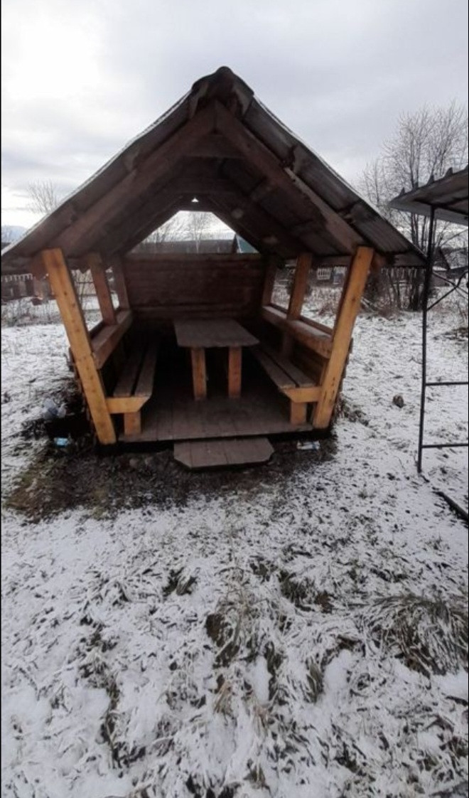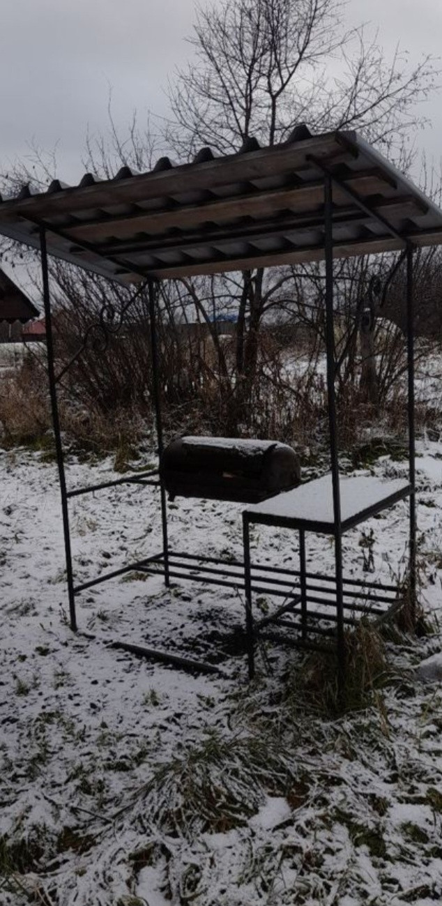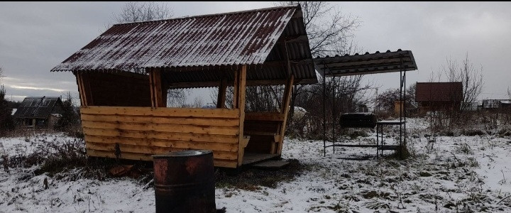 На участке мангальная зона  с беседкой,вагонетка.