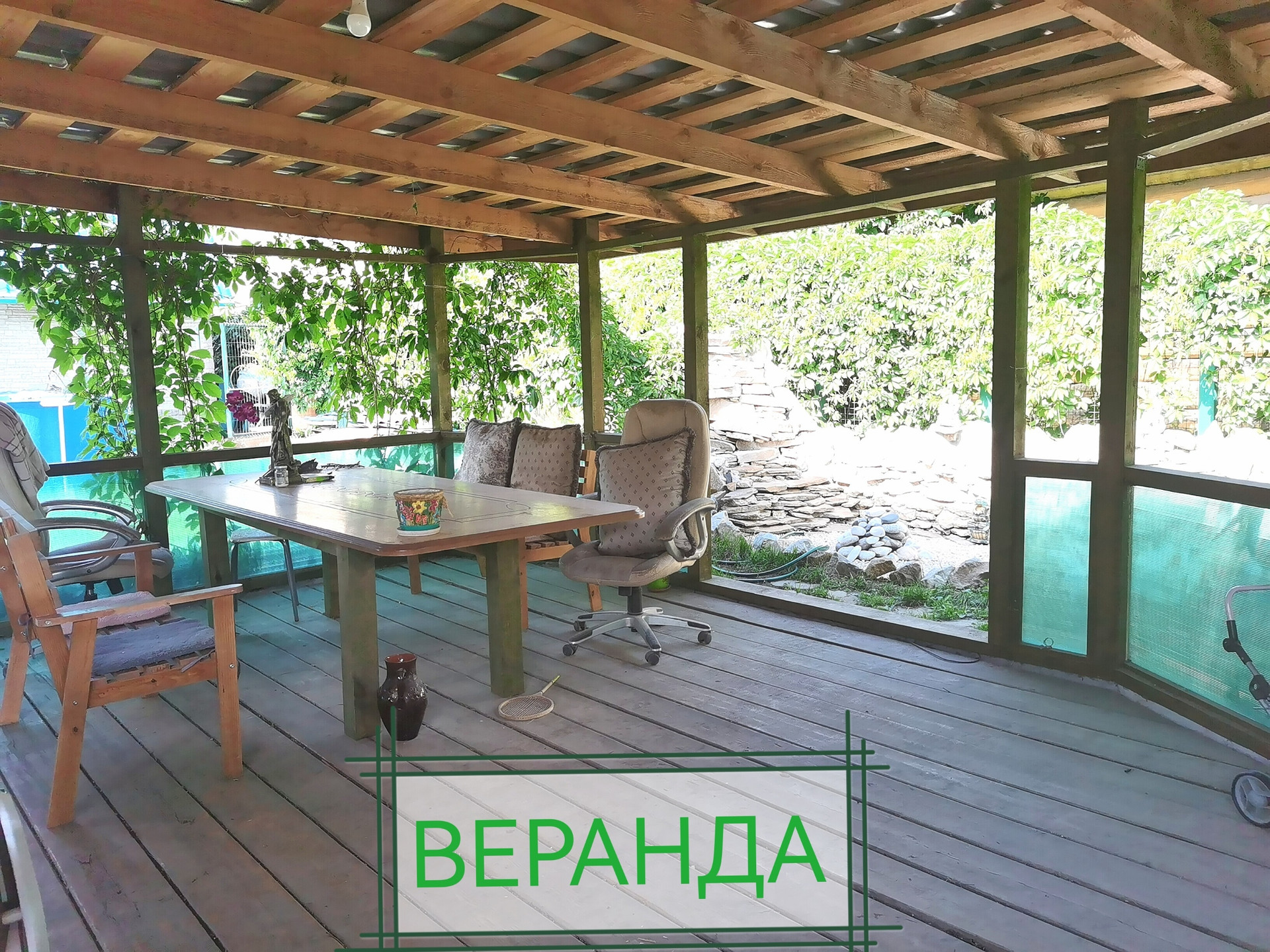 ВЕРАНДА (5*7м): на фундаменте из массива дерева + поликарбонат, крыша из металлочерепицы.