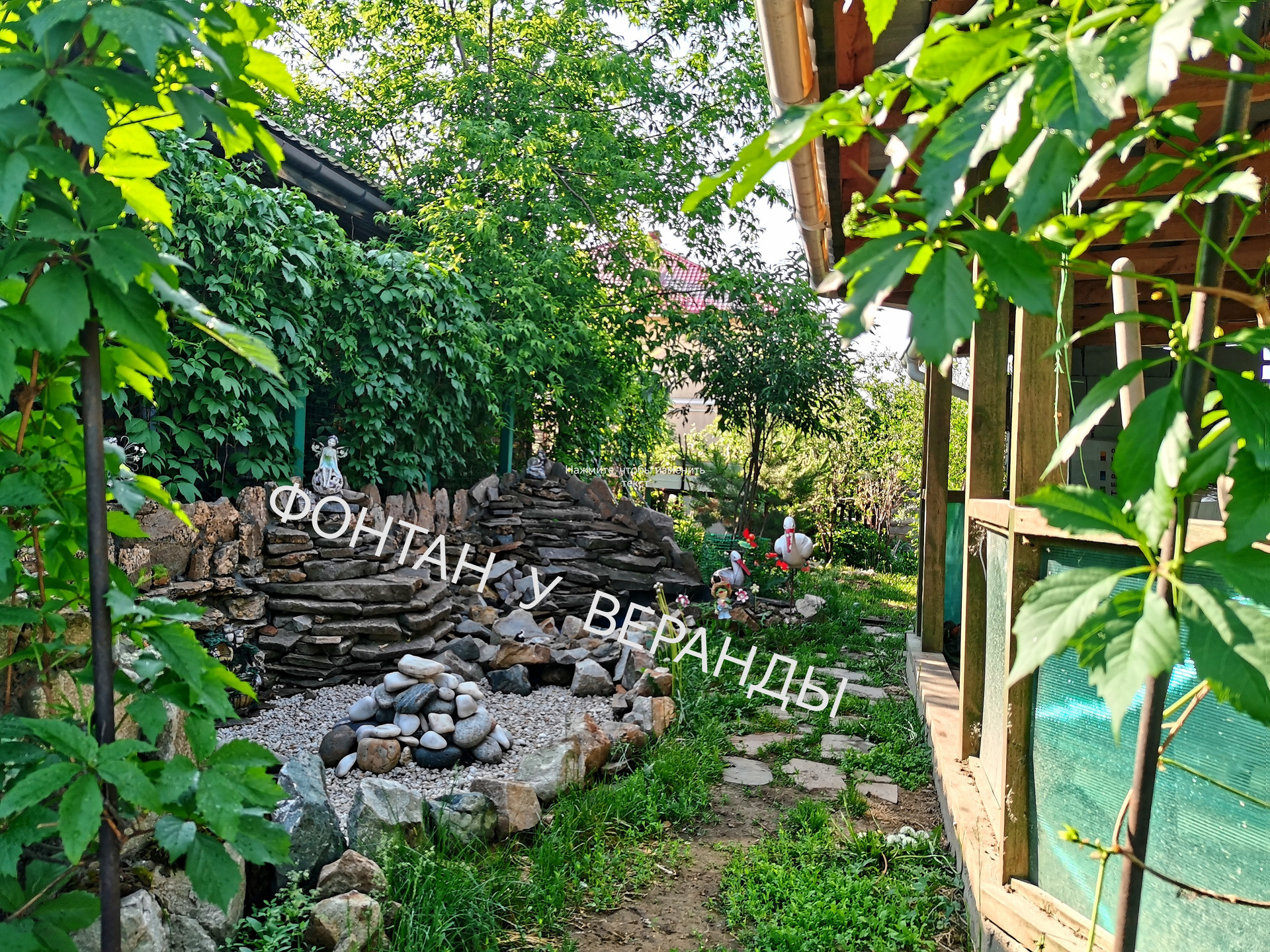 ФОНТАН: длиной 7 метров из камней, с большой голубой чашей, спасает в жару.