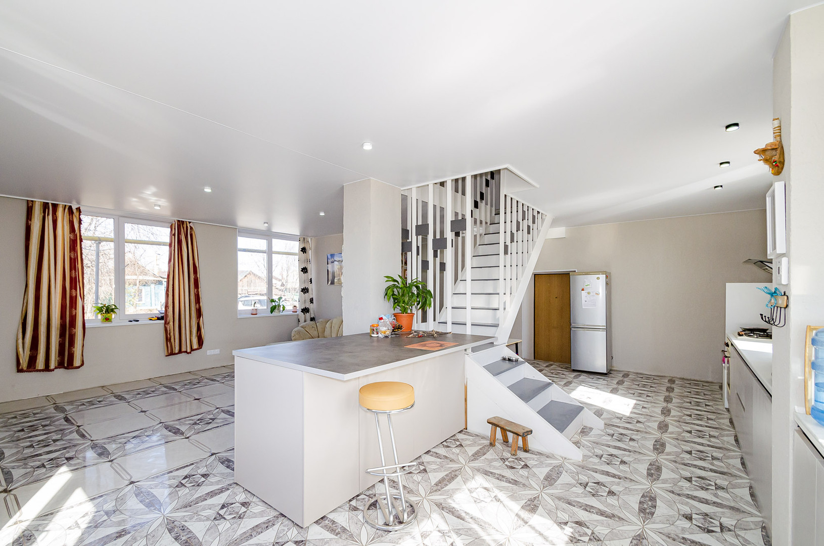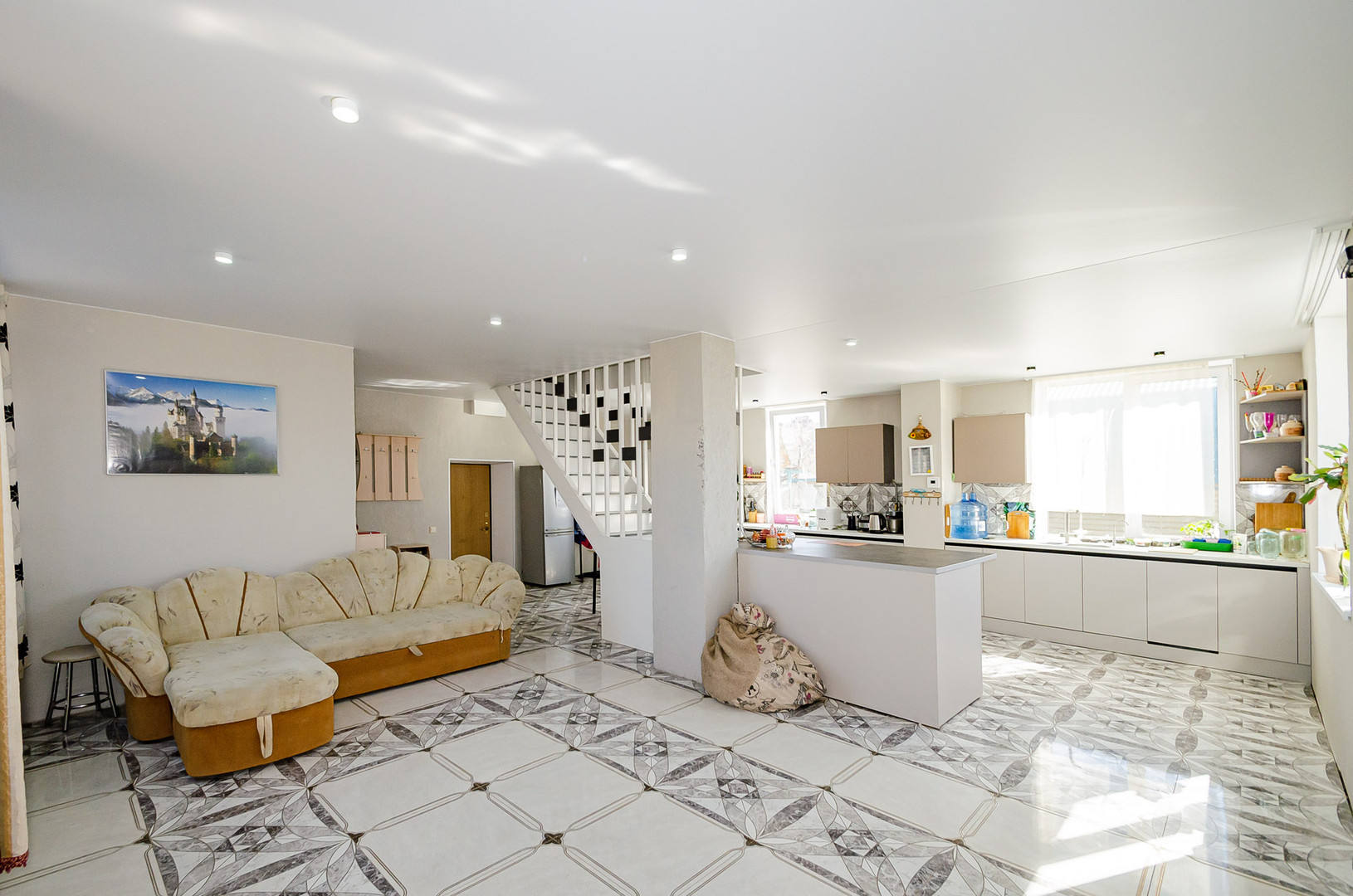КОТТЕДЖ (123 кв/м) : на 1-ом этаже - большая гостиная, туалет, прихожая. напольная кафельная плитка с системой теплого пола и лестницей на 2-ой этаж, бонусом оставляем - крашенную кухню и красивый остров.
