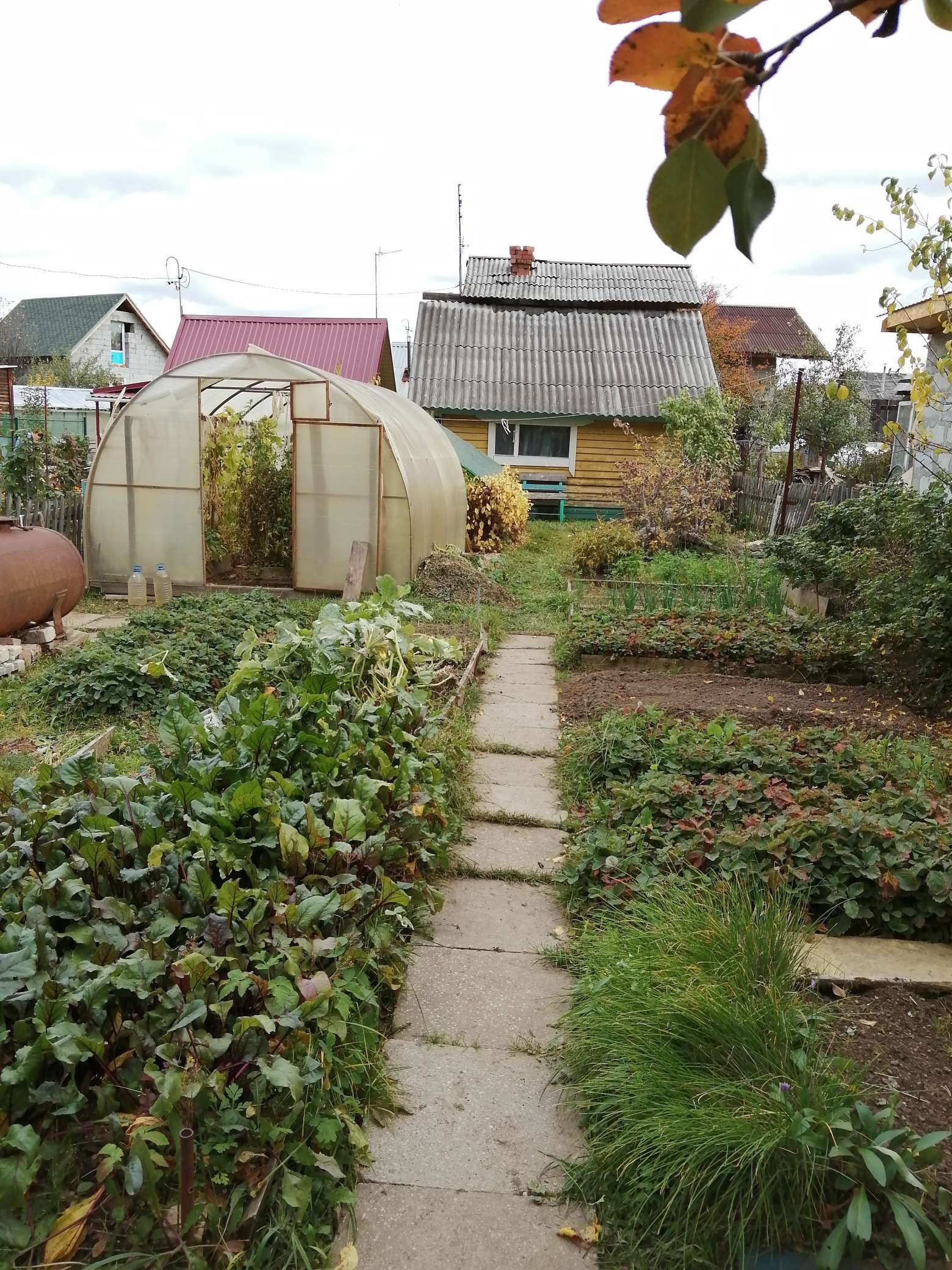 Беседка для отдыха, теплица, емкость для воды. Два места для парковки авто, одно из них под навесом.