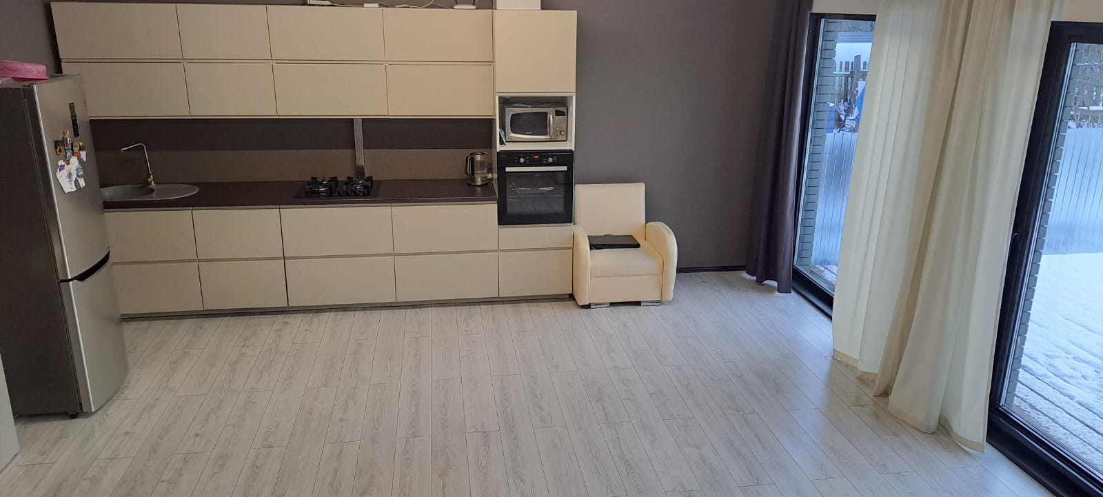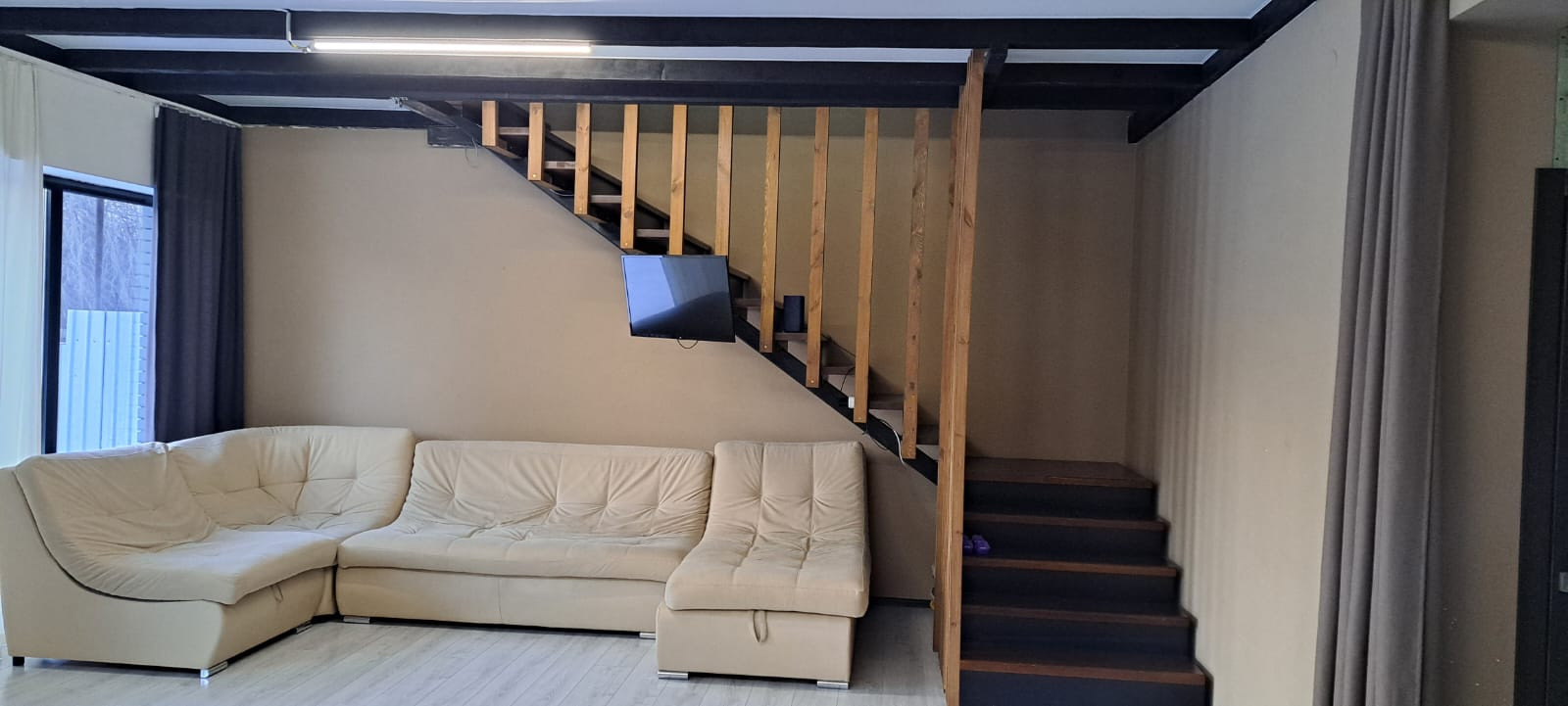 Дом общей площадью 150 кв.м. был построен с любовью и вниманием к деталям. Первый этаж включает в себя бойлерную, прихожую, санузел, спальню и кухню-гостиную с панорамным остеклением. Особенностью этого пространства является выход на большую террасу. По всему первому этажу проведены теплые полы для вашего комфорта. Второй этаж представляет собой свободную планировку, что дает вам возможность реализовать свои идеи и мечты.