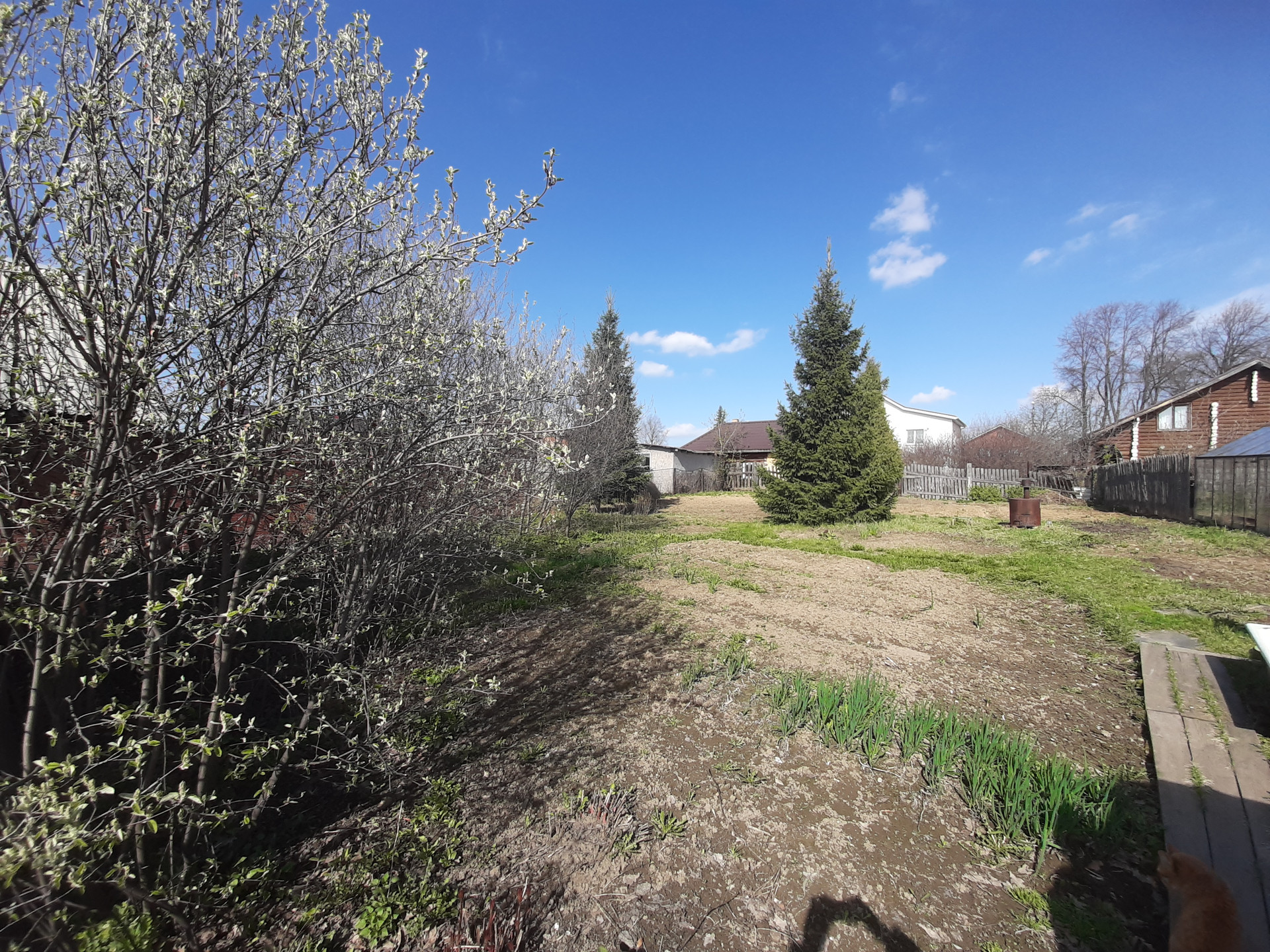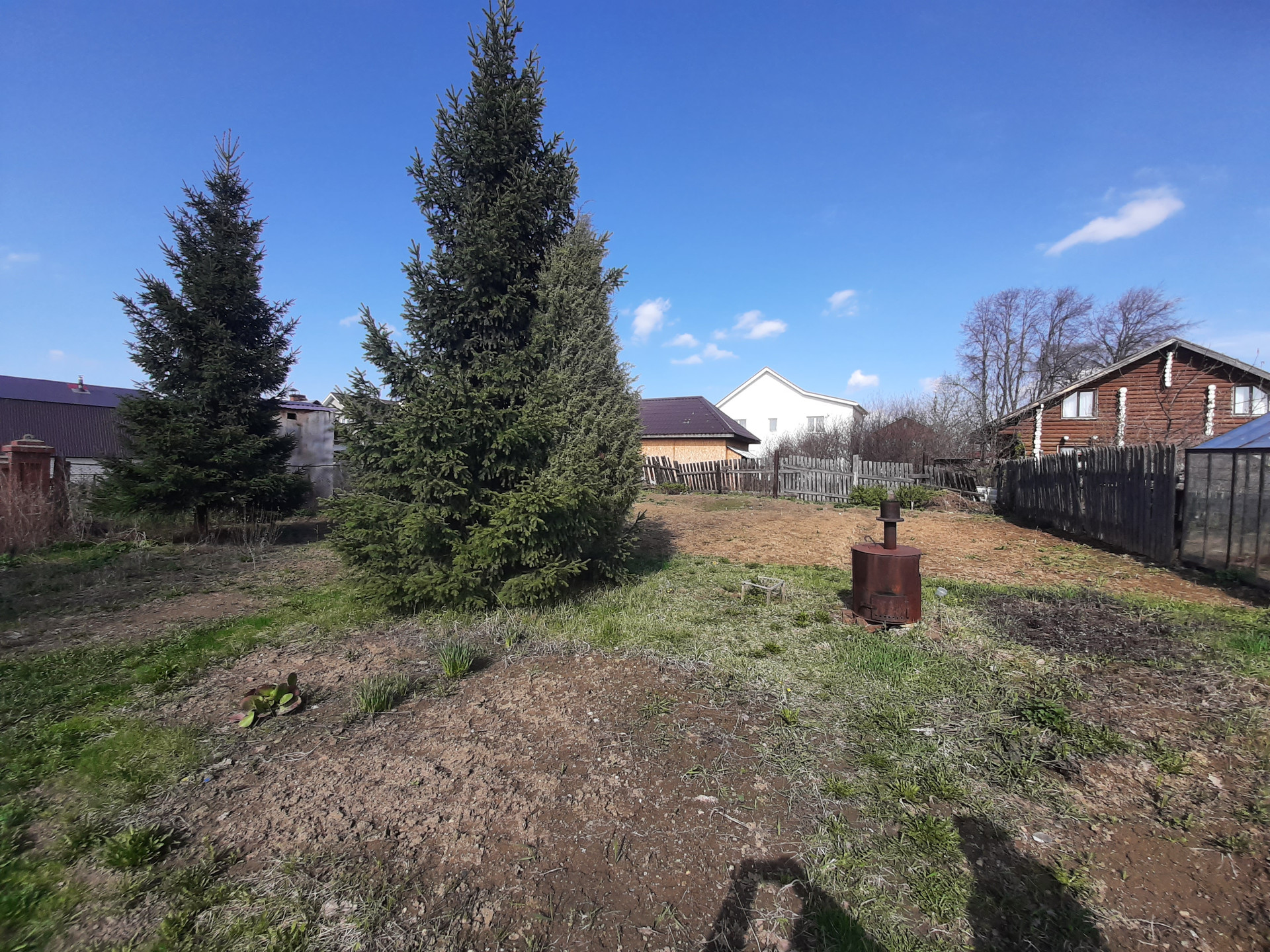 Участок правильной формы, разработан и с многолетними насаждениями: ели, вереск, ярга, вишня, смородина, крыжовник, слива. Для удобного полива есть летний водопровод.