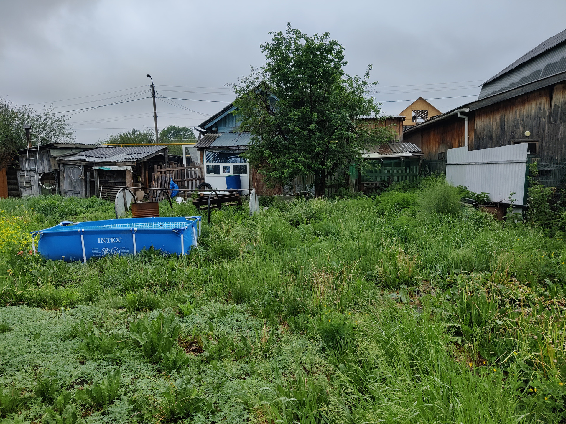 На участке вишня, две яблони.
