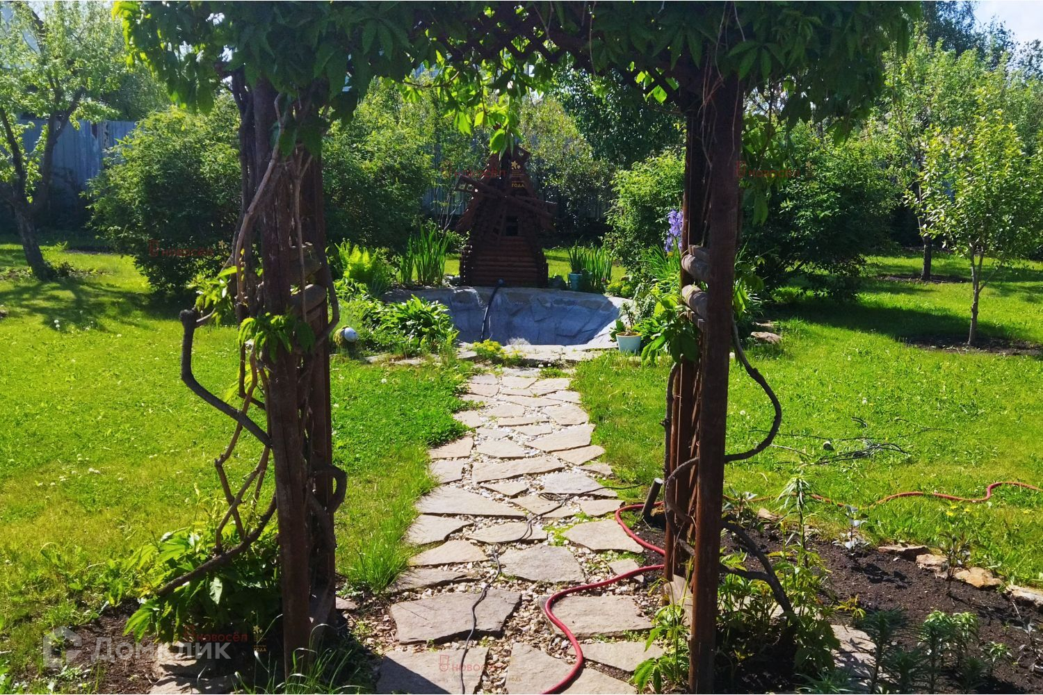 На участке теплица 8м., каркасный дом для хоз нужд и территория с ландшафтным дизайном.