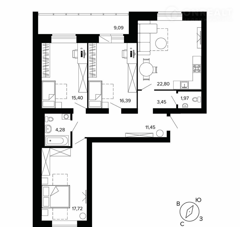Площадь кухни 22.8 м2