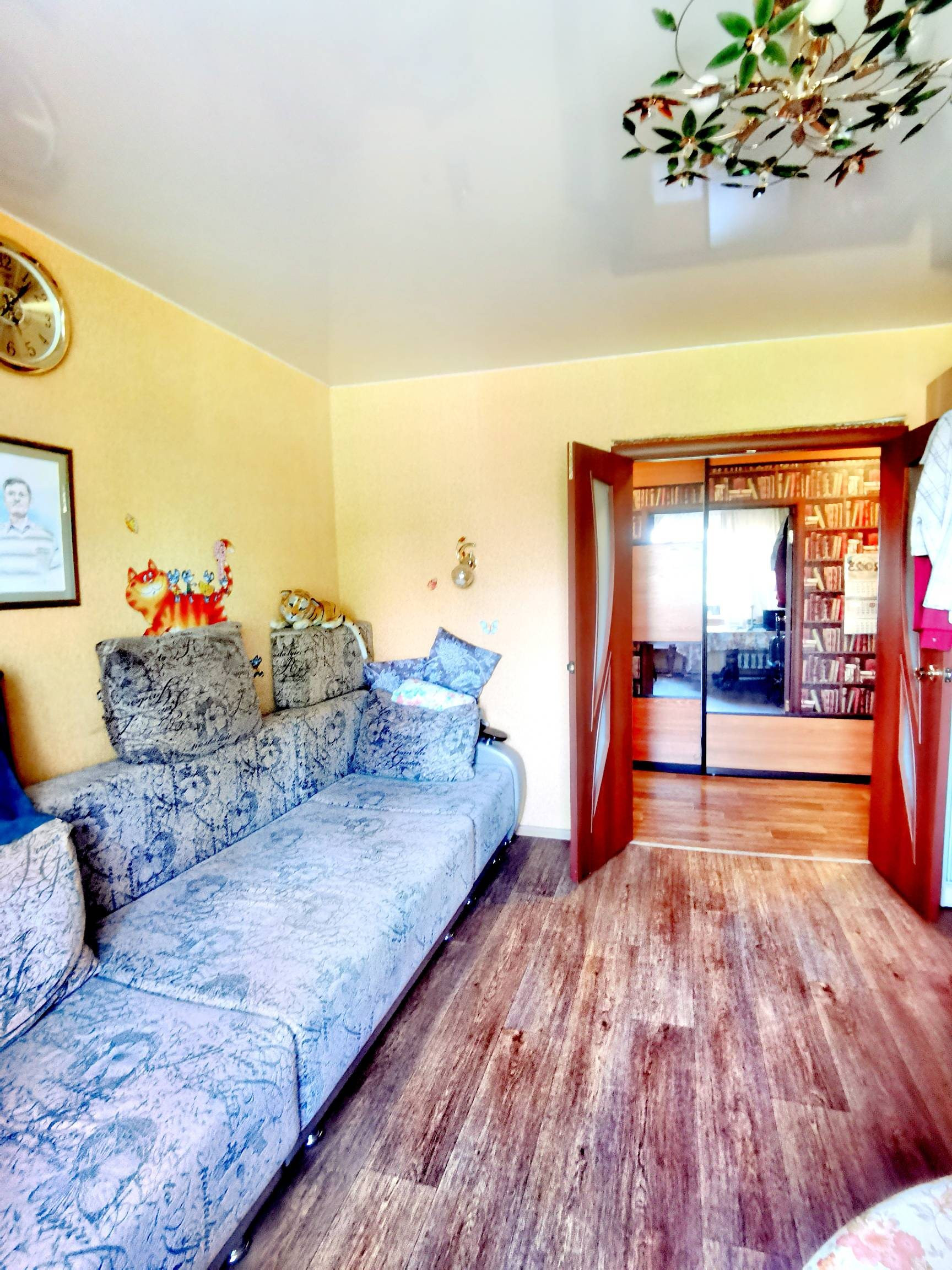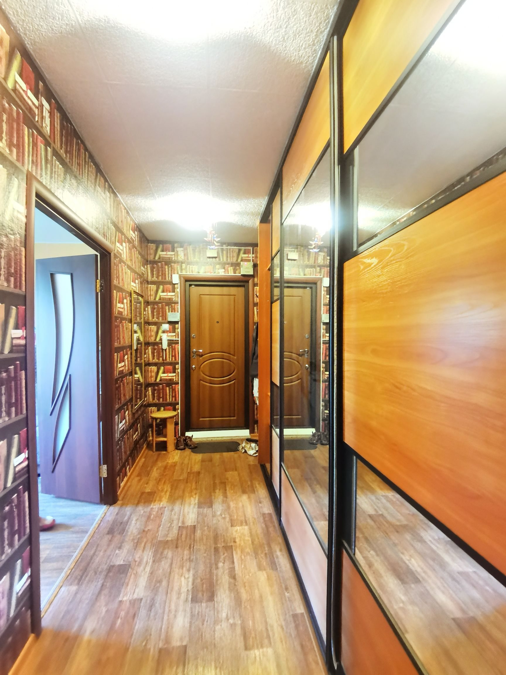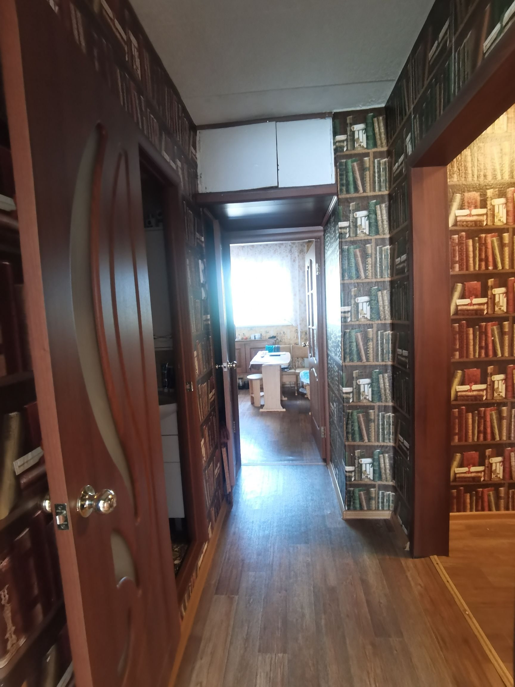 Стены выровнены и  оклеены обоями, потолки выровнены. Полы ровные, во всех комнатах линолеум. Есть кладовая. Двери все современные.