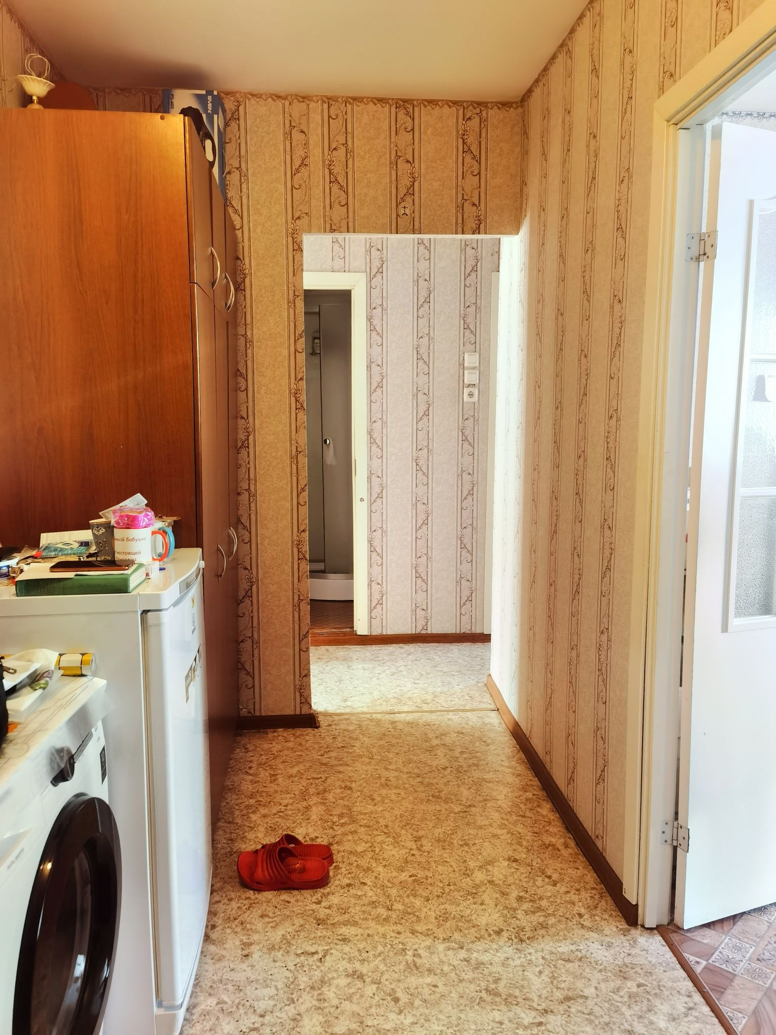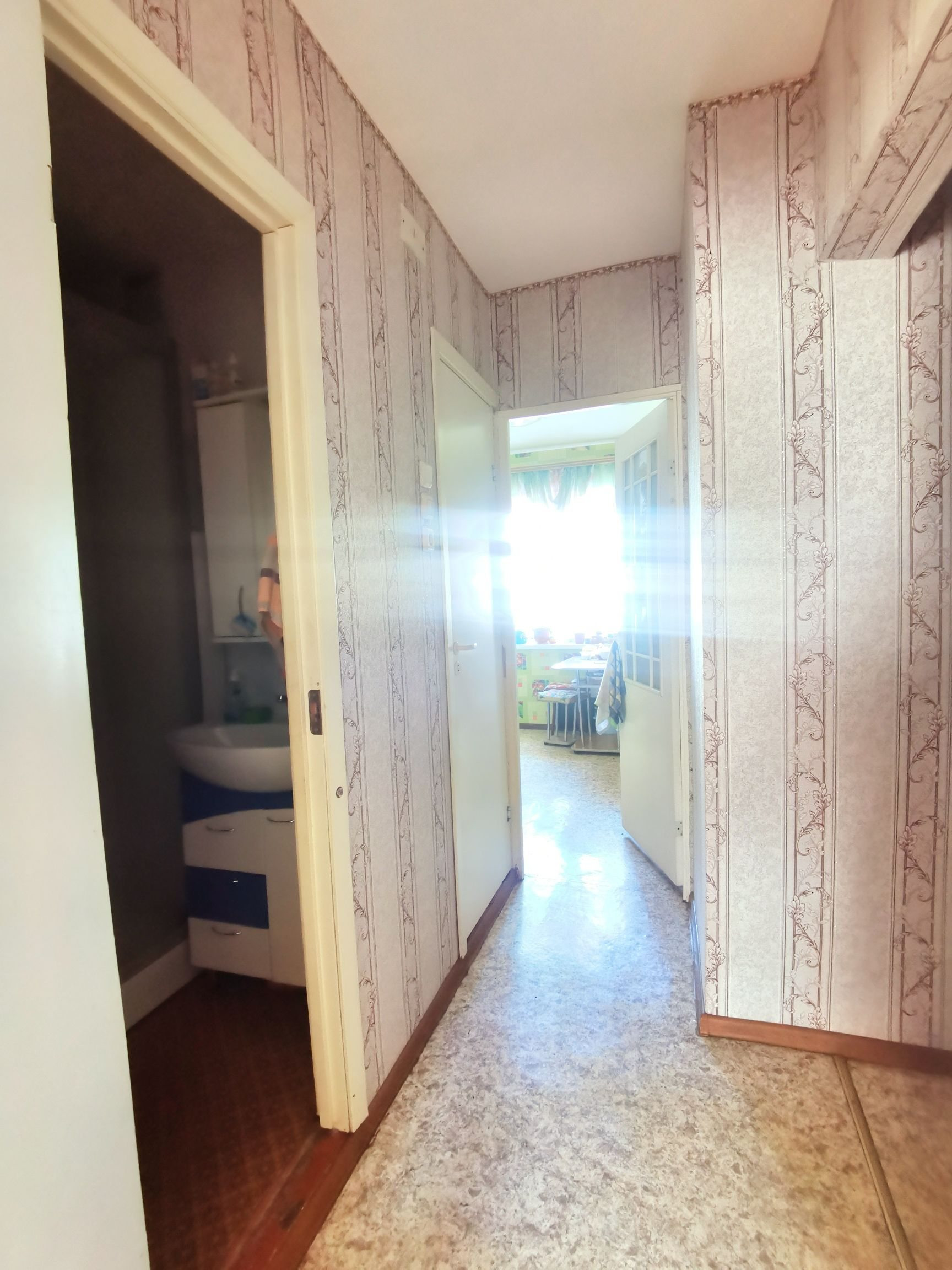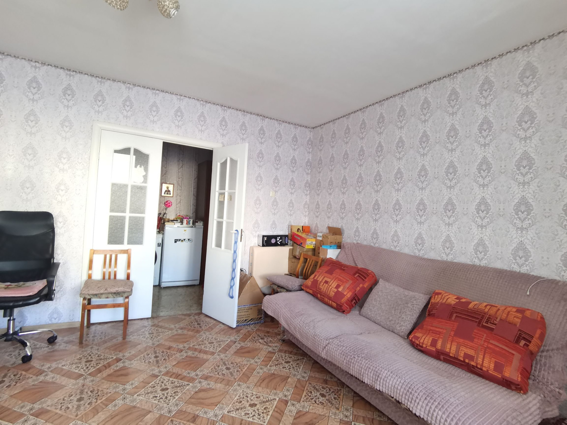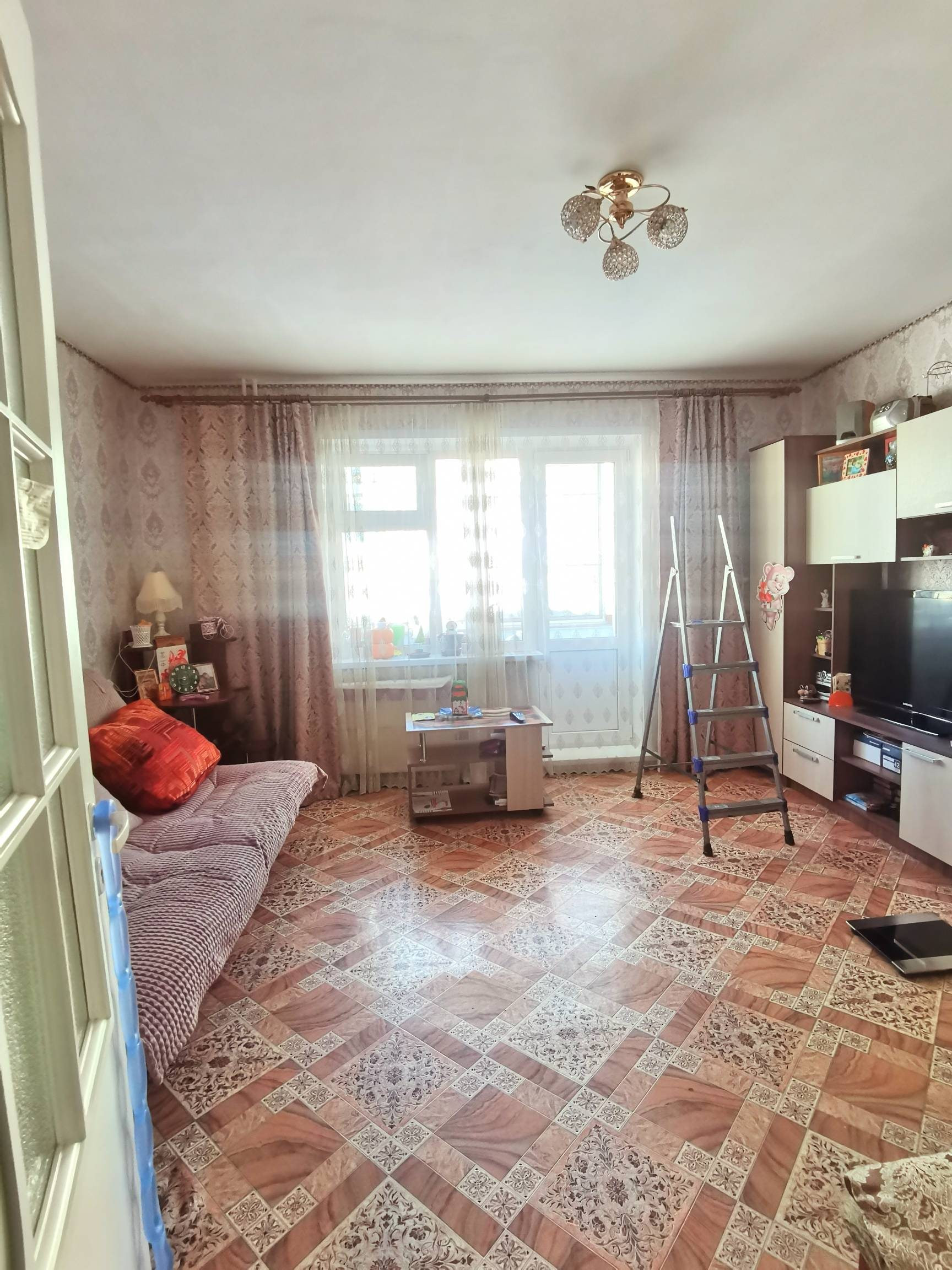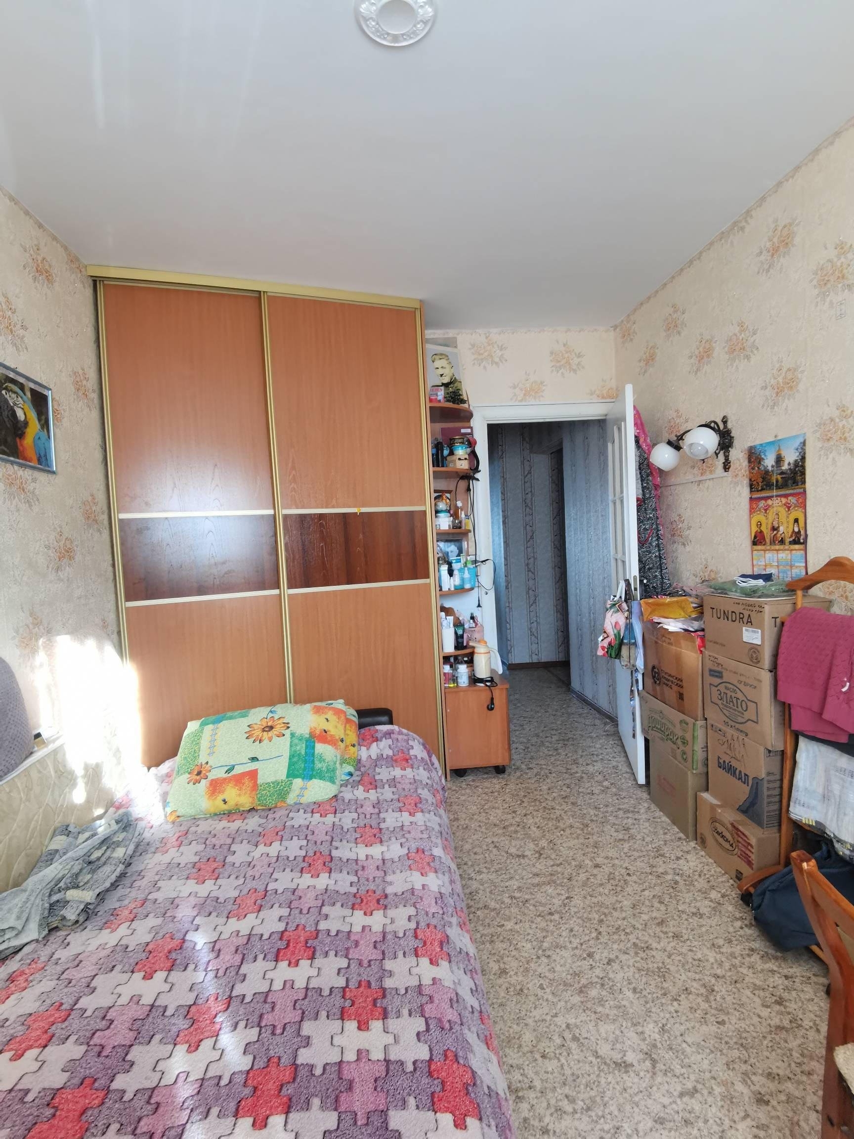Окна пластиковые. Балкон остеклен пластиком. На полу линолеум, потолки и стены выровнены. В спальне встроенный шкаф.
