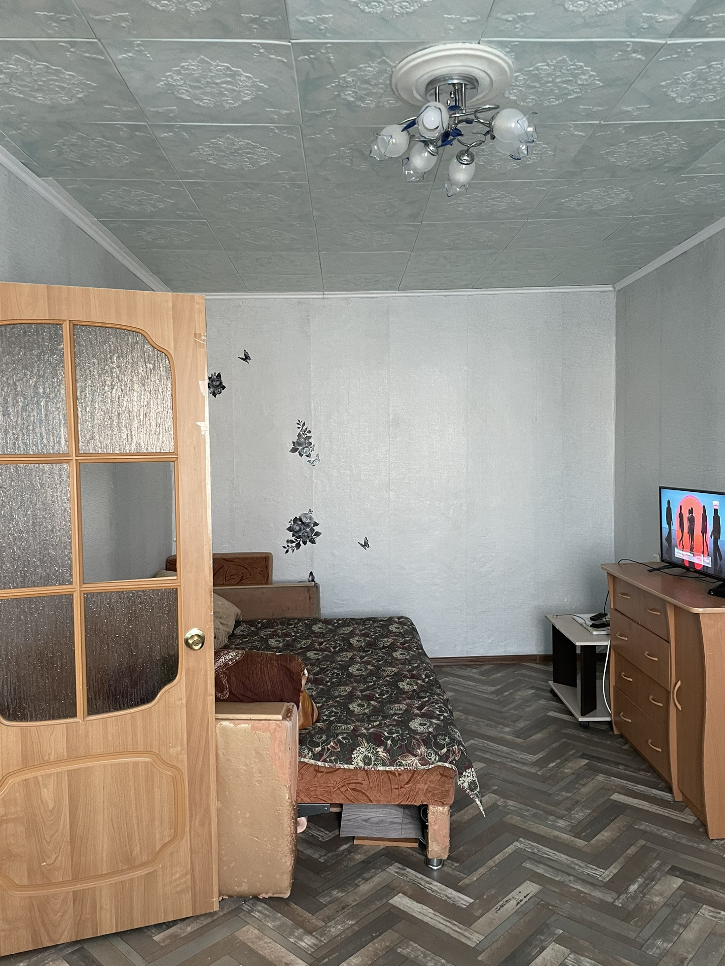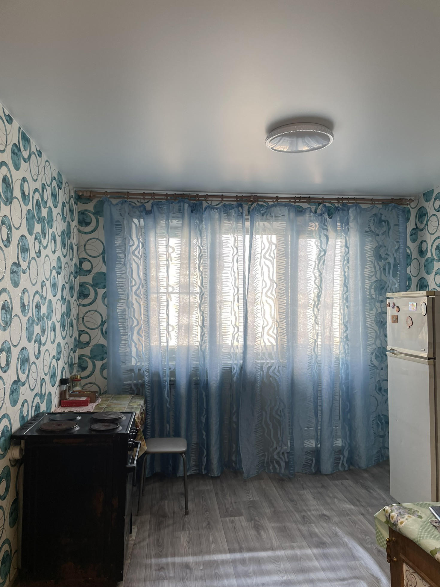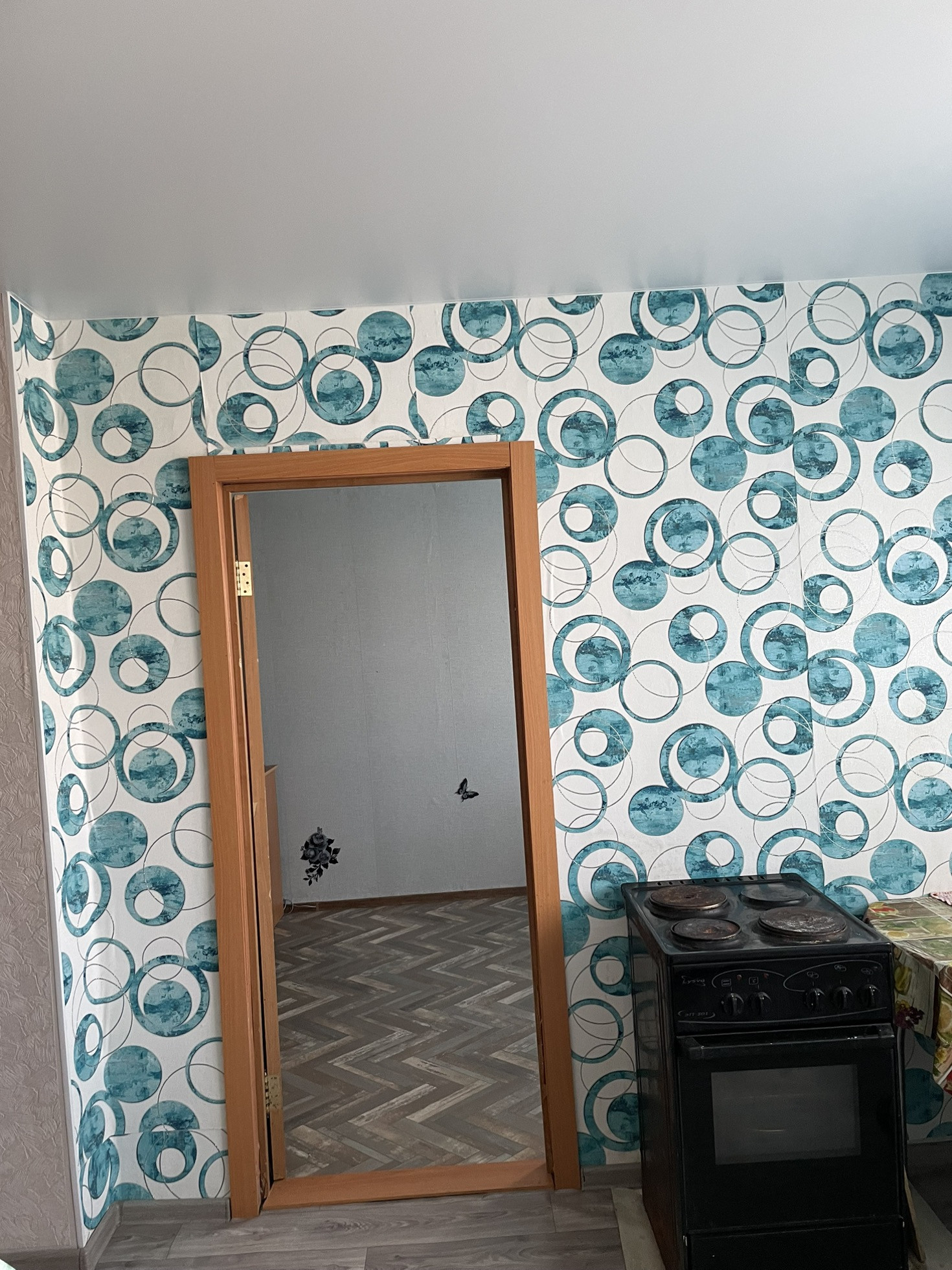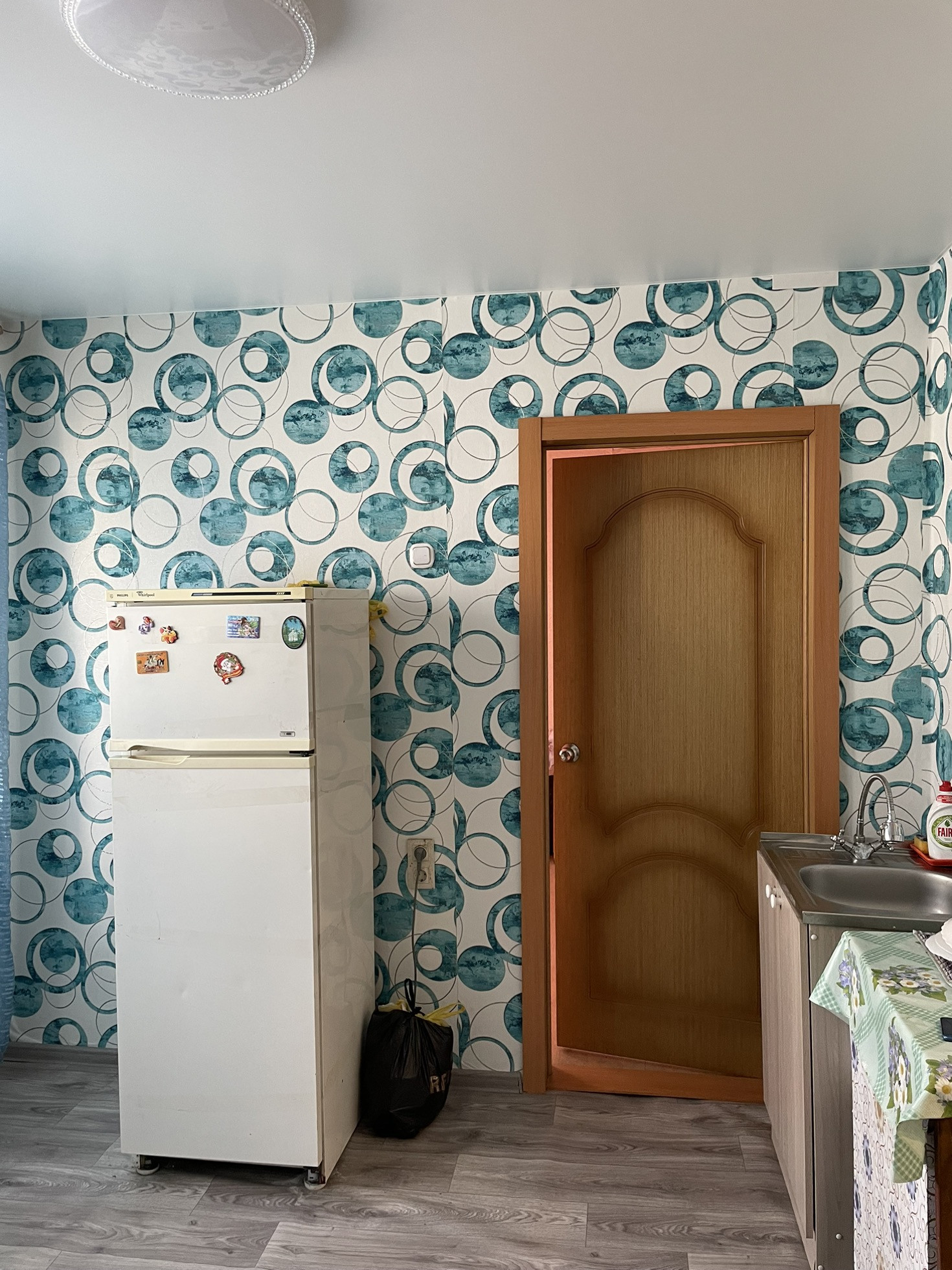 Стены  оклеены обоями, потолки натяжные. Двери современные. На полу линолеум.