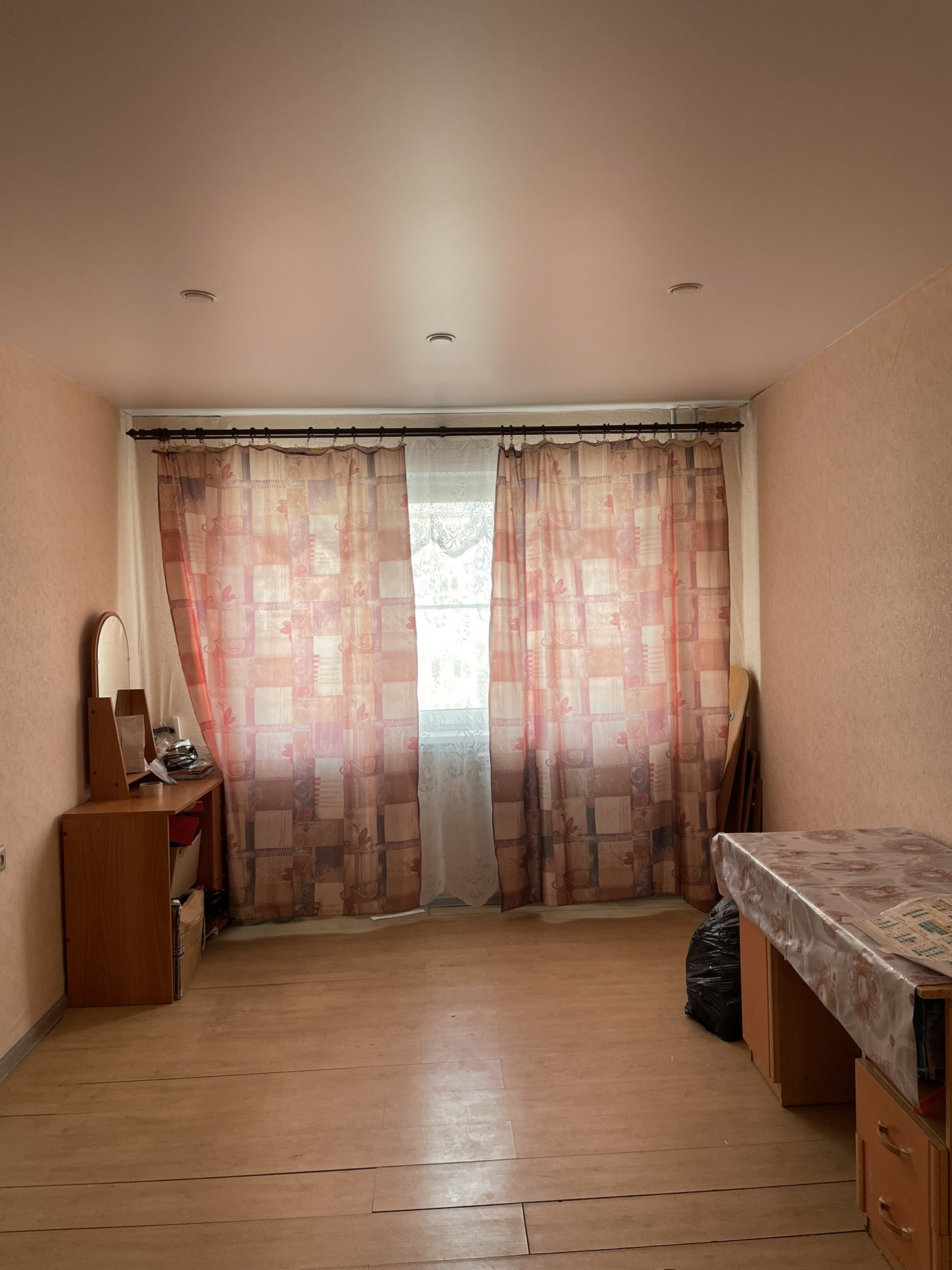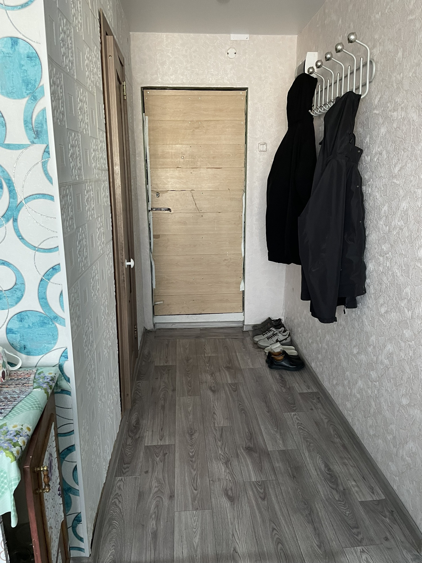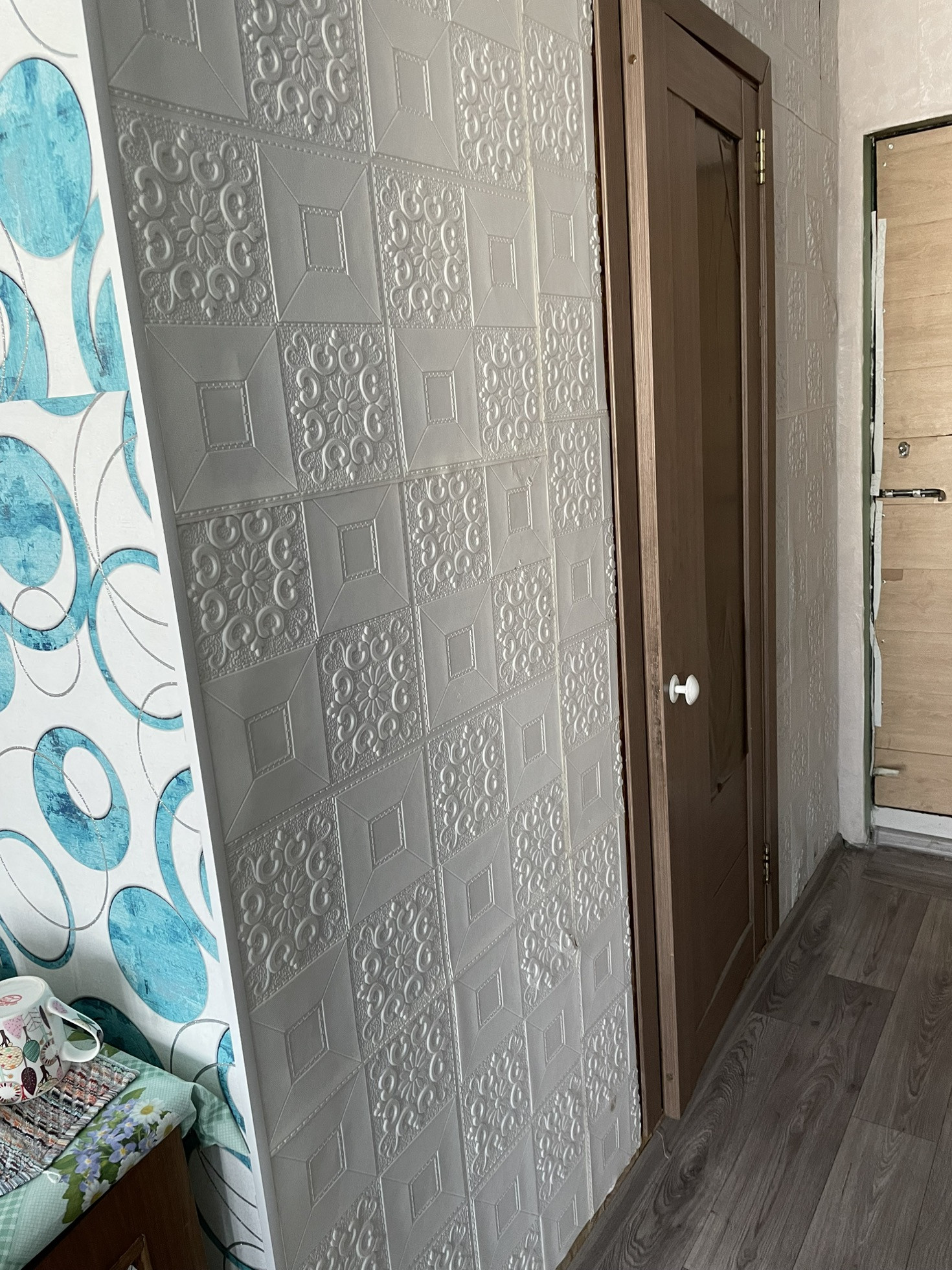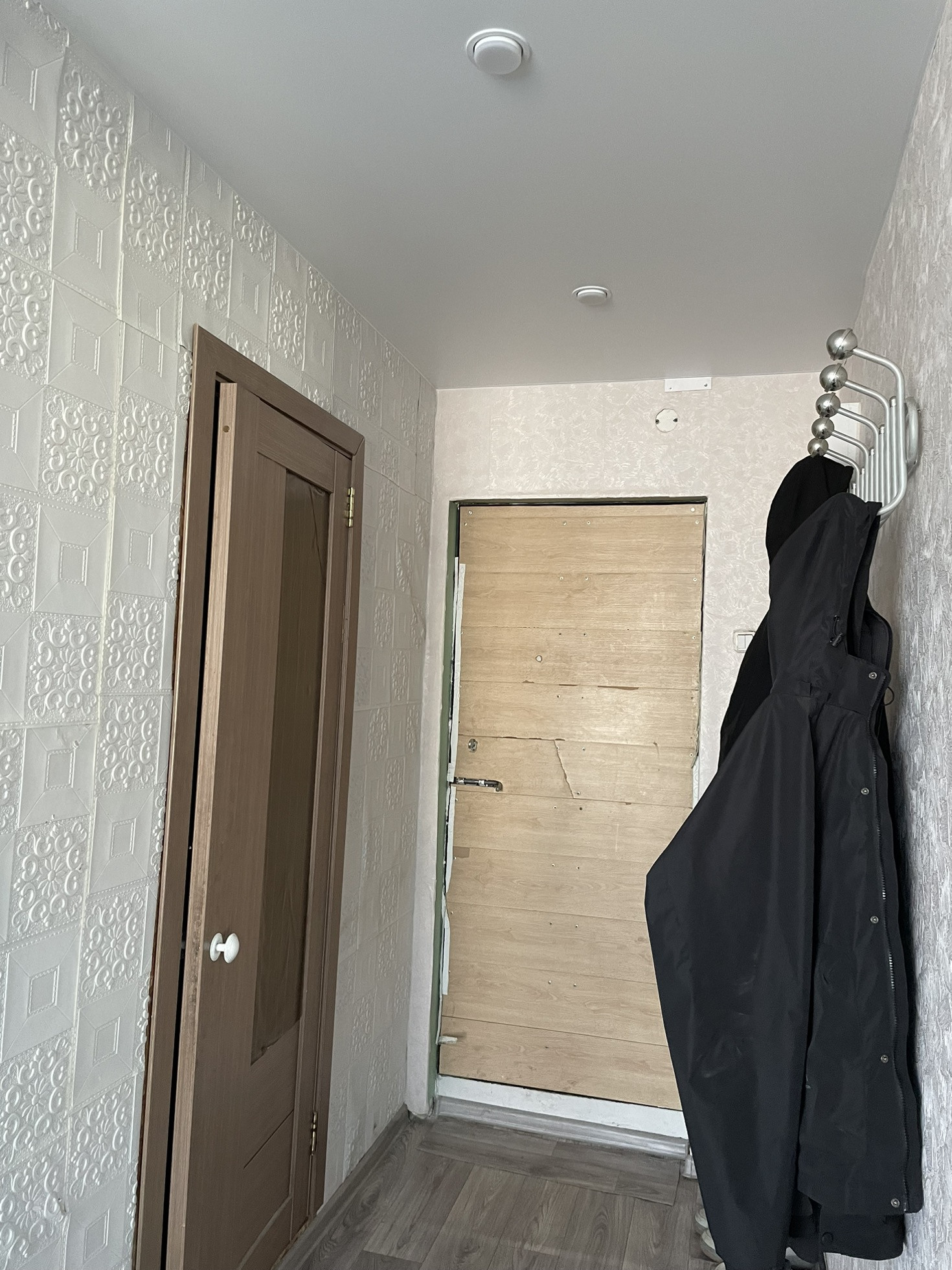 Стены  оклеены обоями, потолки натяжные. Двери современные. На полу линолеум.