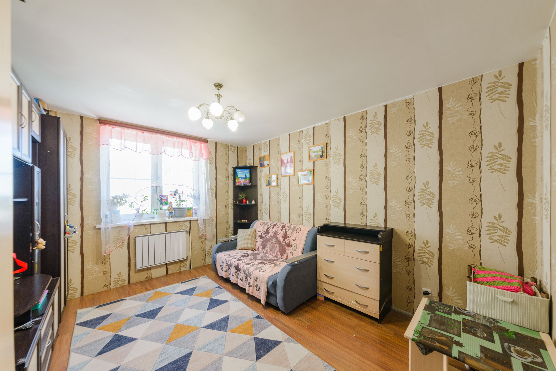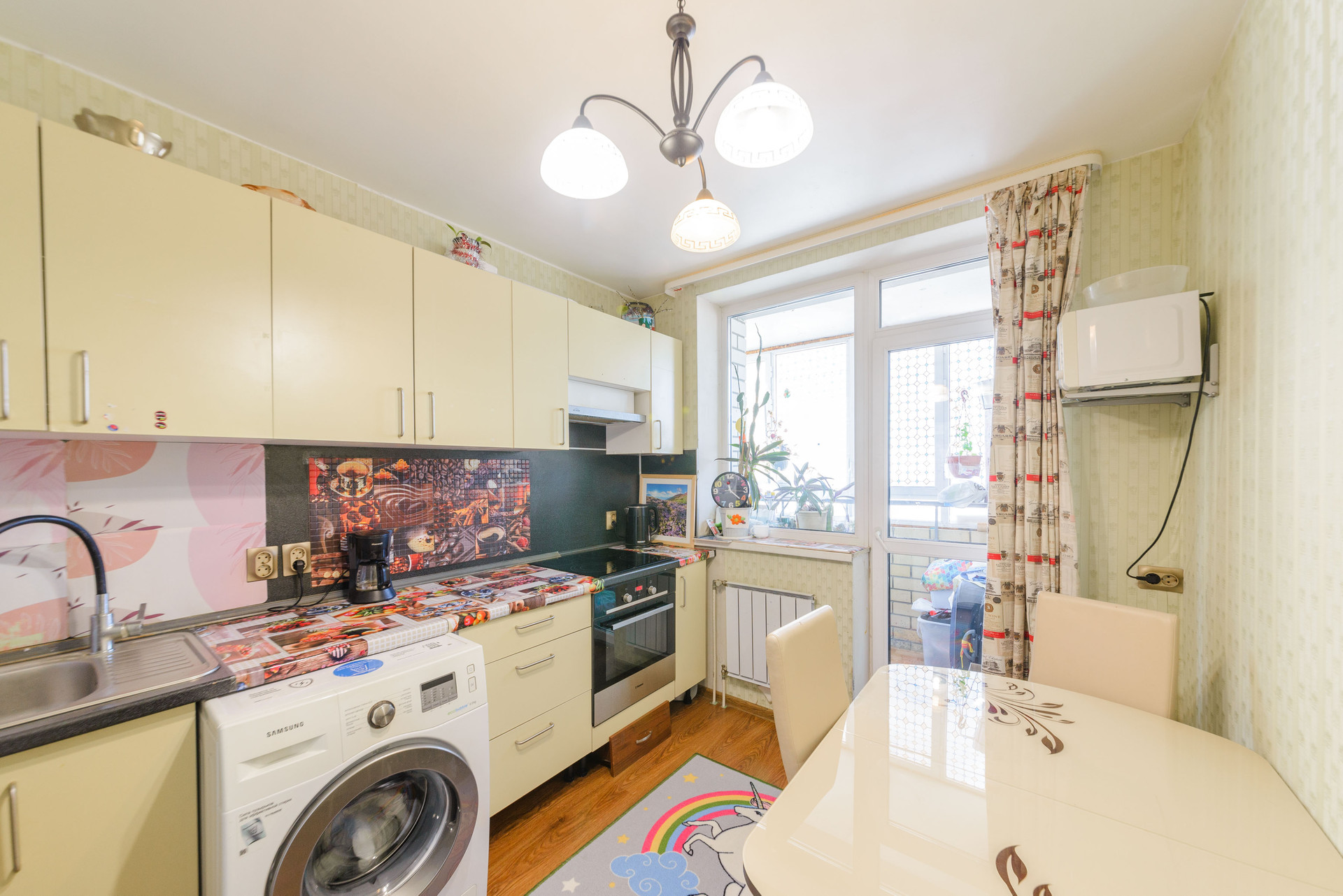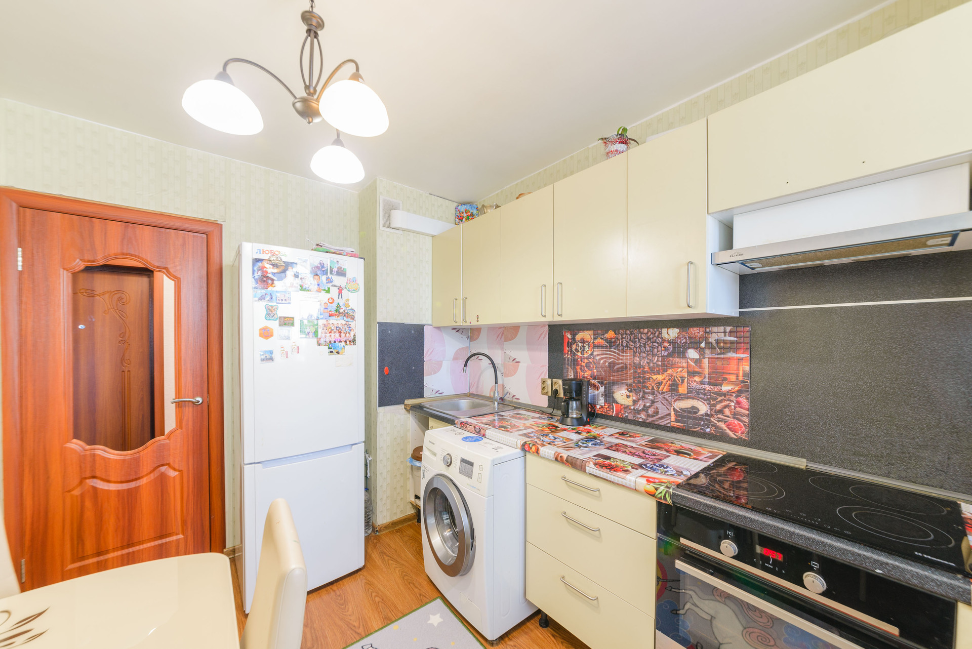 Покупателю в подарок остается кухонный гарнитур с техникой ( холодильник, духовой шкаф, варочная поверхность, вытяжка, стиральная машина), шкаф в коридоре, две стенки, диван.