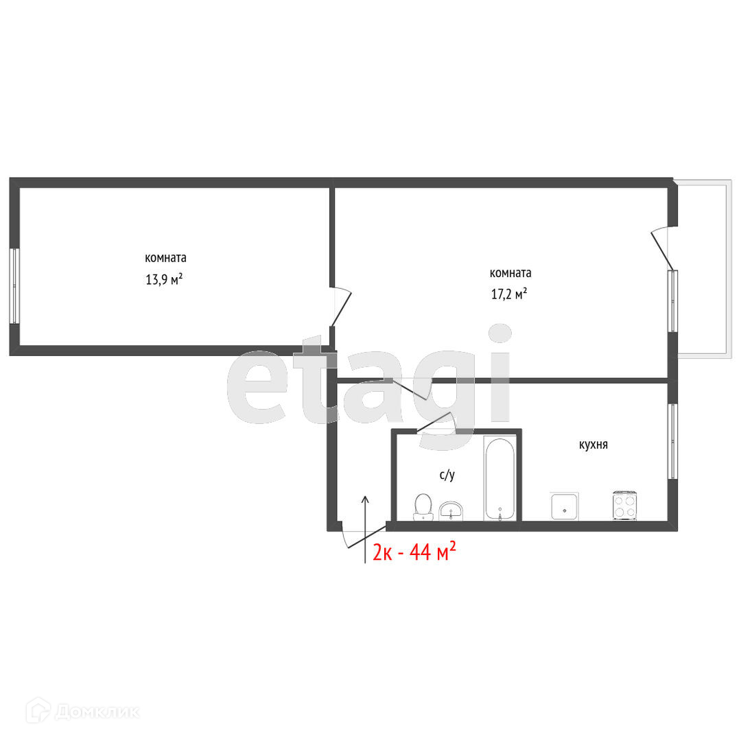 Общая площадь 44.3 м2