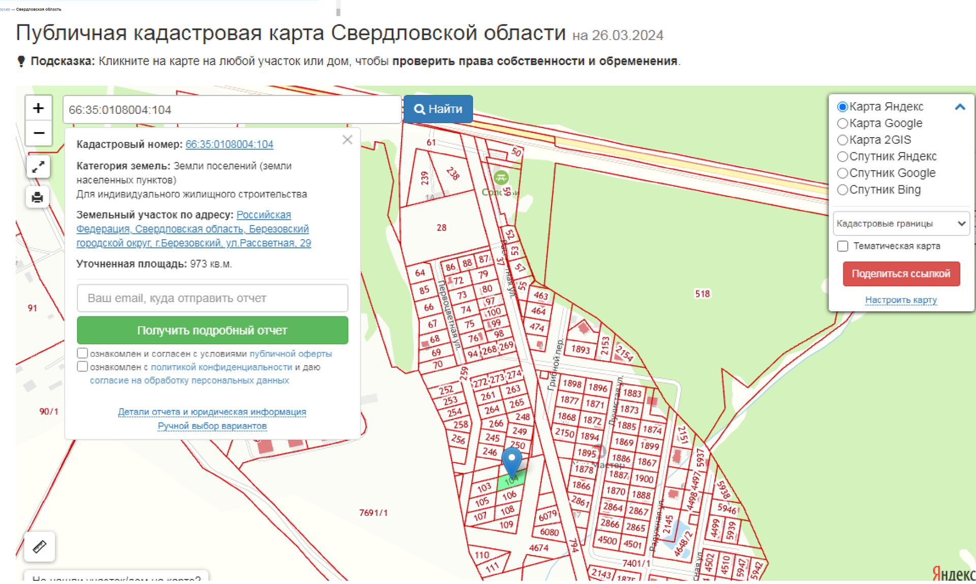 Категория земель: Земли населенных пунктов, разрешенное использование: Для индивидуального жилищного строительства.  Земля в собственности. Кадастровый номер 66:35:0108004:104.