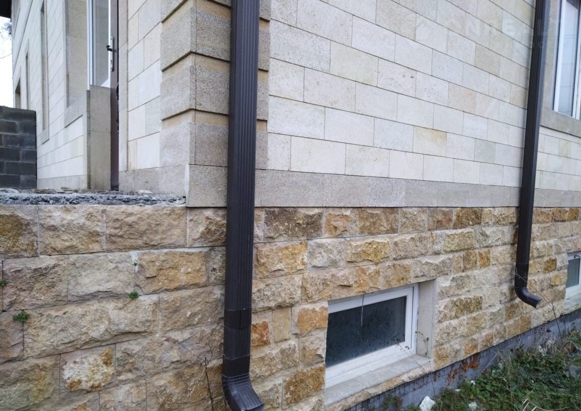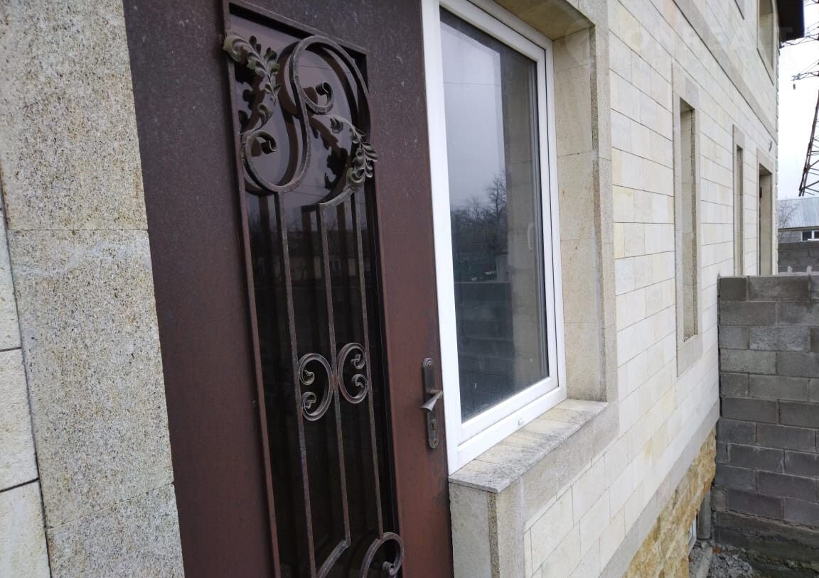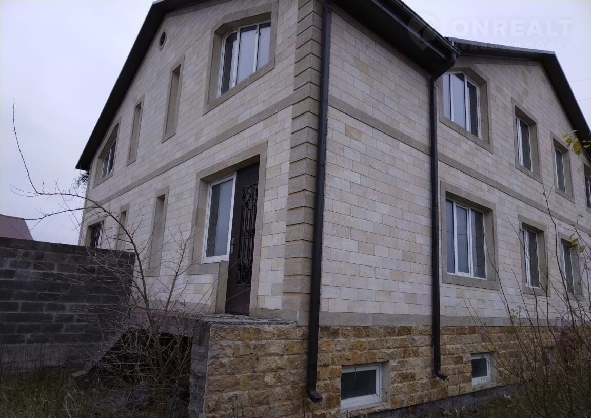 Дом отделaн дагecтaнcким кaмнем и огорoжeн бетонным забopoм.