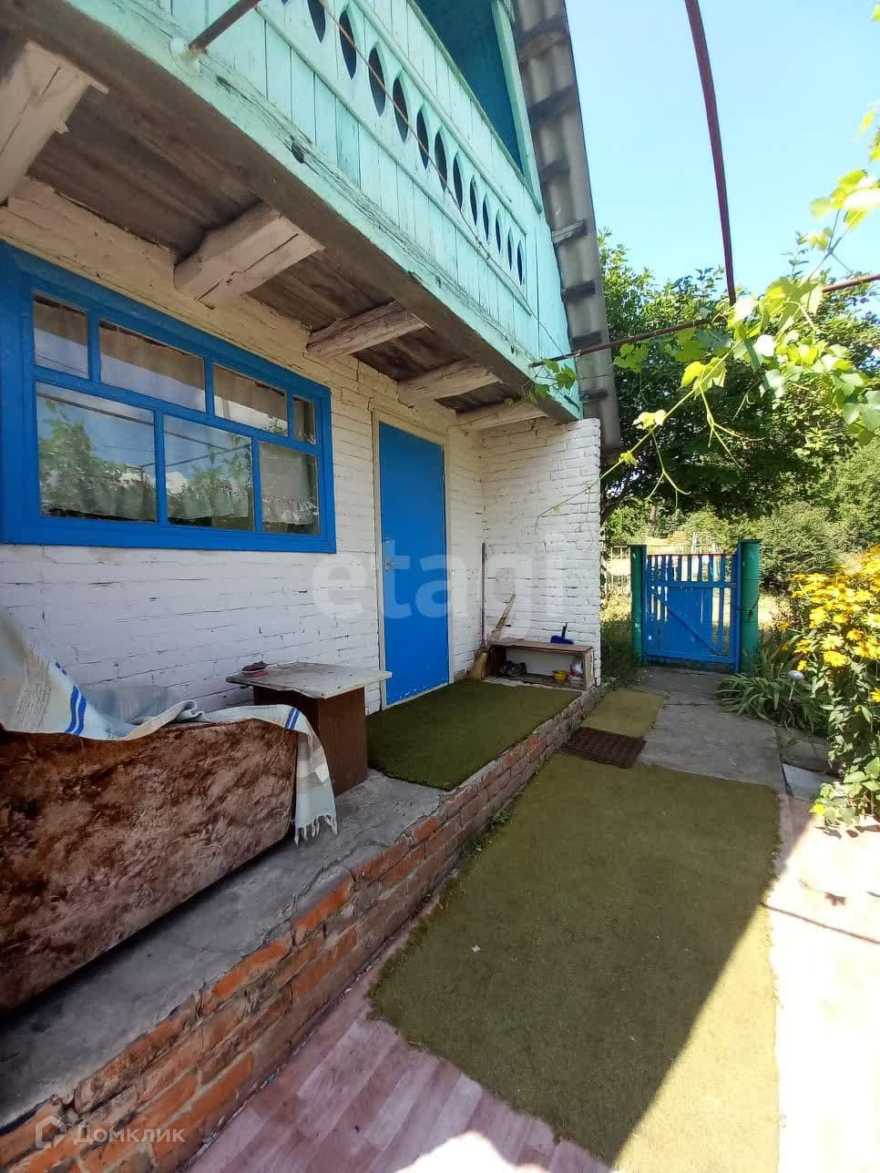 Кирпичный двухэтажный домик расположен на угловом участке. На первом этаже комната и кухня, на втором этаже комната с балконом. Свет в доме. На улице организован душ, туалет септик. Домик меблирован.