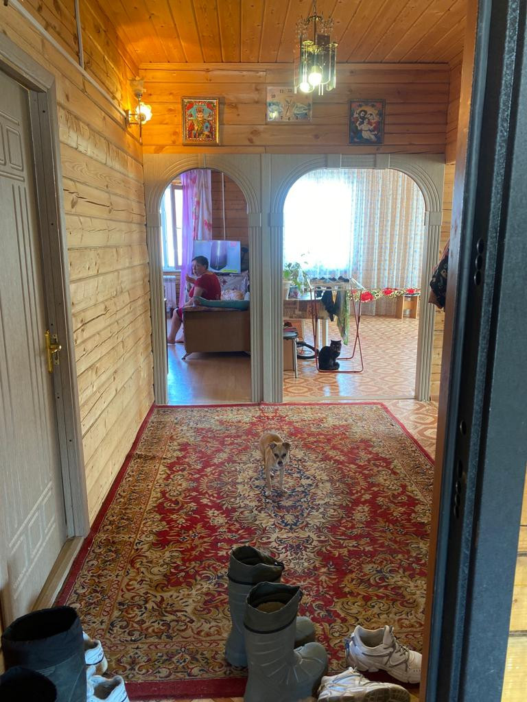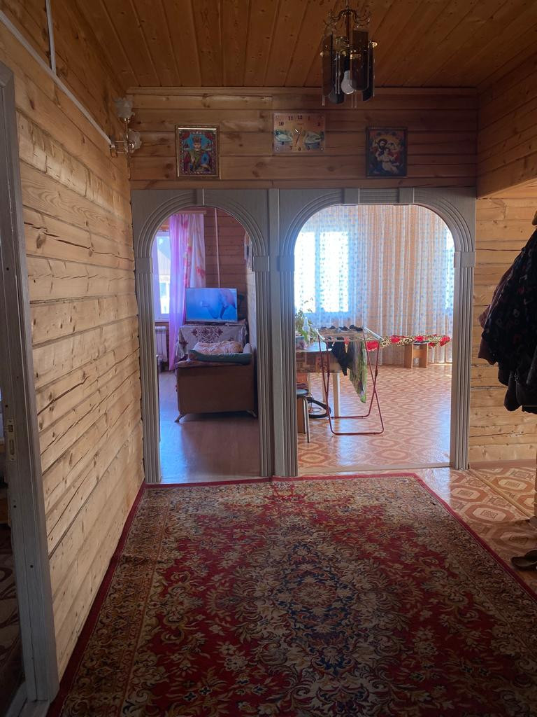 дом из бруса, обшит сайдингом, внутри вагонкой, две комнаты, кухня, санузел, веранда, есть баня во дворе, газ и вода проведены, торг уместен